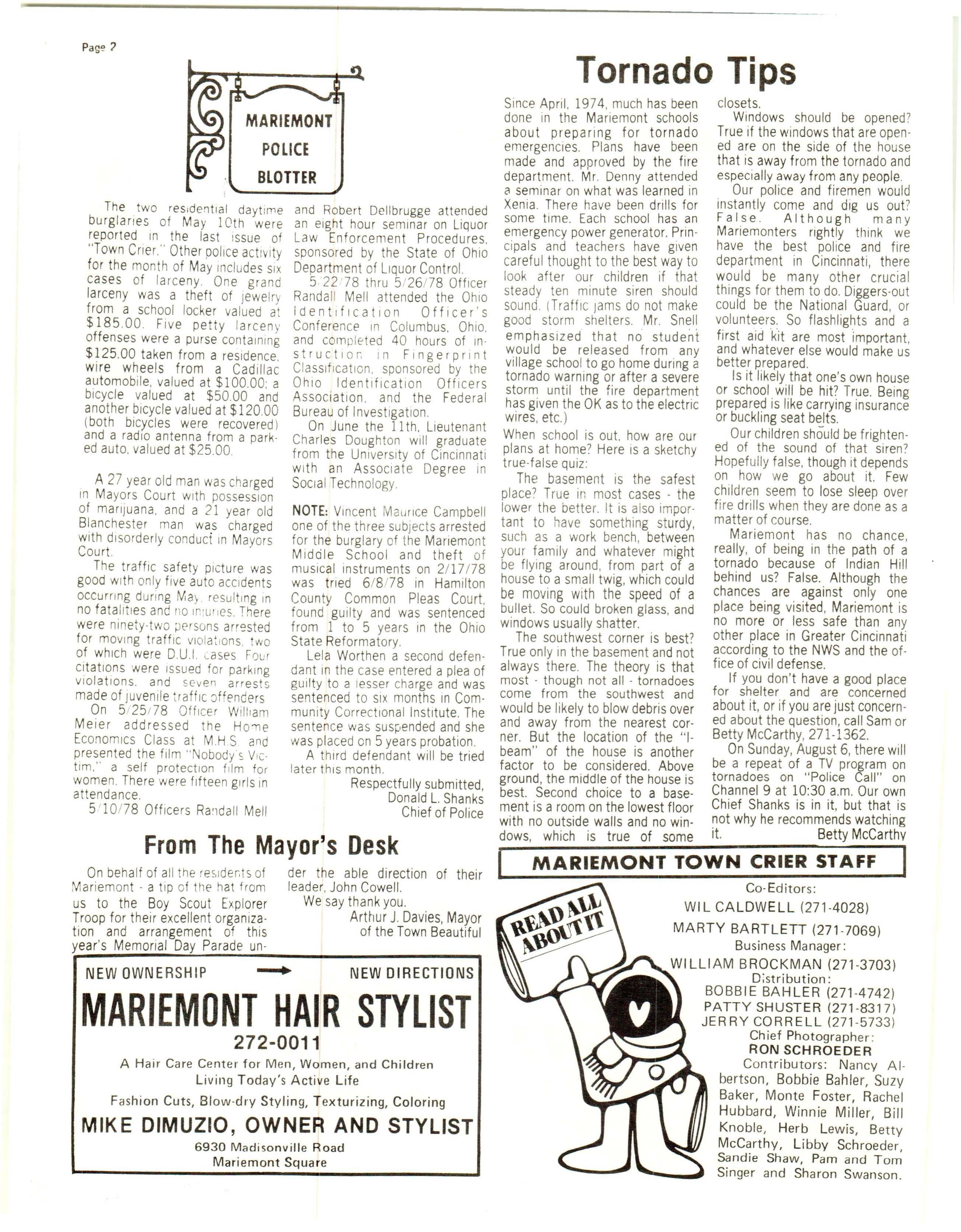 If yo u don ' t have a goo d place for shel t er an d ar e conc erned ab out it, or if yo u ar e jus t con cerned about the question , call Sa m or Bet t y McCart hy, 271-13 6 2 On Sunday, Au gust 6, ther e will be a re pea t of a TV pro gram on to rna does on " Po lice Call " on Chan nel 9 at 10:30 a m. Ou r own Chief Shanks is in it , bu t that is not why he recommends watch ing it Be tty McCa rthv