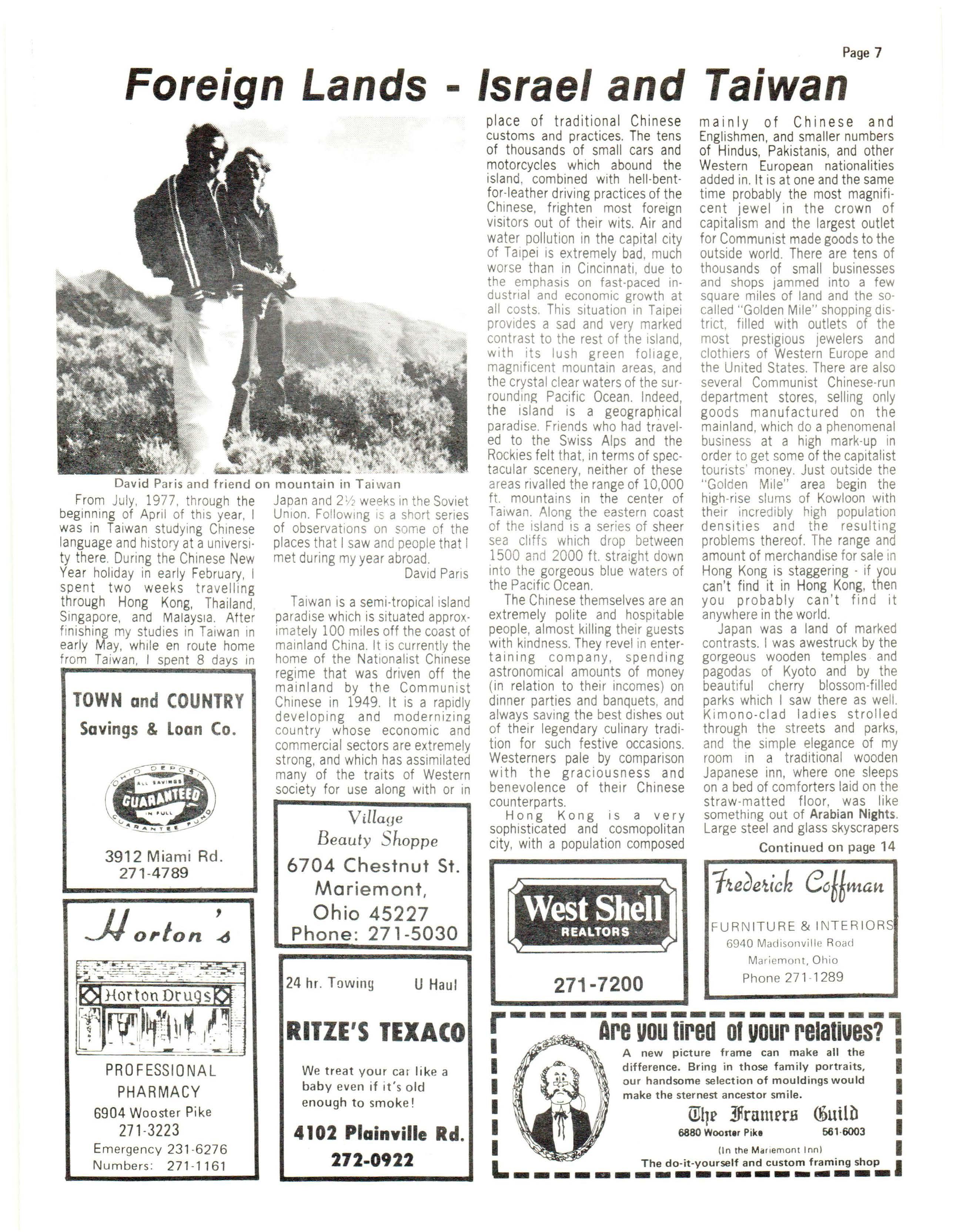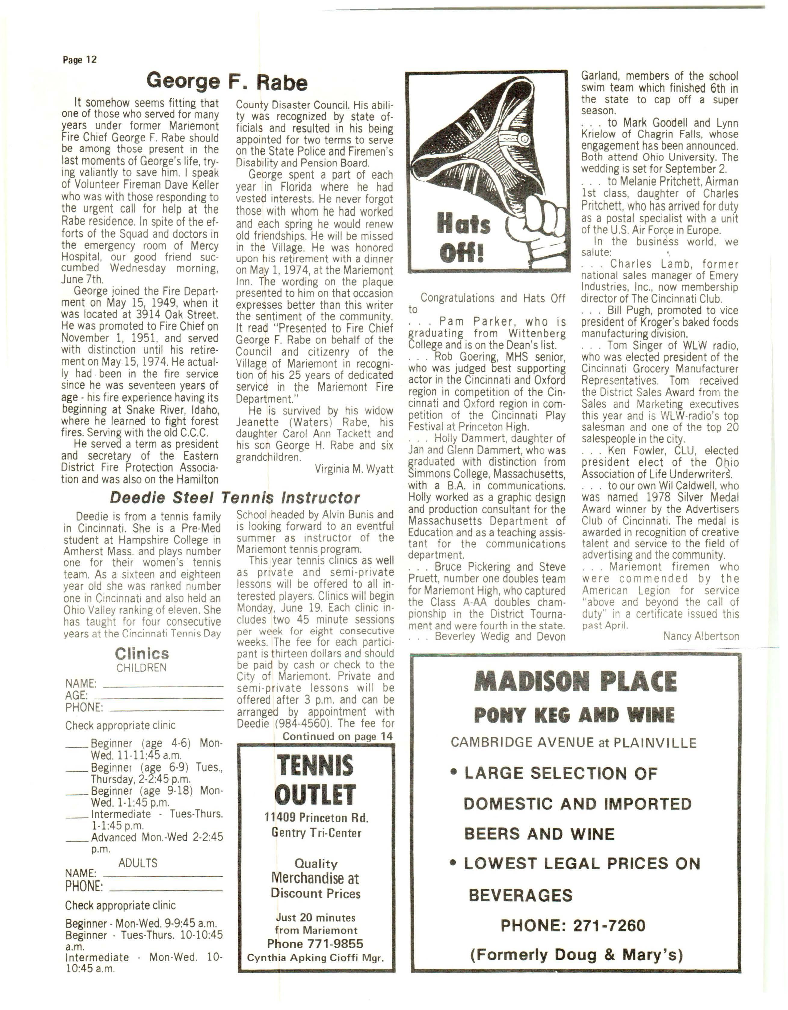You will be meetin g several new people in Mariemont this summer. Barbara and William Gangler are moving to 3741 West Street on June 19 They have one son living at home , Glen Amann , who is twenty-one and one daughter, Tracy Amann , thirteen. William is a salesman for Hensel and Associates. Barbara works for Parchman and Oyler Real Estate Sarah Ann and Willard E. Hay, Jr are now living at 7013 Rembold. Willard is a buyer at Procter and Gamble Sarah and Willard have a six month old son , Scott. They moved to Mariemont from Washington D.C. where Willard was stationed in the service Paul T. and Deborah Dietz have moved into their new home at 6635 Elm Paul teaches for the Greenh ills Schools and Deborah works at Me rcy Hospital. They have two ch ildren , Eric 5 and Heidi 4.