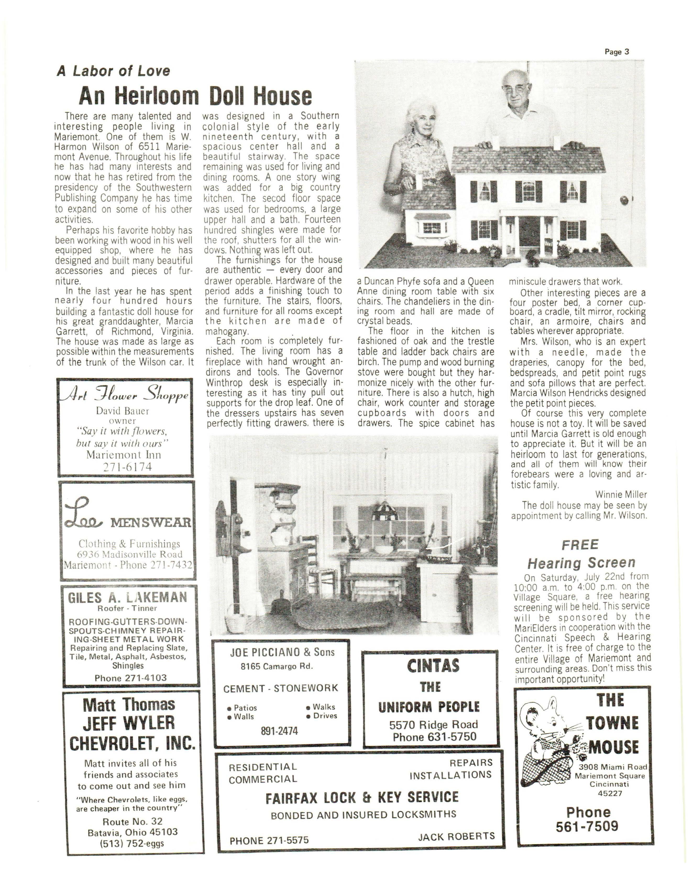 On Saturday , July 22nd from 10:00 a m. to 4 :00 p.m on the Village Square , a free heanng screening will be held. This service will be sponsored by the MariElders in cooperation with the Cincinnati Speech & Hearing Center. It is free of charge to the entire Village of Mar iemont and surrounding areas. Don 't miss this import ant opportunity!