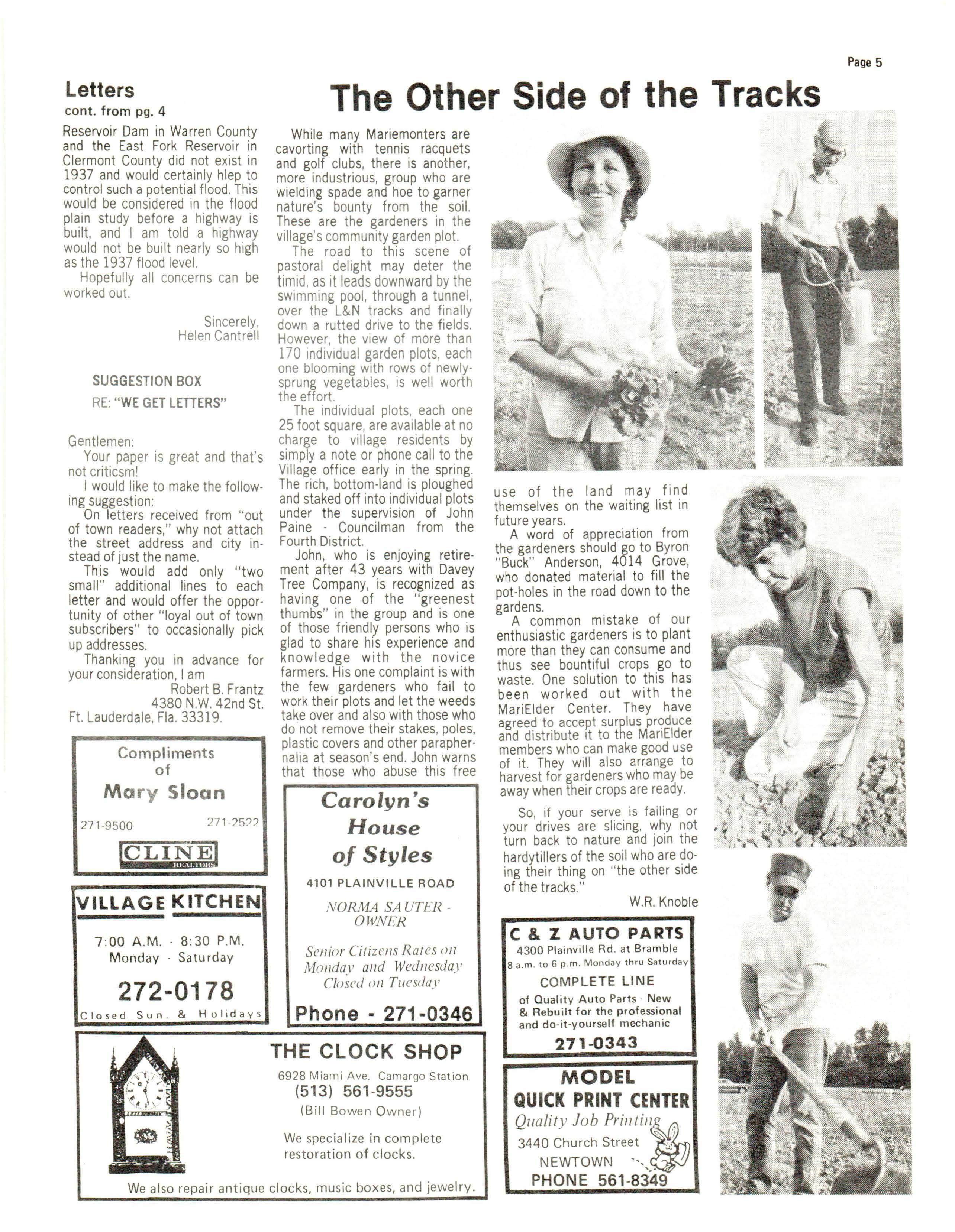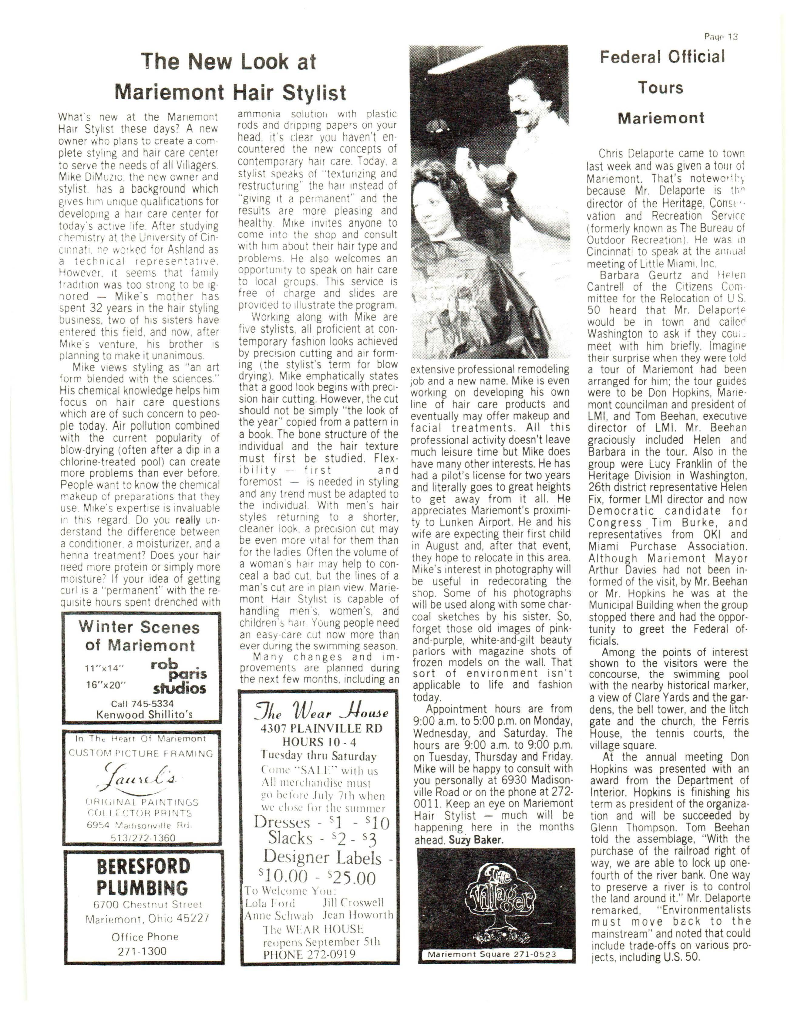 Barbara Geurtz and 1irle11 Cantrell of the Citizens Com mittee for the Relocation of U S. 50 heard that Mr. Delap orie would be in town and caller Washington to ask if they cou ; _ meet with him briefly. Imagine their surprise when they were told a tour of Mariemont had been arranged for him; the tour guides were to be Don Hopkins, Mariemont councilman and president oi LMI, and Tom Beehan , executive director of LMI. Mr. Beehan gra ciously included Helen and Barbara in the tour Also in the group were Lucy Franklin of the Heritage Division in Washington , 26 th district representative Helen Fix , former LMI director and now Democratic candidate for Congress . Tim Burke , and representatives from OKI and Miami Purchase Associat io n. Although Mariemont Mayor Arthur Davies had not been informed of the visit, by Mr. Beehan or Mr. Hopkins he was at the Municipal Bui lding when the grou p stopped t here and had the opportunity to greet the Federal officials.