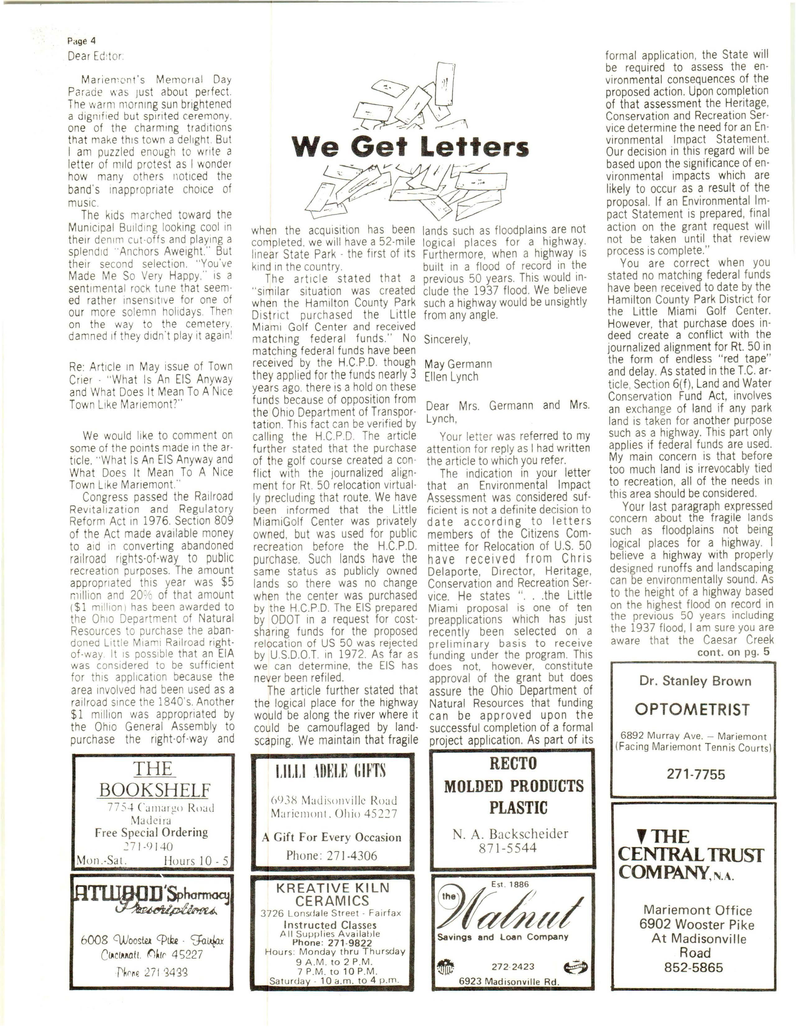 The article stated that a "simi lar situation was created when the Hamilton County Park District purchased the Little Miami Golf Center and received ma t ching federal funds." No matching federal funds have been received by the H CP.D. though they applied for the funds nearly 3 years ago there is a hold on these funds because of opposition from the Ohio Department of Transportation This fact can be verified by calling the H.CP.D The article further stated that the purchase of the golf course created a conflict with the journalized alignment for Rt 50 relocation virtually precluding that route. We have been informed that the Little MiamiGolf Center was privately owned, but was used for public recreation before the H.CP.D. purchase. Such lands have the same status as publicly owned lands so there was no change when the center was purchased by the H C.P.D. The EIS prepared by ODOT in a request for cost· sharing funds for the proposed relocation of US 50 was rejected by U S.D.O.T. in 1972. As far as we can determine, the EIS has never been refiled.
