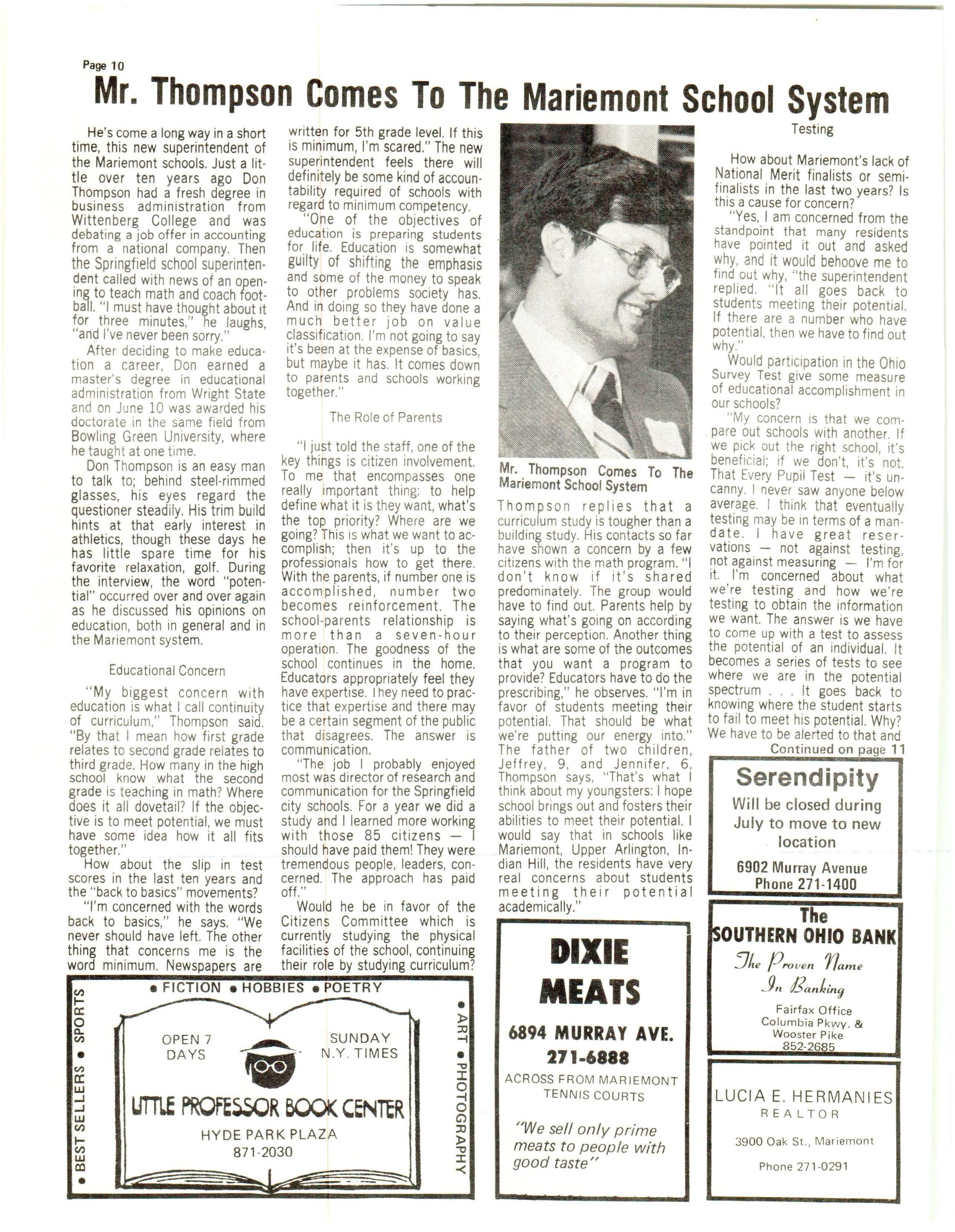 Since Apri l, 19 74, mu ch has been done in the Mariemon t schoo l s ab out pr ep ari ng for tornado em ergen cies Plans have bee n ma de and approved by th e f ire de part ment. Mr. Denny att ended se min ar on what was learned in Xenia There have been drills fo r some time. Each schoo l ha s an emer ge ncy powe r generator. Pr inci pals and tea cher s have give n careful thought t o the best way to loo k after our childre n if tha t st eady ten minute siren sh ould sou nd (T raff 1c Ja ms do not make goo d st orm sh el te r s. Mr. Snel l em phas i zed that no studen t would be released from any village schoo l to go hom e during a tornado warning or after a severe storm until the fire de par t ment has given the OK as to the el ect ric wir es, etc .)