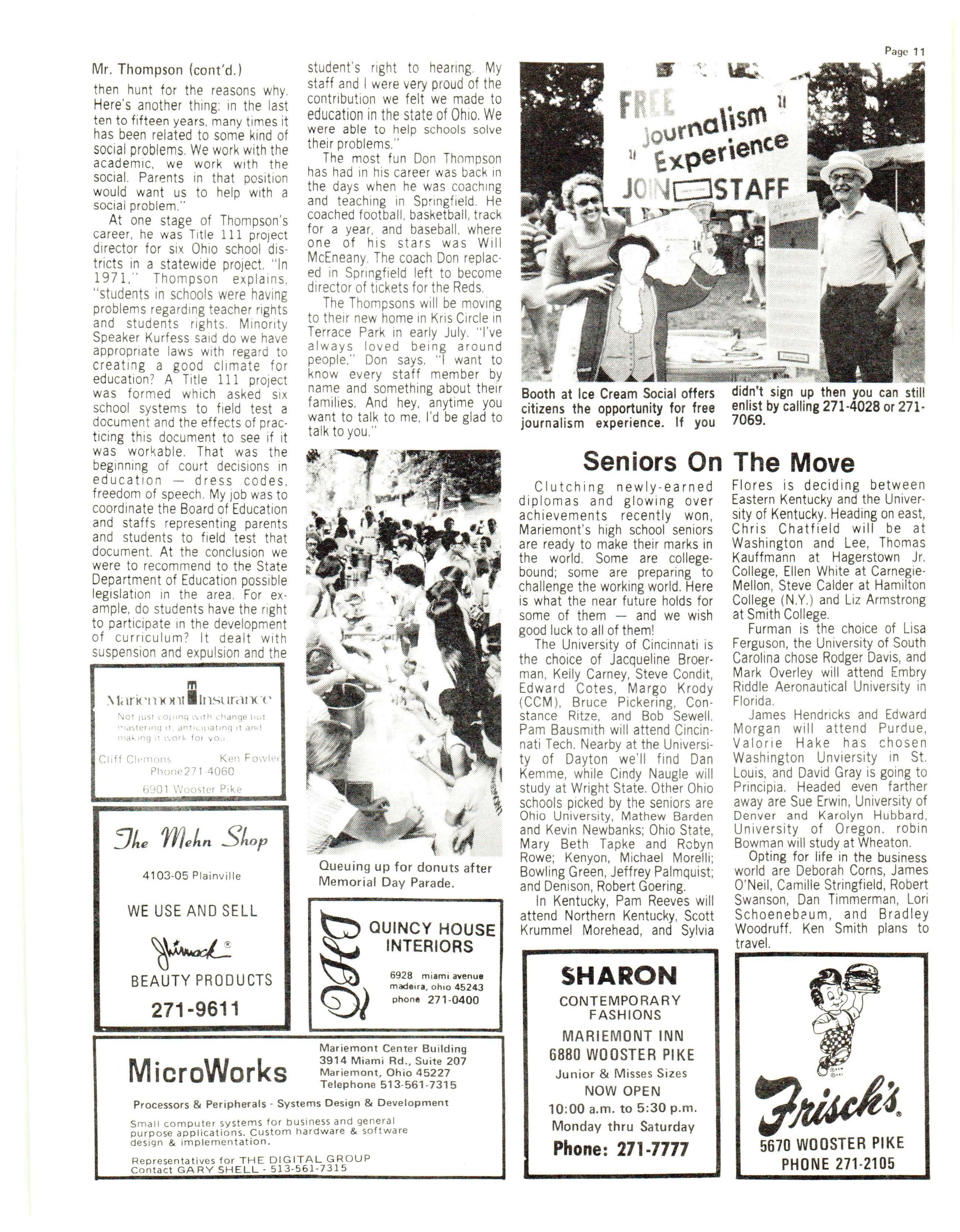 Wo rking along with Mike are five stylists, all proficient at contemporary fashion looks achieved by precision cutting and air forming (the stylist's term for blow drying). Mike emphatically states that a good look begins with precision hair cutting However, the cut should not be simply "the look of the year" copied from a pattern in a book. The bone structure of the individual and the hair texture must first be studied. Flexi bi I ity - first and foremost - Is needed in styling and an y trend must be adapted to the 1nd1v1dual. With men's hair styles returning to a shorter, cleaner look , a precision cut may be even more vital for them than for the ladies Often the volume of a woman's hair may help to conceal a bad cut. but the lines of a man ' s cut are In plain view. Mariemont Hair Stylist is capable of handling men·s. women ' s, and children's hair You ng people need an easy-care cu t now more than ever during the swimming season