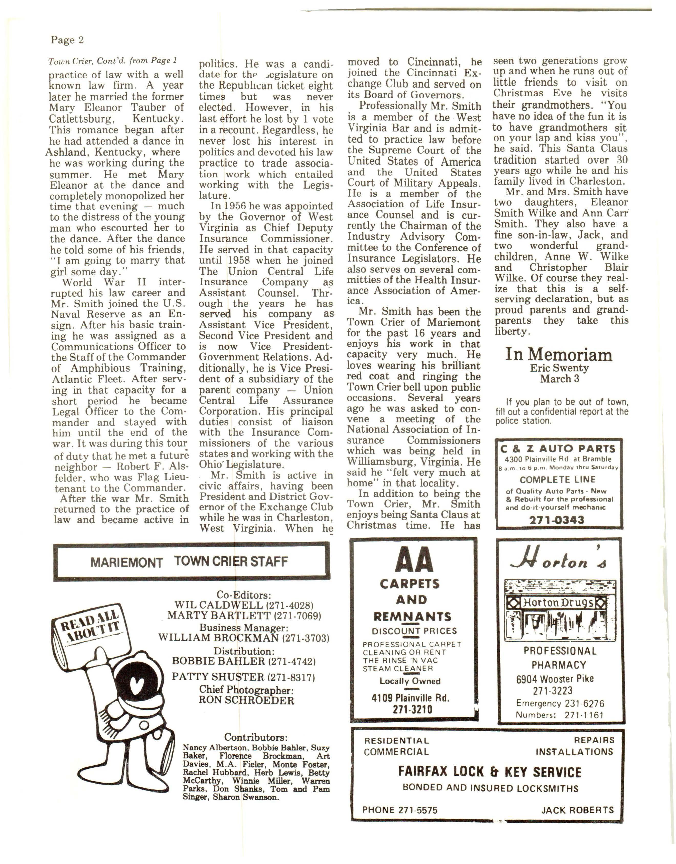 This publication, the Ralph H. Smith was born Tournaments. Law School in his senior Town Crier, is one fruit of and raised in Charleston, Other college activities year. the efforts of active mem- West Virginia. After at- consisted of being Presi- After graduation he reber s of the Village Assem- tending the public schools dent of his Fraternity , t Hrned to his home town of bly. Mari Elders also evolv- of Charleston he attended Kappa Sigma, the Inter <::harleston and entered the ed from the concerns and Washington and Lee Uni- Fraternitv Council and the continued on pal(e 2 dedication of many mem - versity in Lexington, Virbers. ginia, where he studied