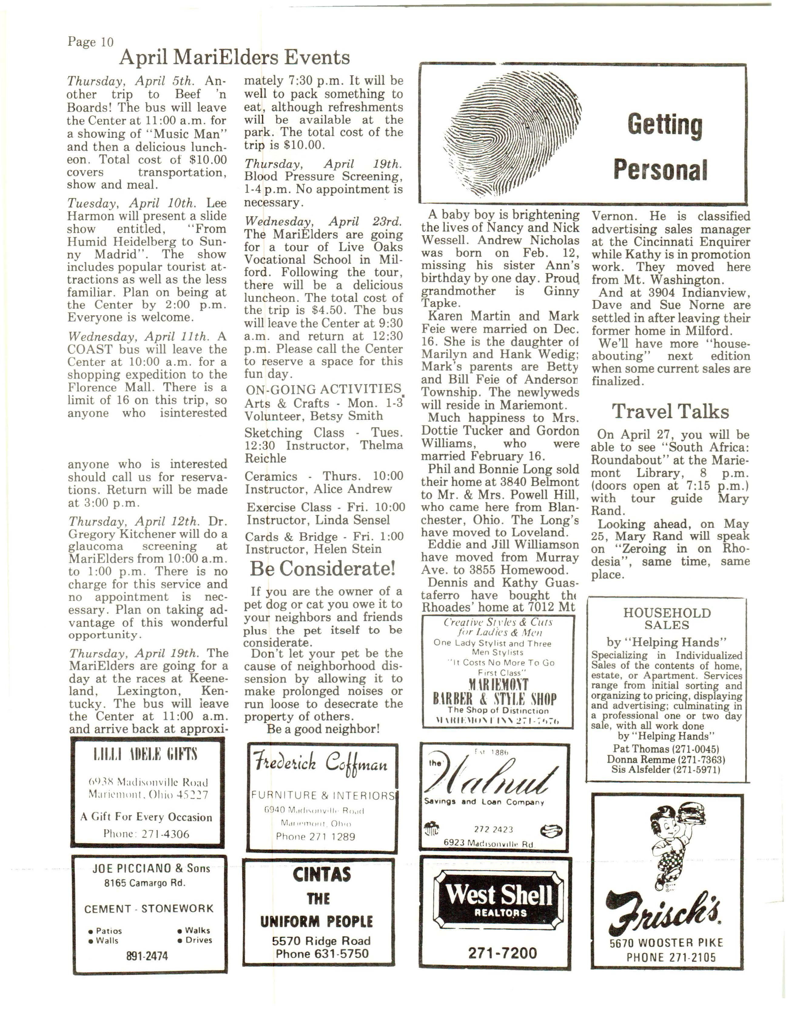 On Saturday, April 7, you fruit punch. Dinner will be Schroer (271-4036), Pat will have an opportunity, served at 7 p.m You will be Thomas (271-0045) or Mary not only to get out and see asked, when making your Knoble (271-2640). Don't your neighbors but also to reservation, to bring either delay! enjoy a delicious home - a meat casserole, salad, or There will be a cost of cooked meal plus being dessert to serve 10-12 $1.50 per person to pay for entertained by the talented people if you are a couple or such incidentals as coffee, Mariemont High School a dish to serve eight, if you tea, rolls and butter, with Breakfast Club. are single. whatever remains going to
