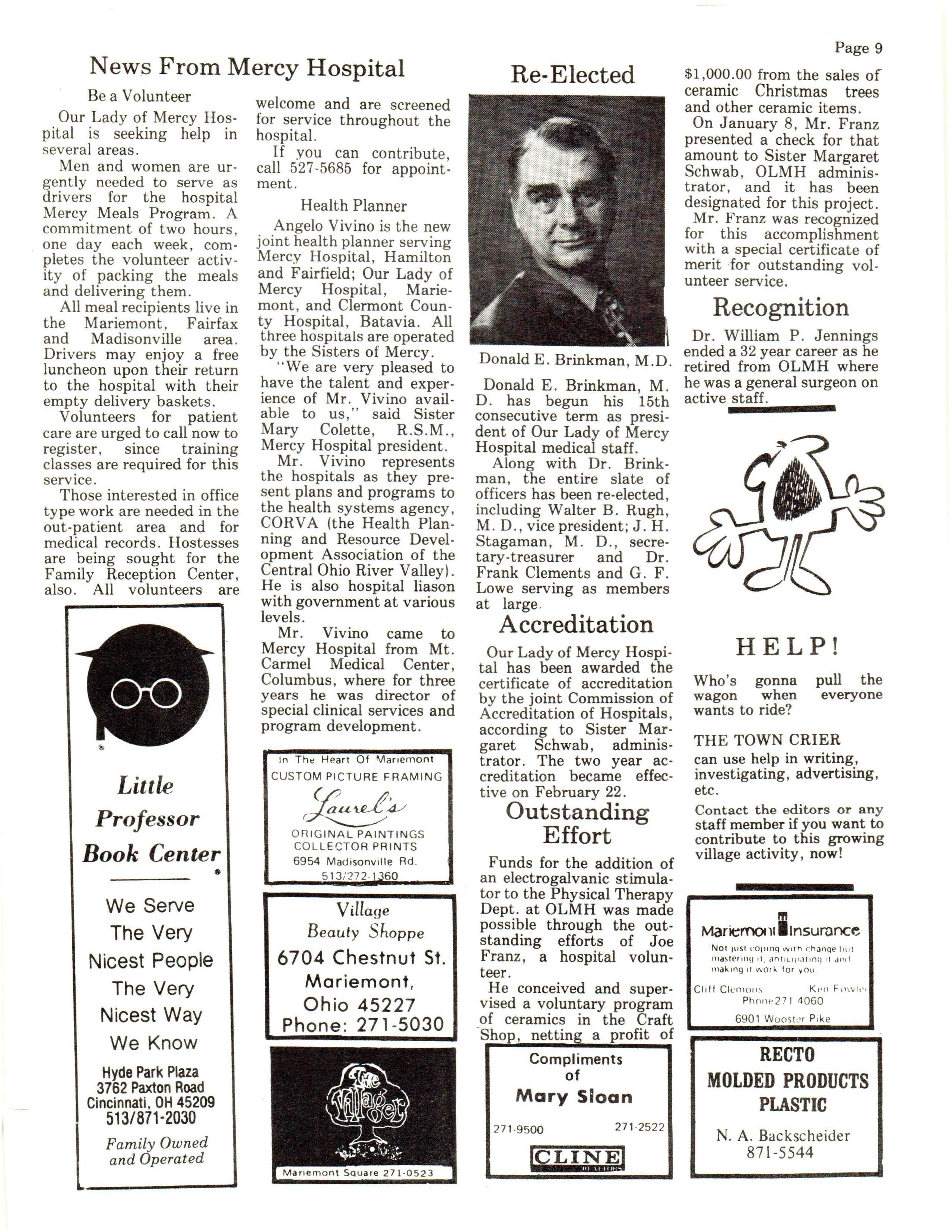Bob_bie ~nd Sta1_1 Bahler Stan is usually pressed into h_as hved m the village for service to help with the six years now ~d ha:ve task. 7000 copies go to bec<?me very active m its Patty Shuster who is in affairs . Stan works for charge of delivery in her Procter and Gamble during part of town and also to all the day, but his free time business establishments on has been devoted to village the square. Nancy Albertgovernment as Clerk of the son delivers to the Oak Village . Bobbie is trained Street businesses . The deas an elementary school livery boys assemble the teacher and worked in this papers in an hour or so and capacity for eight years. then take about two hours She curre~tly works in for delivery to the houses learning d1sab1bty , tutor - on their routes . Bobbie ing two mornings each mails about 30 copies to week at Anderson Middle people who have moved School. Their daughter, from Mariemont . Em~y , will be three years Bobbie currently needs old m !vfay · two new carriers. She can ~obbie has been m_volved use either boys or girls from with the Town Cner for the 5th or 6th grades. Older over a year · children would also be acAs circulation mane1- ceptable. ger, she supervisesldelivery Bobbie will familiarize each of the newspaper along 11 new carrier with the delivroutes She recently sue- erv route. If there are any ceeded in obtaining a raise problems of delivery, call for the carriers· from a base either Bobbie or Patty unit pay of $ 3 .oo to $3 75 Bobbie says that Dell per delivery · In order to Stringfield deserves a lot of make the job more equit- credit for the work she did able, the carriers get $.25 in the beginning. Jerry for each paper delivered Correll also helped for a p:[ty 1 §:huster has been long time with the distrivalued associate in devising bution. Rachel Hubbard alternate routes. 11 C) When the Town Crier 1s Ari :Jfower ..:)hoppi! printed, Bobbie picks ur, Da v id Bauer the paper 1 un int: pru,~r own e r and takes it home for "Say it with flowers , compilation. She usually but sav it with vurs" gets around 2000 copies Mariemont Inn and turns her living room 2 71 - 61 7 4 into a counting fac.t.n,.,,
