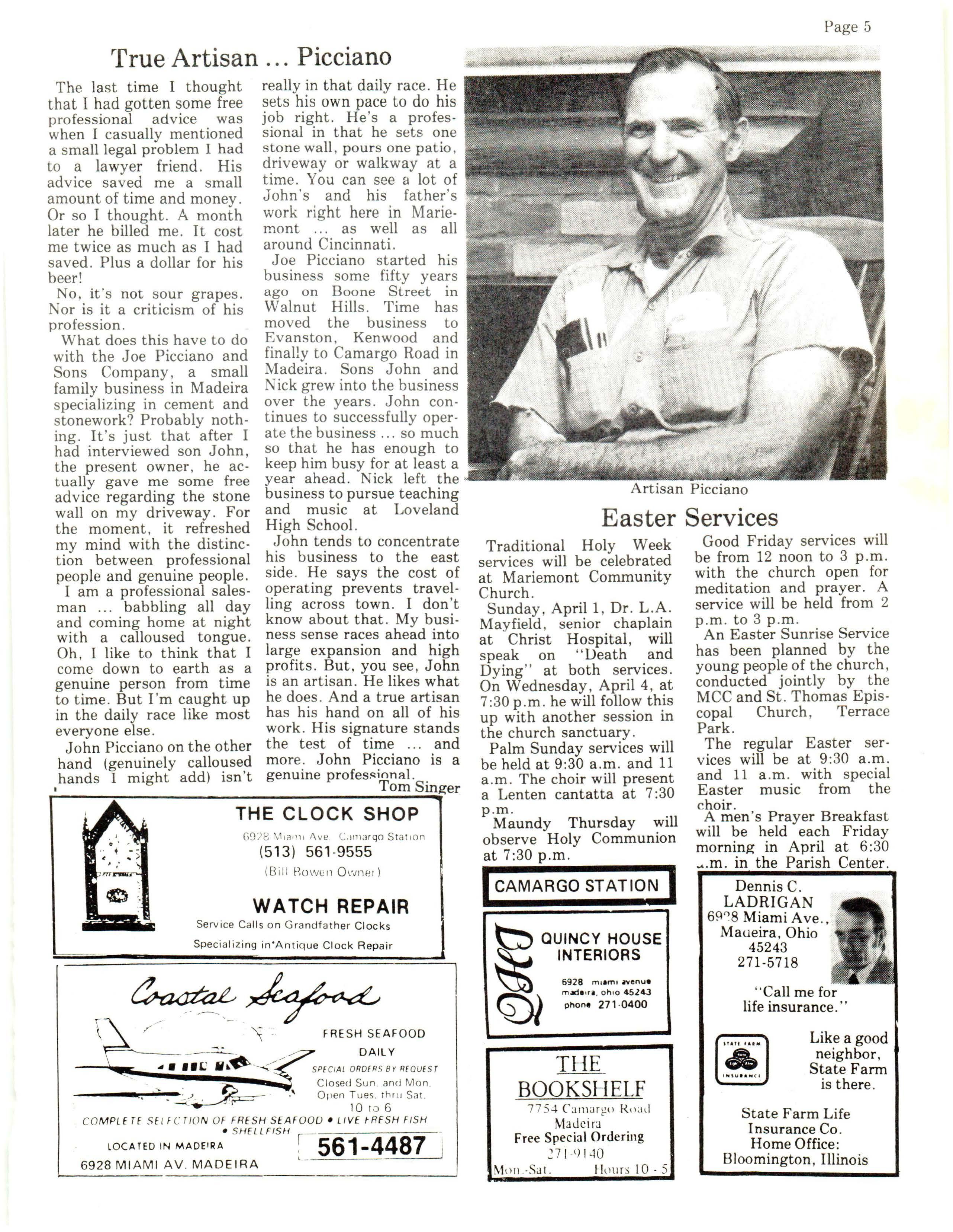 What does this have to do with the Joe Picciano and Sons Company , a small family business in Madeira s pecia li zing in cement and s tonework? Probably nothing. It ' s j u st that after I had interviewed son John, the present owner, he actua lly gave me some free advice regarding the stone wall on m y driveway. For the moment , it refreshed my mind with the distinction between professional people and genuine people. I am a professional salesman babbling all day and coming home at night with a calloused tongue. Oh , I like to think that I come down to earth as a genuine pe r son from time to time. But I'm caught up in the daily race like most everyone else