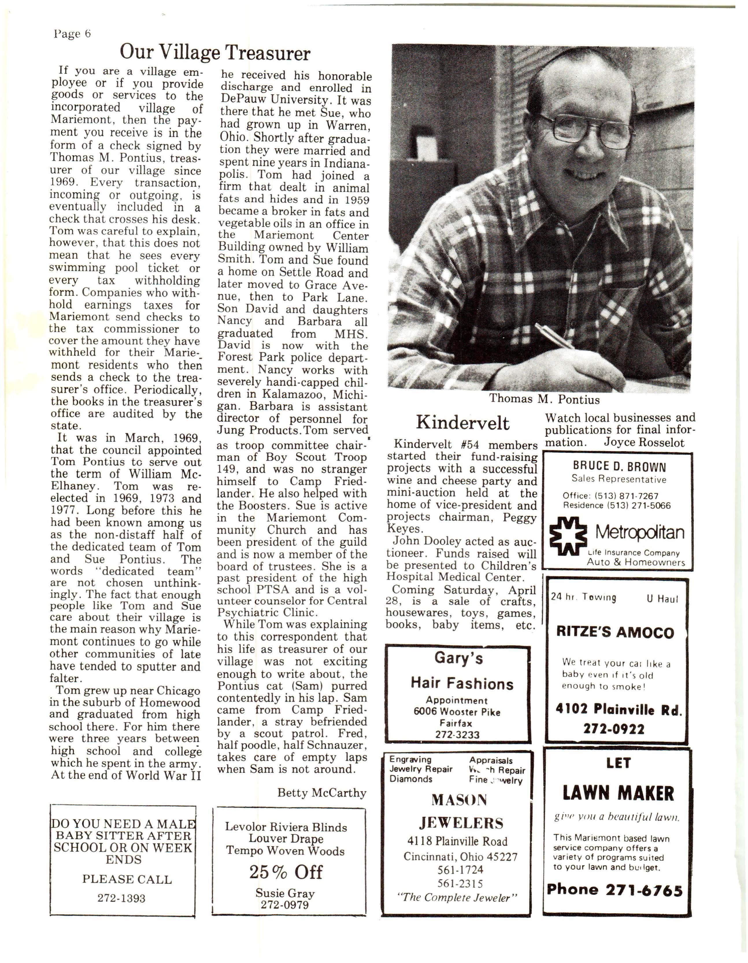 he received his honorable discharge and enrolled in DePauw University. It was there that he met Sue, who had grown up in Warren, Ohio . Shortly after graduation they were married and spent nine years in Indianapolis. Tom had joined a firm that dealt in animal fats and hides and in 1959 became a broker in fats and vegetable oils in an office in the Mariemont Center Building owned by William Smith Tom and Sue found a home on Settle Road and later moved to Grace Avenue, then to Park Lane Son David and daughters Nancy and Barbara all graduated from MHS. David is now with the Forest Park police department. Nancy works with severe ly handi-capped children in Kalamazoo, Michigan . Barbara is assistant director of personnel for Jung Products. Tom served, as troop committee chairman of Boy Scout Troop 149 and was no stranger him 1 self to Camp Friedlander. He also helped with the Boosters . Sue is active in the Mariemont Community Church and h_as been p r esident of the guild and is now a member of the board of trustees. She is a past president of the high school PTSA and is a volunteer counselor for Central Psychiatric Clinic While Tom was explammg to this correspondent that his life as treasurer of our village was not exciting enough to write about, the Pontius cat (Sam) purred contentedly in his lap. Sam came from Camp Friedlander, a stray befriended by a scout patrol. Fred, half poodle, half Schnauzer , takes care of empty laps when Sam is not around .