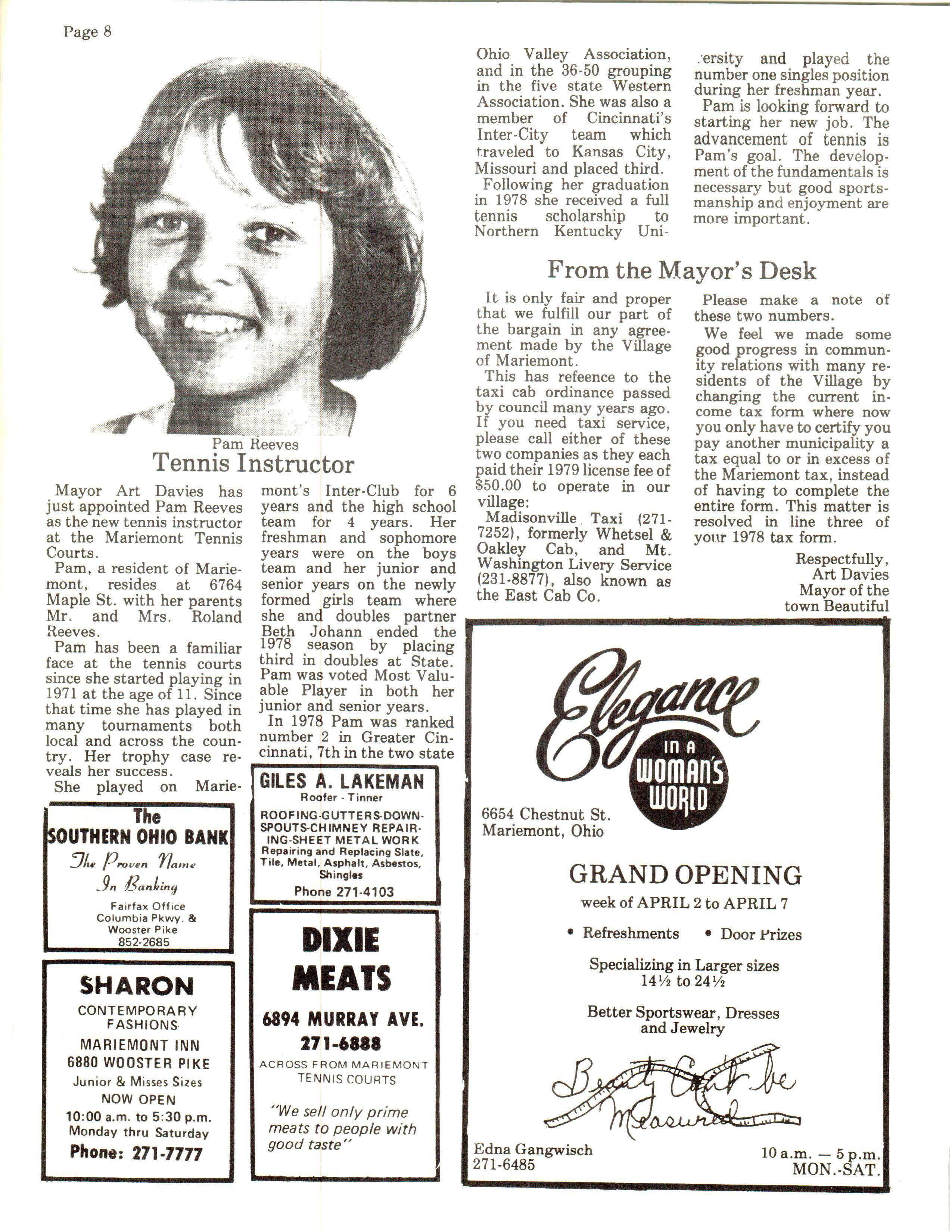 It was in March, 1969, that the council appointed Tom Pontius to serve out the term of William McElhaney. Tom was reelected in 1969 , 1973 and 1977. Long before this he had been known among us as the non-distaff half of the dedicated team of Tom and Sue Pontius The words " dedicated team " are not chosen unthinkingly. The fact that enough people like Tom and Sue care about their village is the main reason why Mariemont continues to go while other communities of late have tended to sputter and falter.