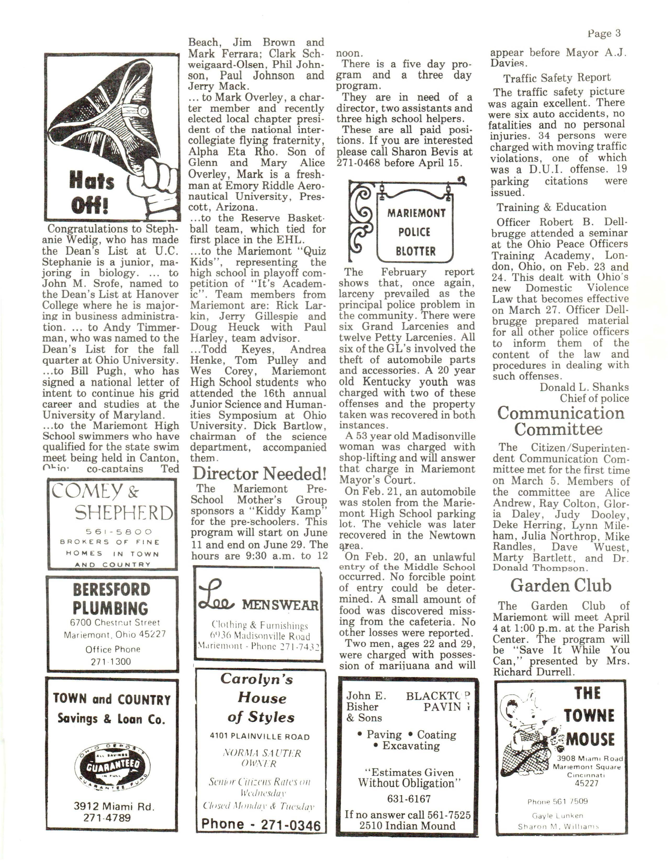 Congratul a tions to Stephanie W edig, who has made the Dean's List at U.C. Stephanie is a junior, majoring in biology. to John M. Srofe, named to the Dean's List at Hanover College where he is majoring in business administration to Andy Timmerman, who was named to the Dean's List for the fall quarter at Ohio University. to Bill Pugh, who has signed a national letter of intent to continue his grid career and studies at the University of Maryland. to the Mariemont High School swimmers who have qualified for the state swim meet being held in Canton, 0Lin· co-caotains Ted