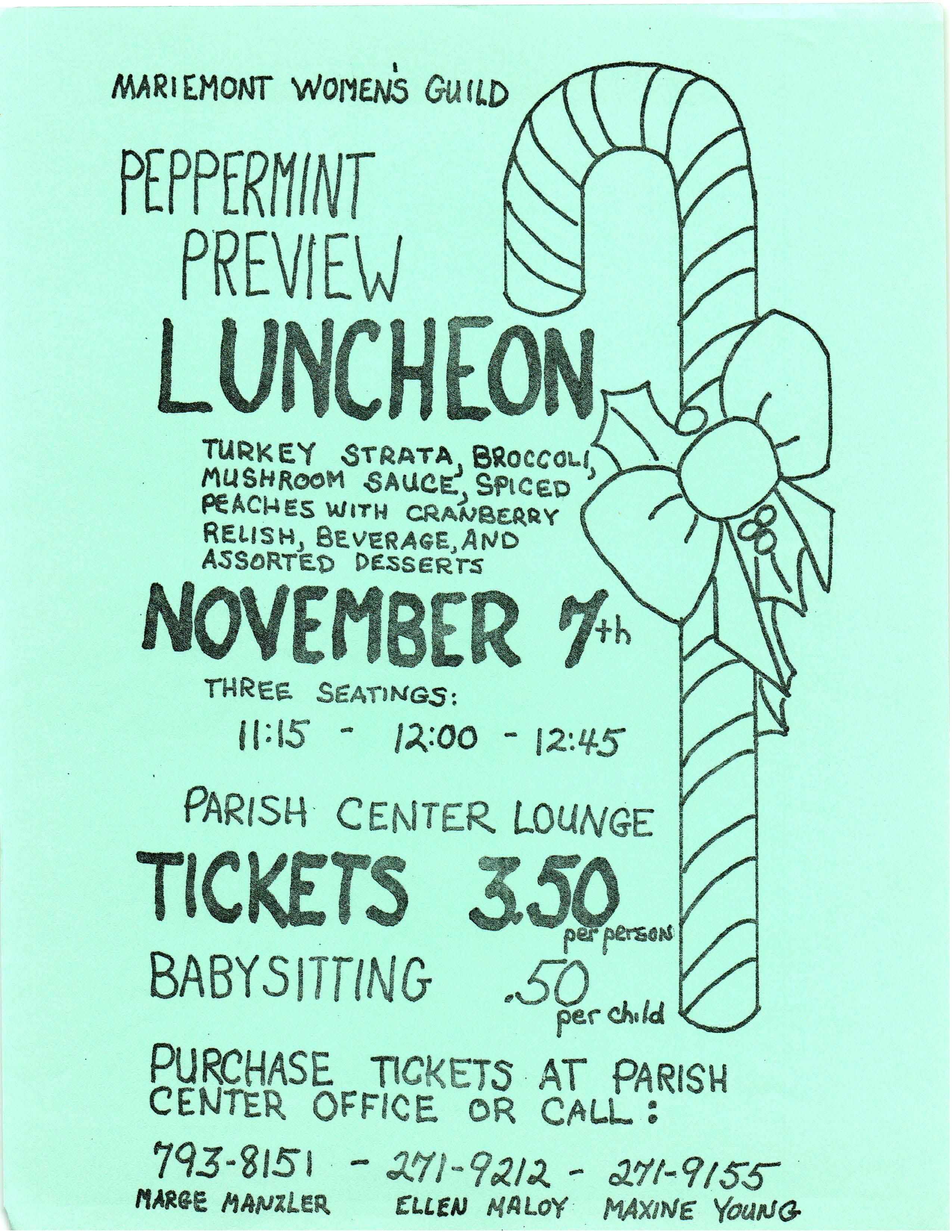 check your shopping lists. This year the cuisine includes Turkey Strata, with mushroom sauce, broccoli, salad, dessert, coffee, or t ea, all for $3 . 50 Three seatings for luncheon are 11:15 a.m. to 12:00; 12:00 to 12:45 p m and 12:45 p.m. to I :30 p m For reservations please call Marge Manzler at 793-8151 or any Guild member. Baby sitti ng is available during this time at 50¢ per child. Make plans now to come with friends and enjoy. The date to remember is Wednesday, November 7, 11 a.m. to 7 p.m .