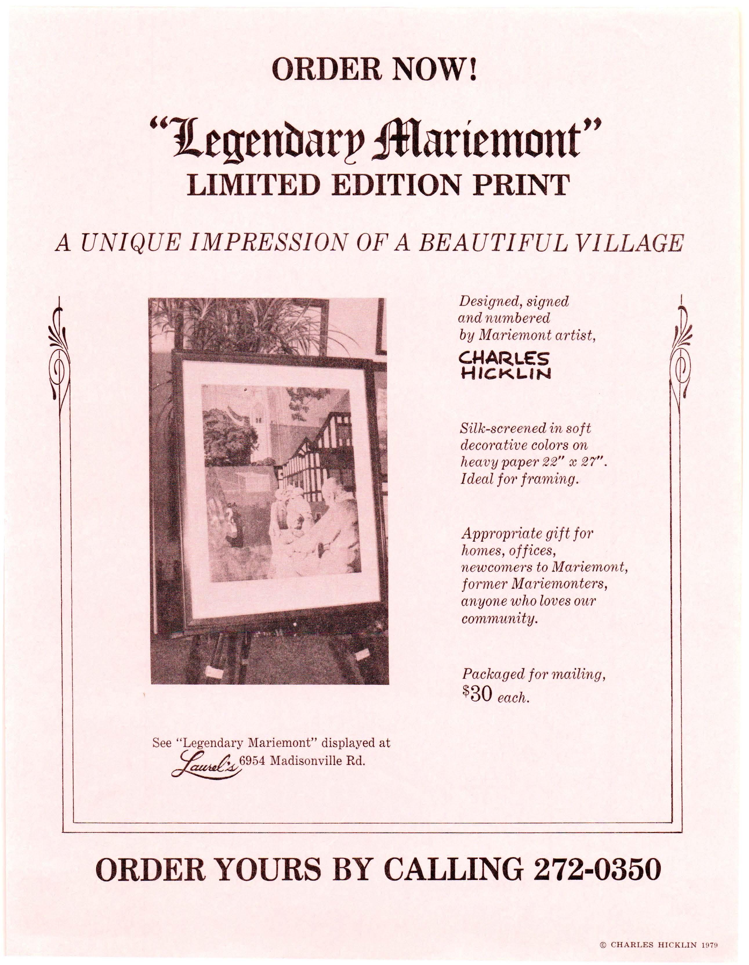 Designed, signed and num bered by Mariemont artist, C.MARLES HICKLIN