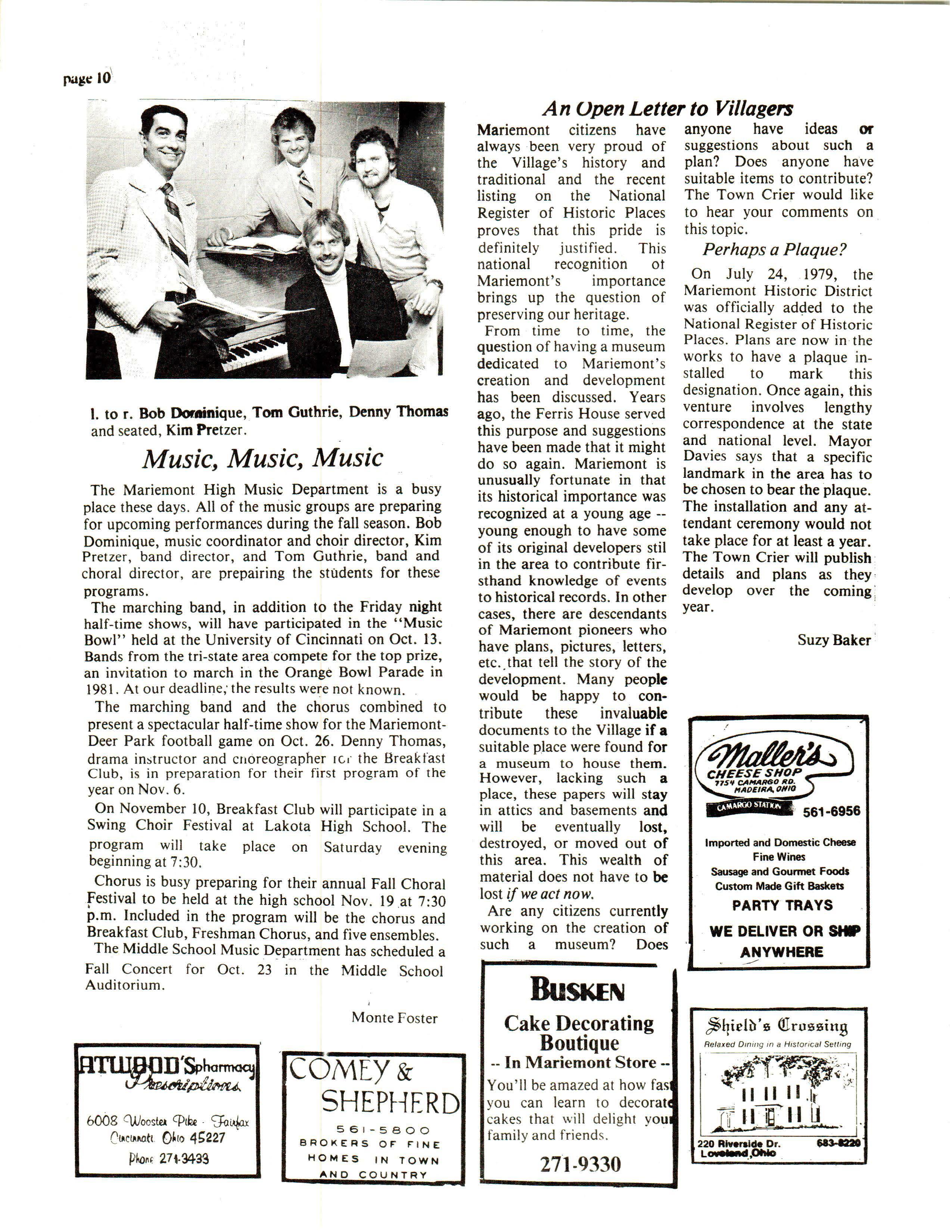 Mariemont citizens have anyone have ideas or alwa ys ·been very proud of suggestions about such a the Village's history and plan? Does anyone ha ve traditional and the recent suitable items to contribute? listing on the National The Town Crier would like Register of Historic Places to hear your comments on proves that this pride is this topic definite ly j ustified This Perhaps a Plaque? nation al recognition ot Mariemont's importa nce brings up the question of preserving our heritage.