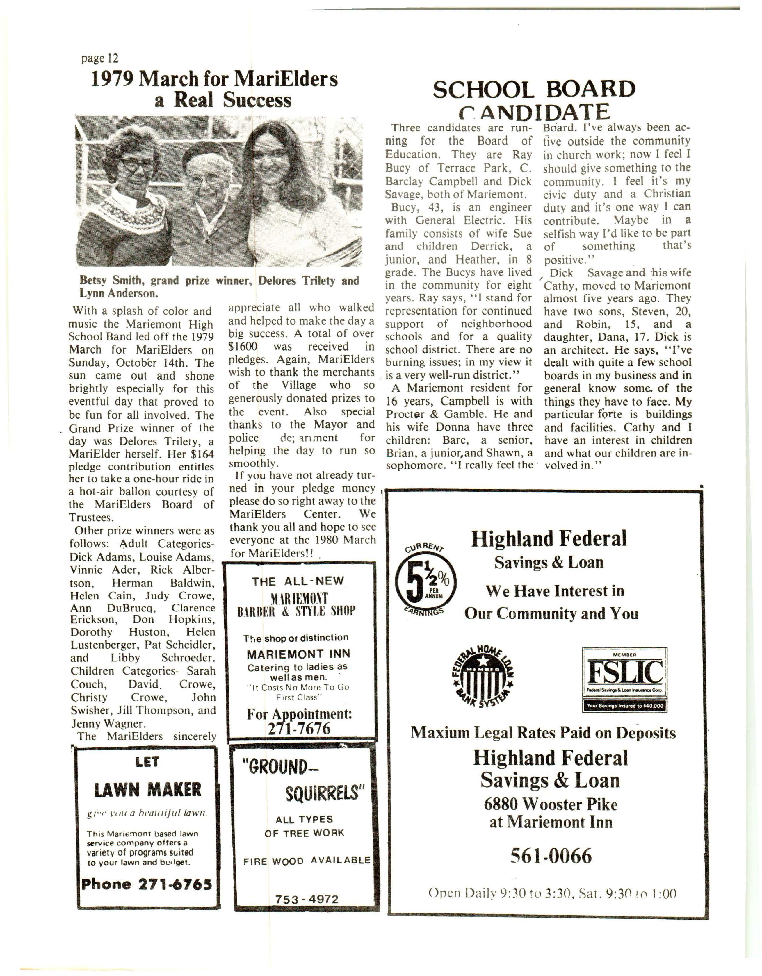 With a s pla sh of color and music the Mariemont High School Band led off the 1979 March for MariElders on Sunda y, October 14th. The sun came out and shone brightl y especially for this eventful day that proved to be fun for all involved. The Grand Prize winner of the day was Delores Trilety, a MariElder her se lf. Her $164 pledge contribution entitles her to take a one-hour ride in a hot -air ballon courtesy of the MariElders Board of Trustees .