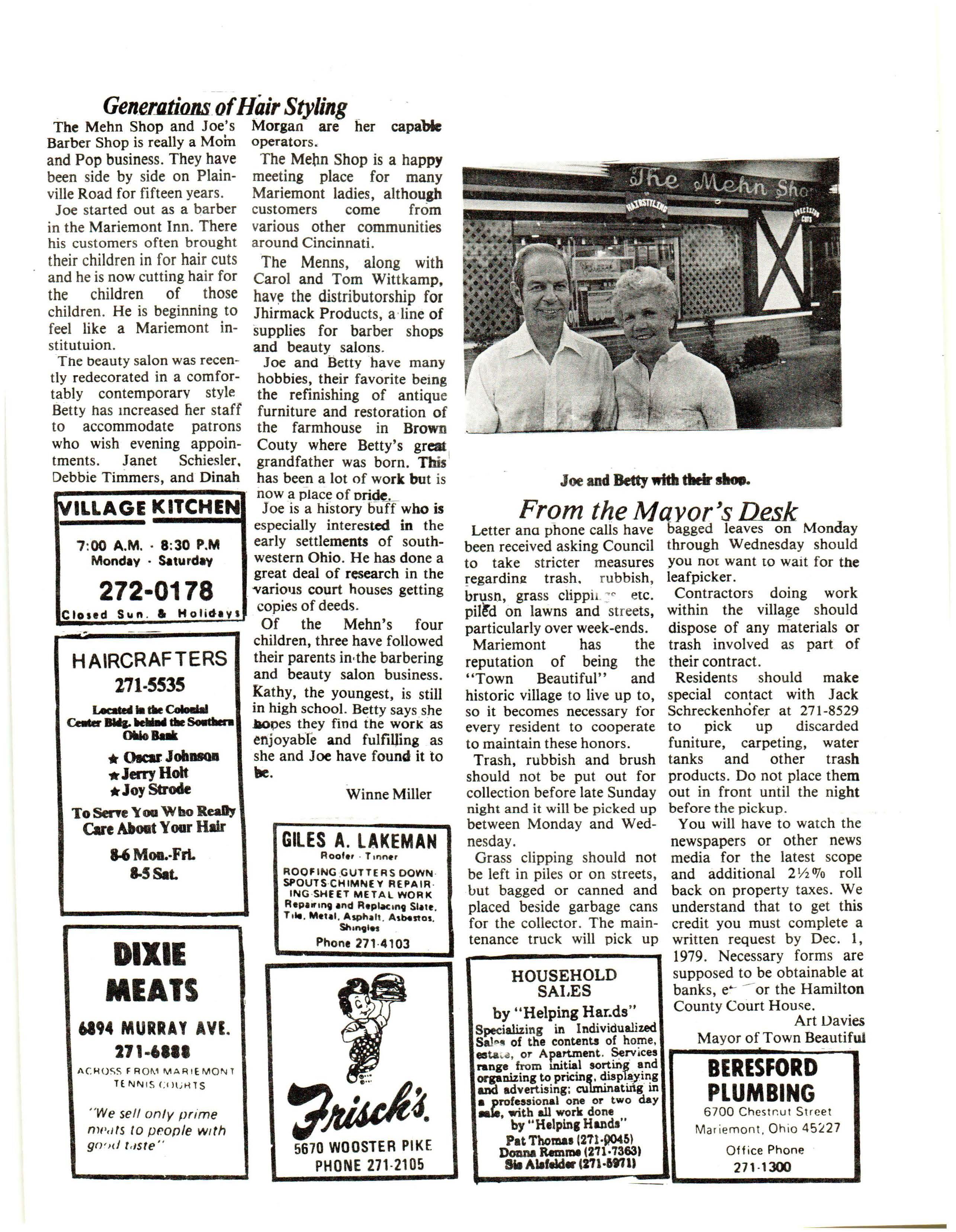 The Mehn Shop and Joe's Morgan are her capable Barber Shop is really a Moin operators and Pop business . They have The Melin Shop is a happy been side by side on Plain- meeting place for many ville Road for fifteen years. Mariemont ladies, although Joe started out as a barber customers come from in the Mariemont Inn . There vari ous other communities his customers often brought arou nd Cincinnati. their children in for hai r cuts The Menns, along with and he is now cutting ha ir for Carol and Tom Wittkamp, the chil dren of those have the distributorship for children. He is beginning to Jhirm ack Produ cts, a line of feel like a Mariemont in- supplies for barber shops stitutuion. and beauty salons