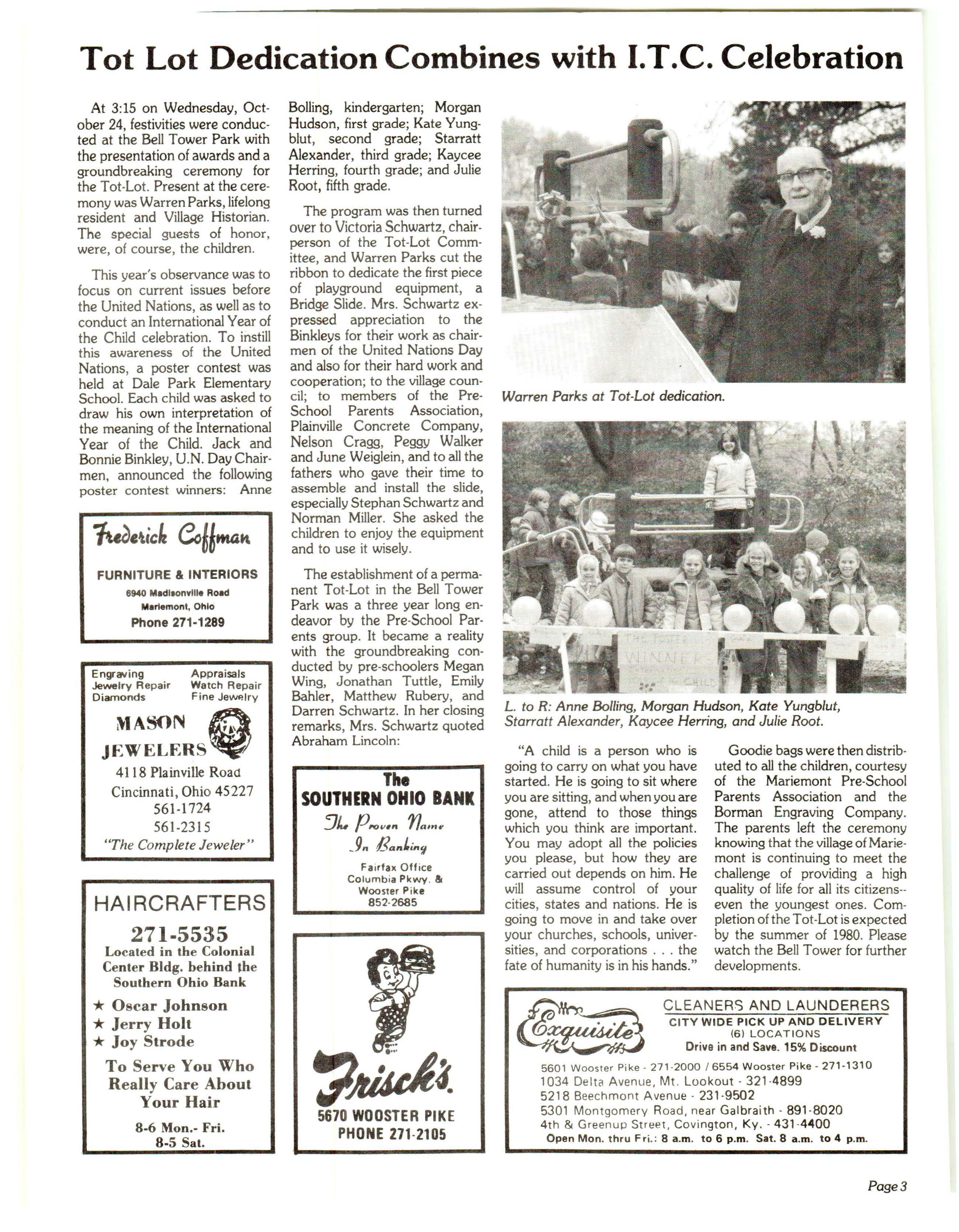 At 3:15 on Wedn e sd ay , Octobe r 24 , fest ivities were conducted at the Be ll Towe r Park with the presen tation o f awards and a gro undbrea k ing cere mon y fo r the Tot -Lot. Present at t he c e remony was Warren Par ks, lifelong resident and Village Historian The spec ial guests of honor , were , o f c ou rse , the children .