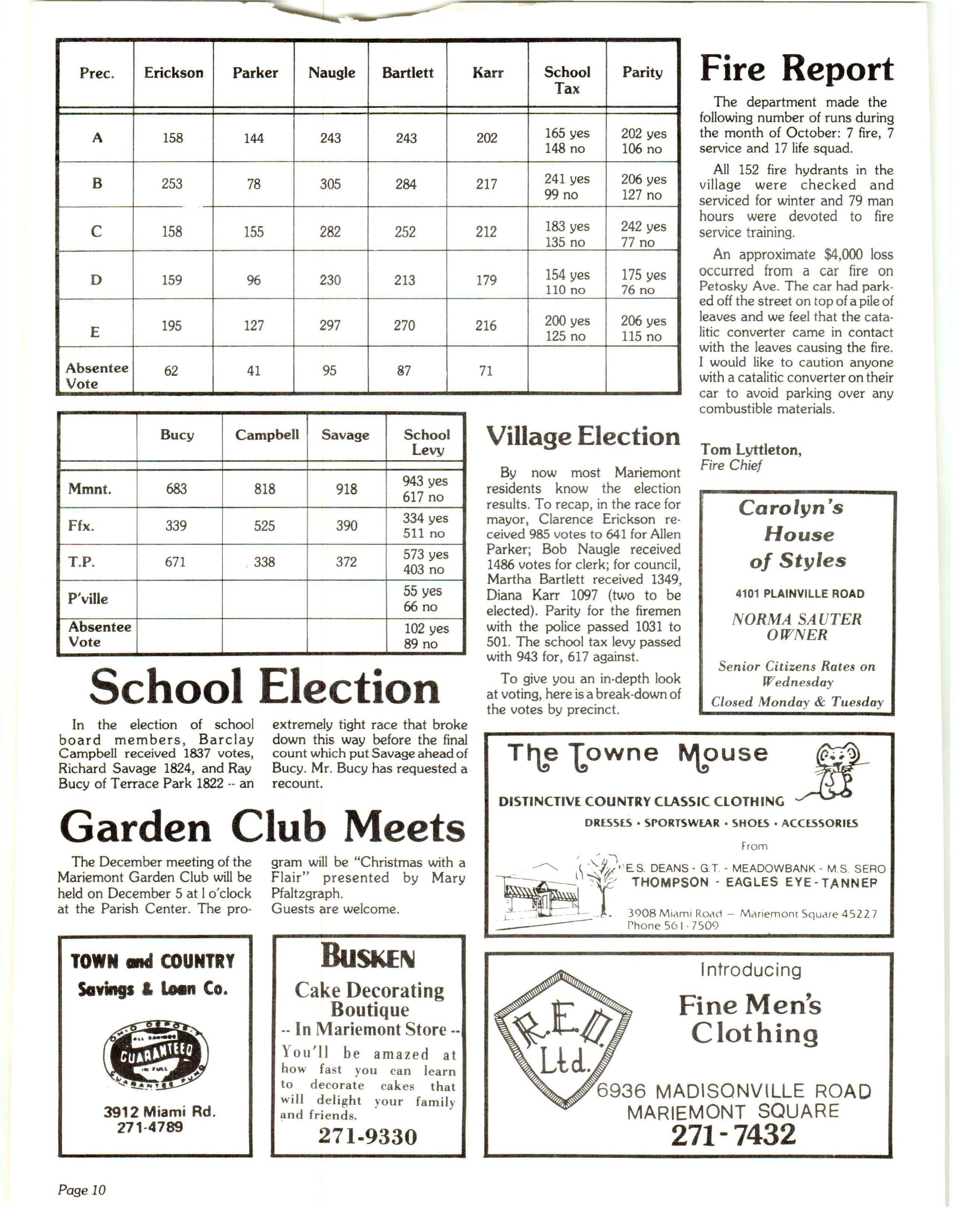 By now most Mariemont residents know the election results To recap , in the race for mayor , Clarence Erickson received 985 votes t o 641 for Allen Parker ; Bob Naugle received 1486 votes for clerk ; for council , Martha Bartlett rece ived 1349, Diana Karr 1097 (two to be elected) Parity for the firemen with the police passed 1031 to 501. The school tax levy passed with 943 for, 617 against.