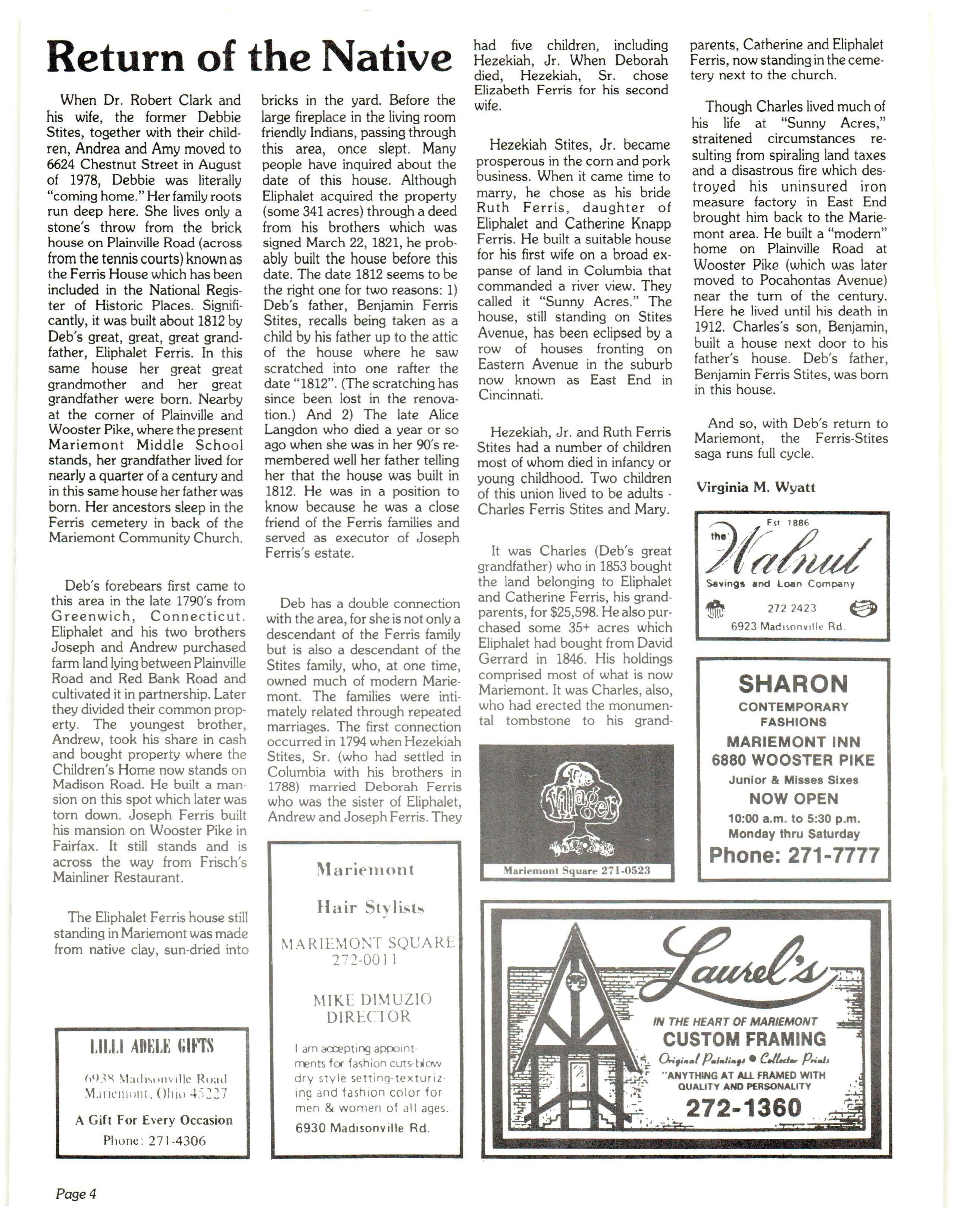 When Dr. Robert Clark and his wife, the former Debbie Stites, together with their ch ildren, Andrea and Amy moved to 6624 Chestnut Street in August of 1978, Debbie was literally "coming home " Her family roots run deep here. She lives only a stone's throw from the brick house on Plainville Road (across from the tennis courts) known as the Ferris House which has been included in the National Register of Historic Places Significantly, it was built about 1812 by Deb's great , great , great grandfather , Eliphalet Ferris In thi s same house her great great grandmother and her great grandfather were born. Nearby at the corner of Plainville a n d Wooster Pike, where the prese nt Mariemont Middle Scho o l stands , her grandfather li11ed for nearly a quarter of a century and in this same house her father was born Her ancestors sleep in the Ferris cemetery in back of the Mariemont C ommunity Church.