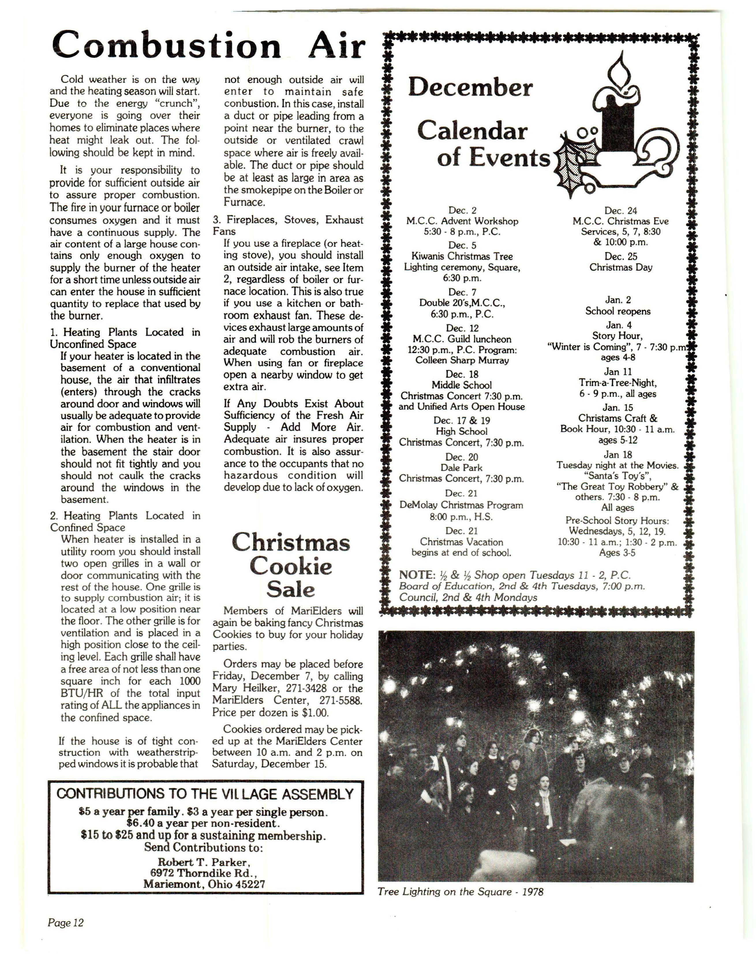 Christmas is a time to st a rt n e w trad itions, too. La s t year's C h ristmas Walk a rra nge d by Mar iem ont merc h ants was a fes tive o cca s ion. Th e ir c oord in a te d dec o ra t ion s adde d to the holida y scen e and th e walk is sc h edul e d a ga in this ye a r. The Village is rich in tra d itions as pub lic as th e Ch r ist mas Tree Bo nfire-- o r as personal as a heaping pl a te of G randm a 's spec ia l cook ies