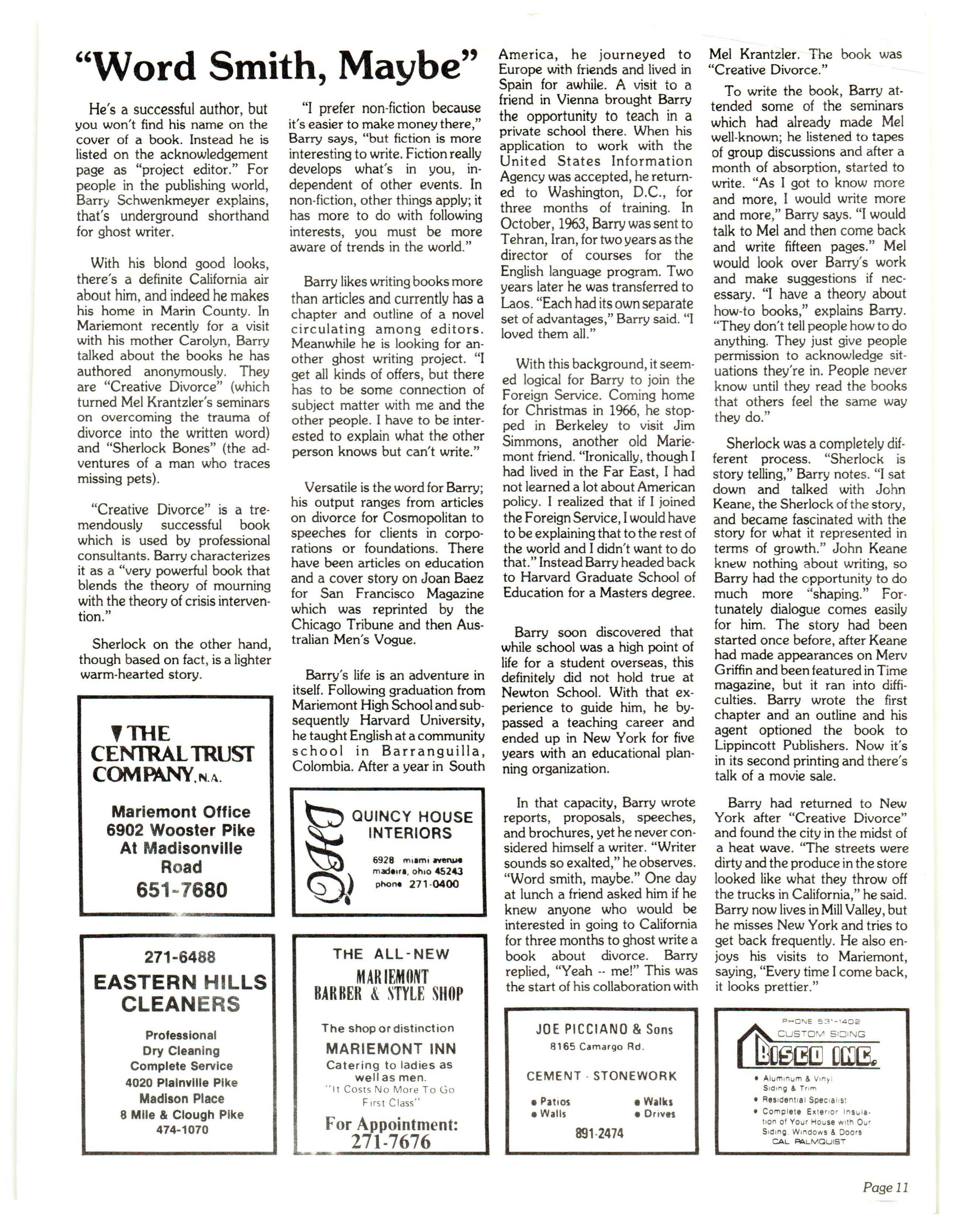 With his blond good looks, there's a definite California air about him, and indeed he makes his home in Marin County . In Mariemont rec ent ly for a visit with his mother Carolyn , Barry talked about the books he has authored anonymously They are "Crea tive Divorce" (which turned Mel Krantzler's seminars on overcoming the trauma of divorce into the written word) and "She rlock Bones" (the adventu res of a man who traces missing pets).