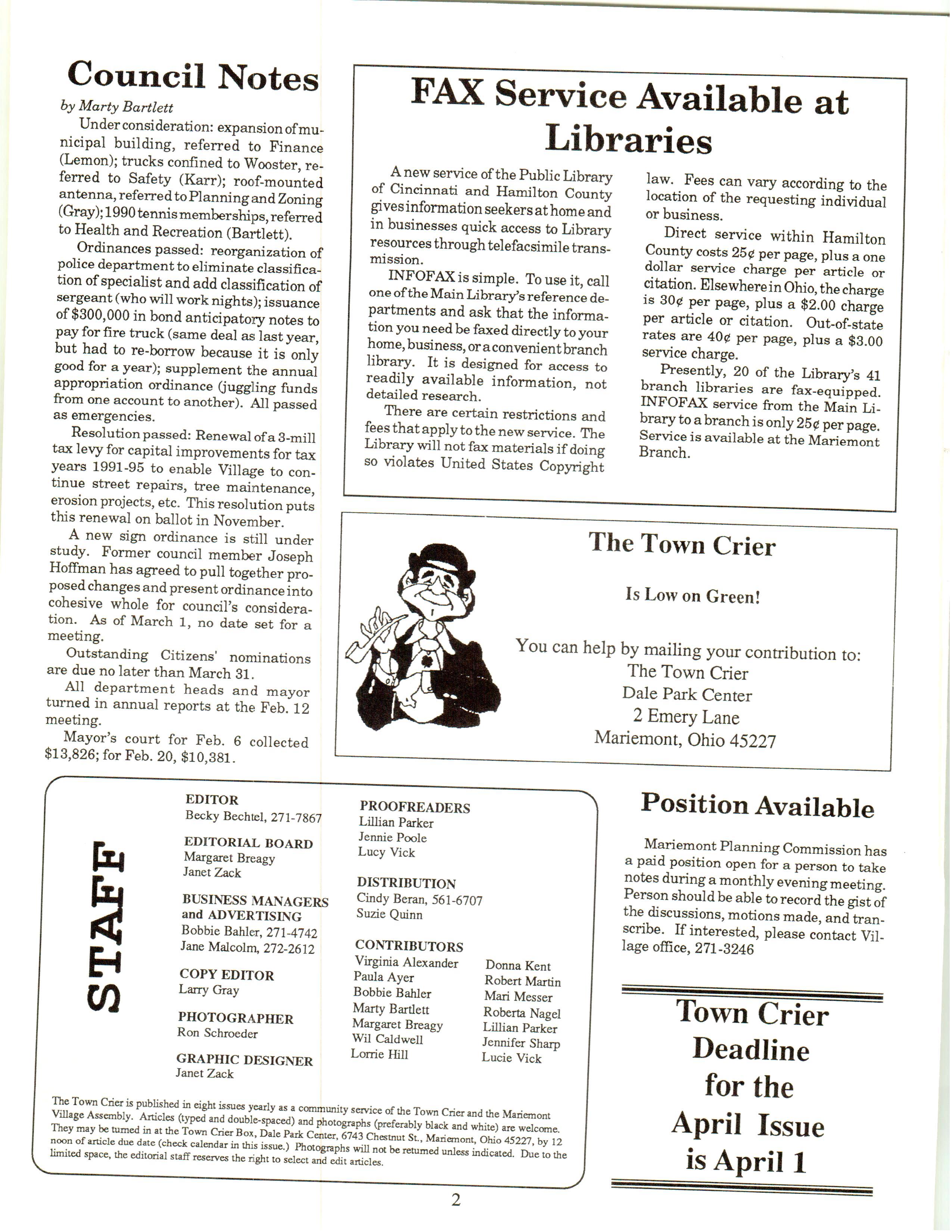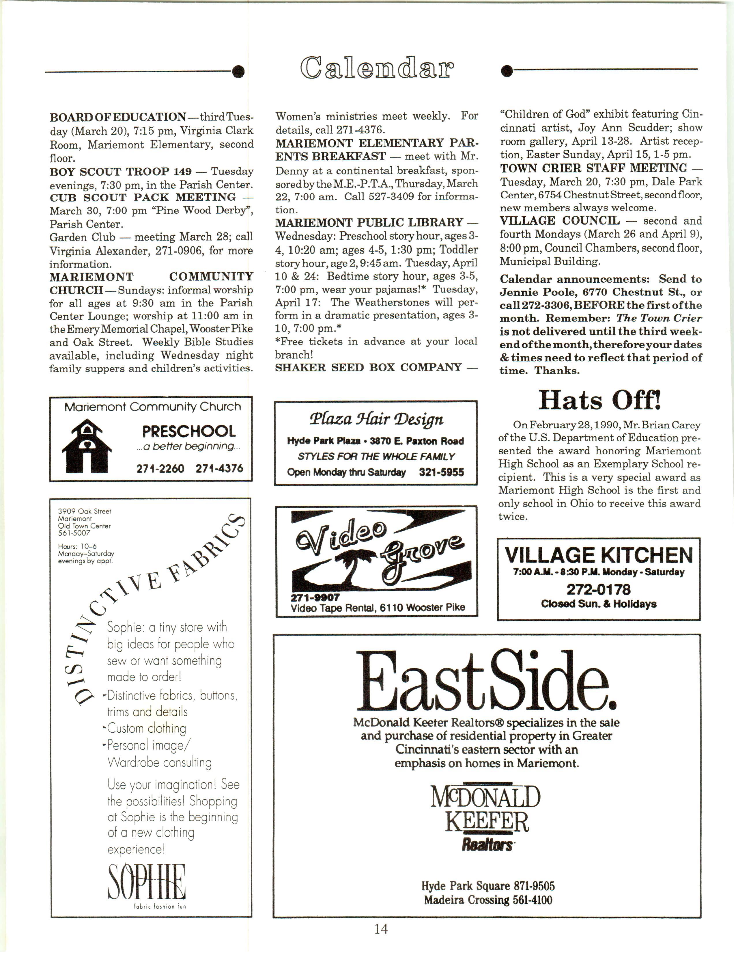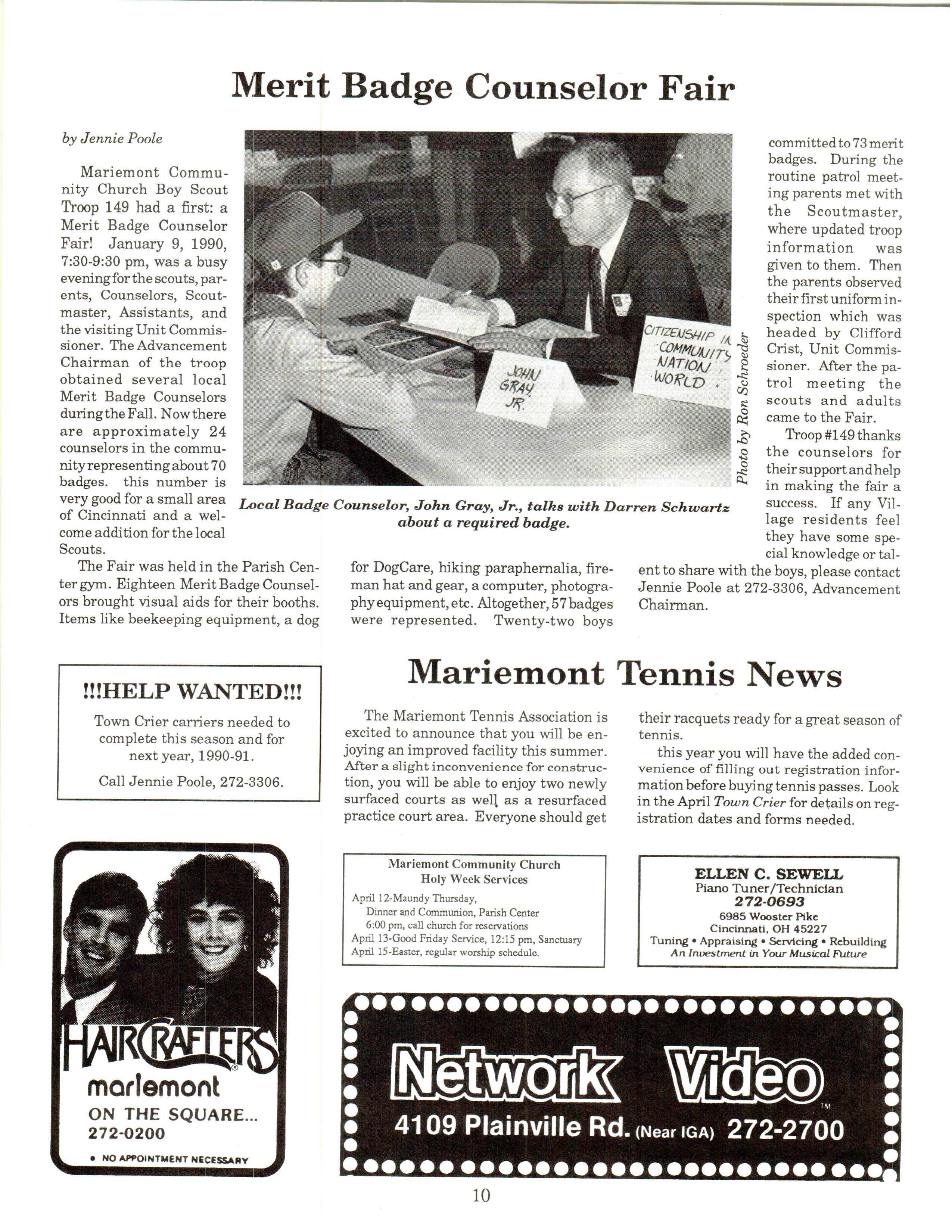 Mariemont Town Crier, March 1990, Vol. 19, No. 6