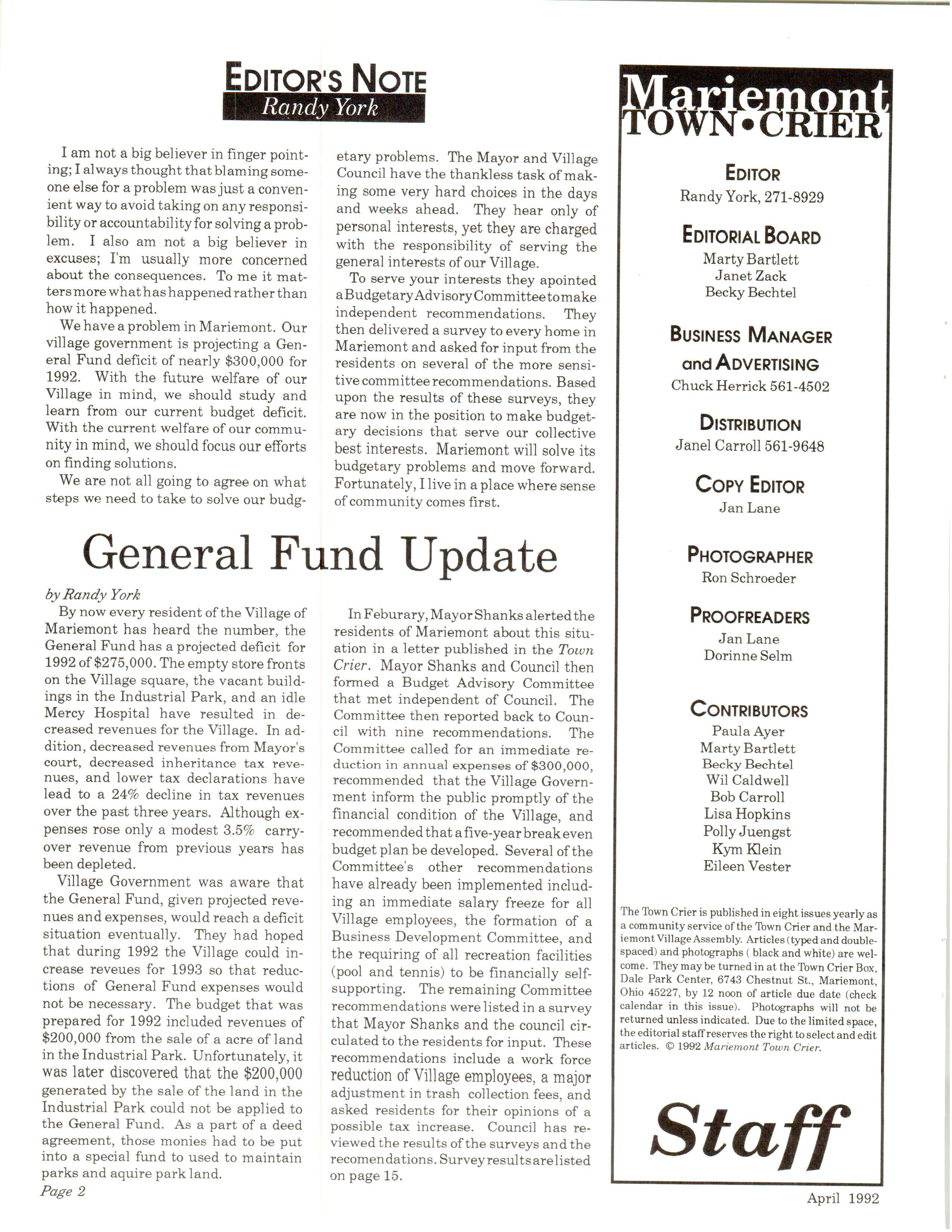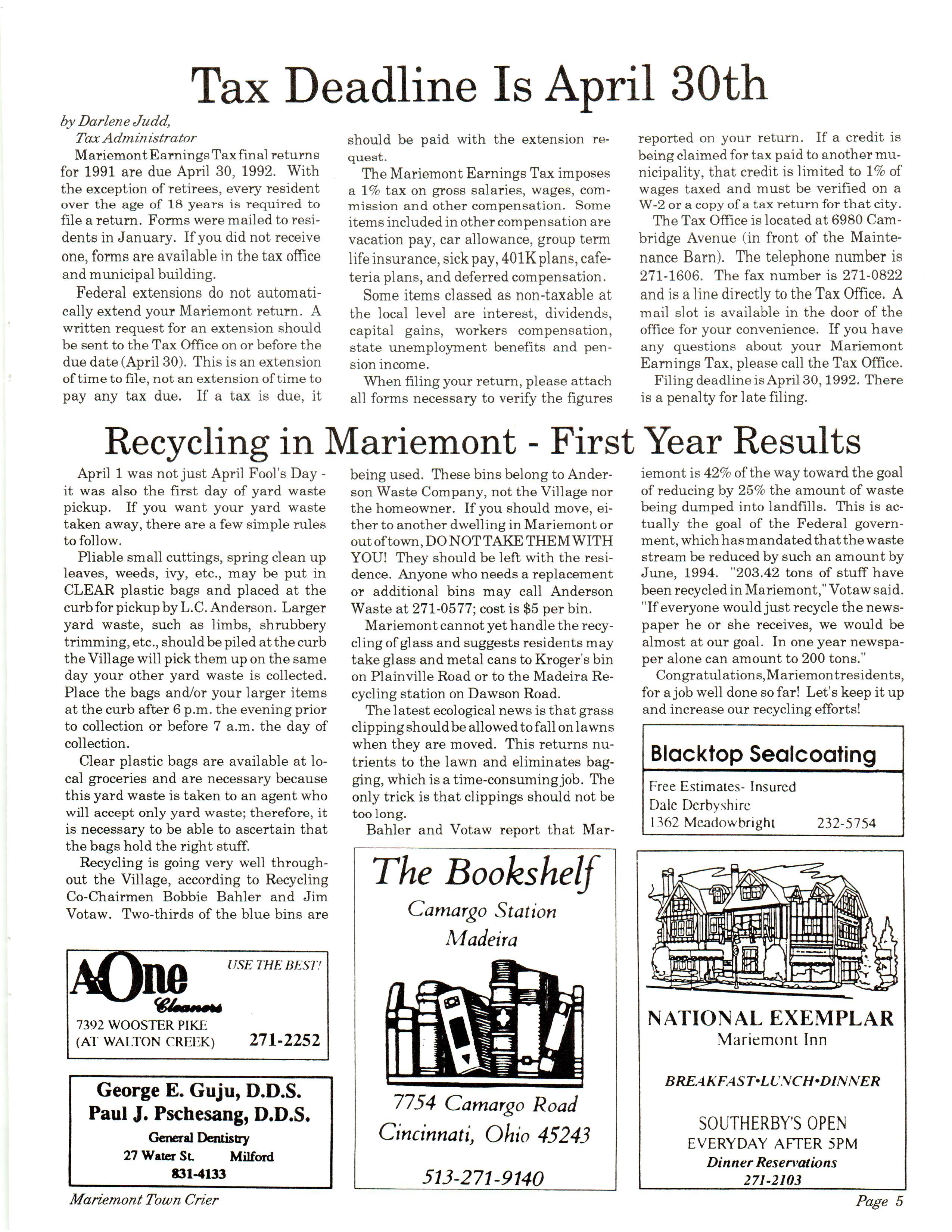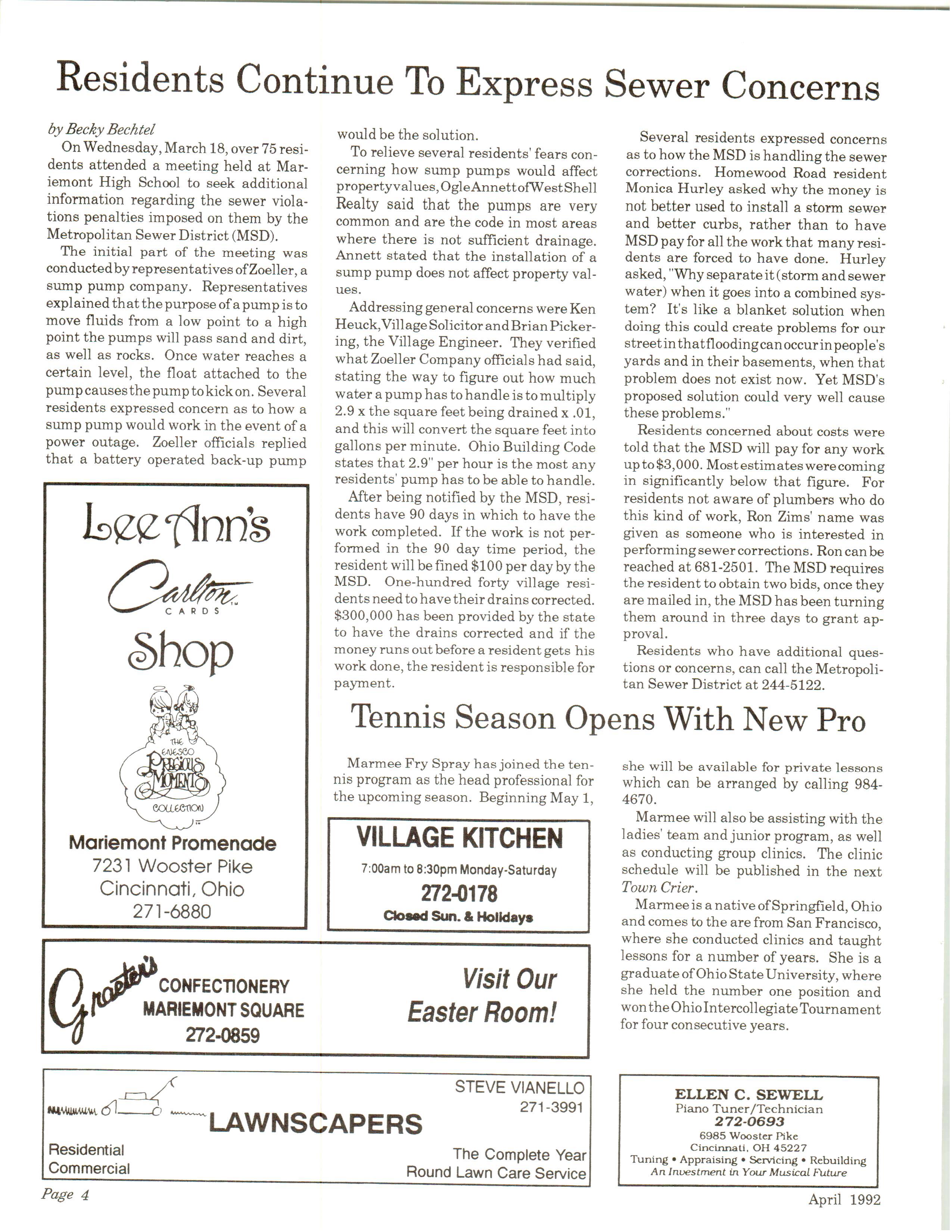 Mariemont Town Crier, April 1992, Vol. 21, No. 7