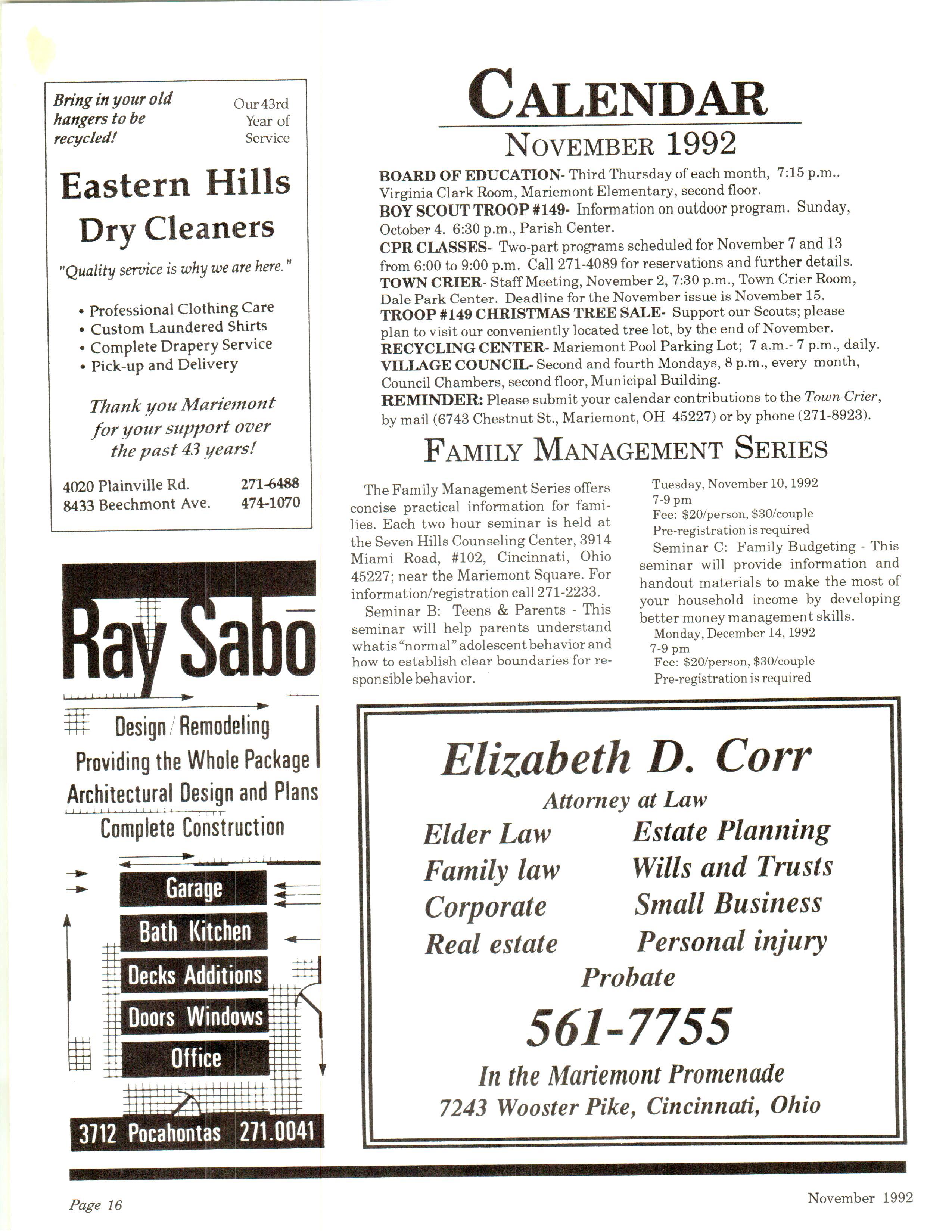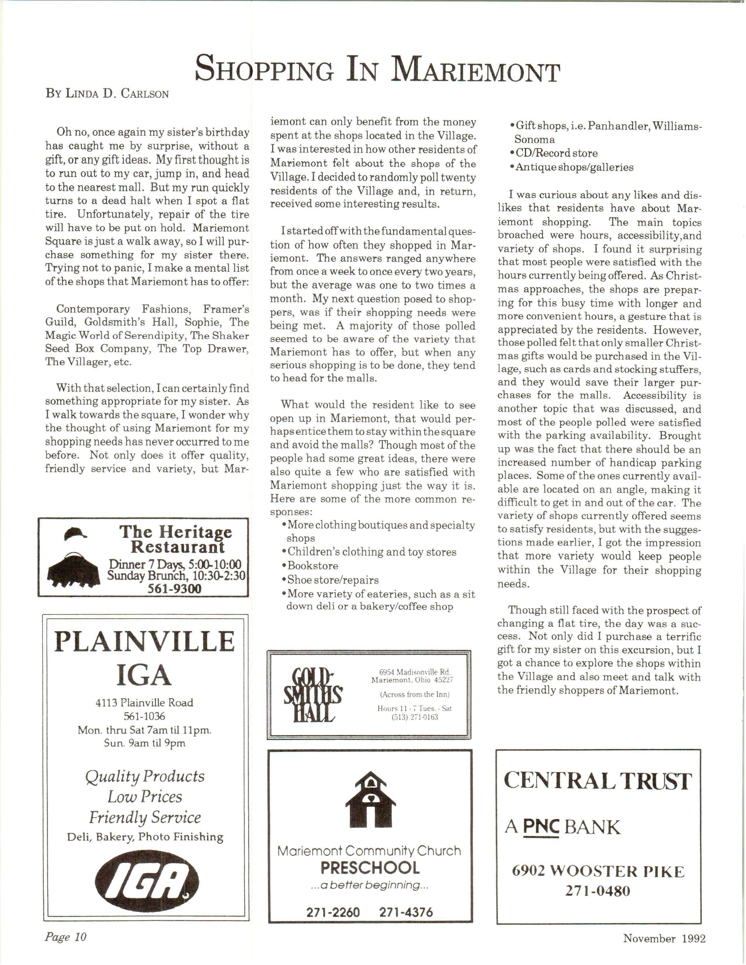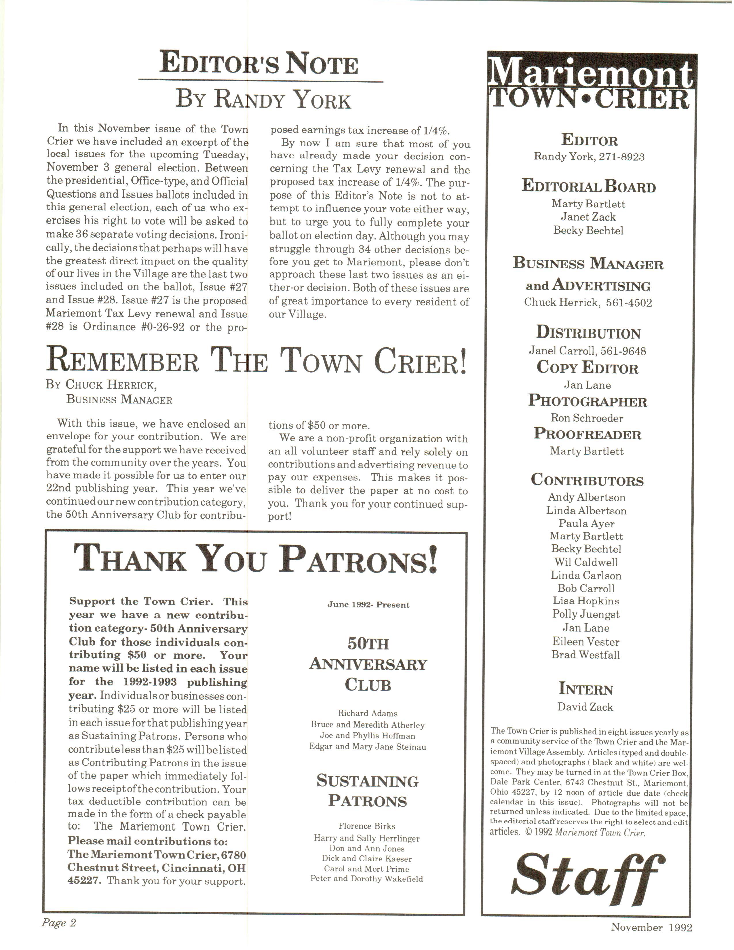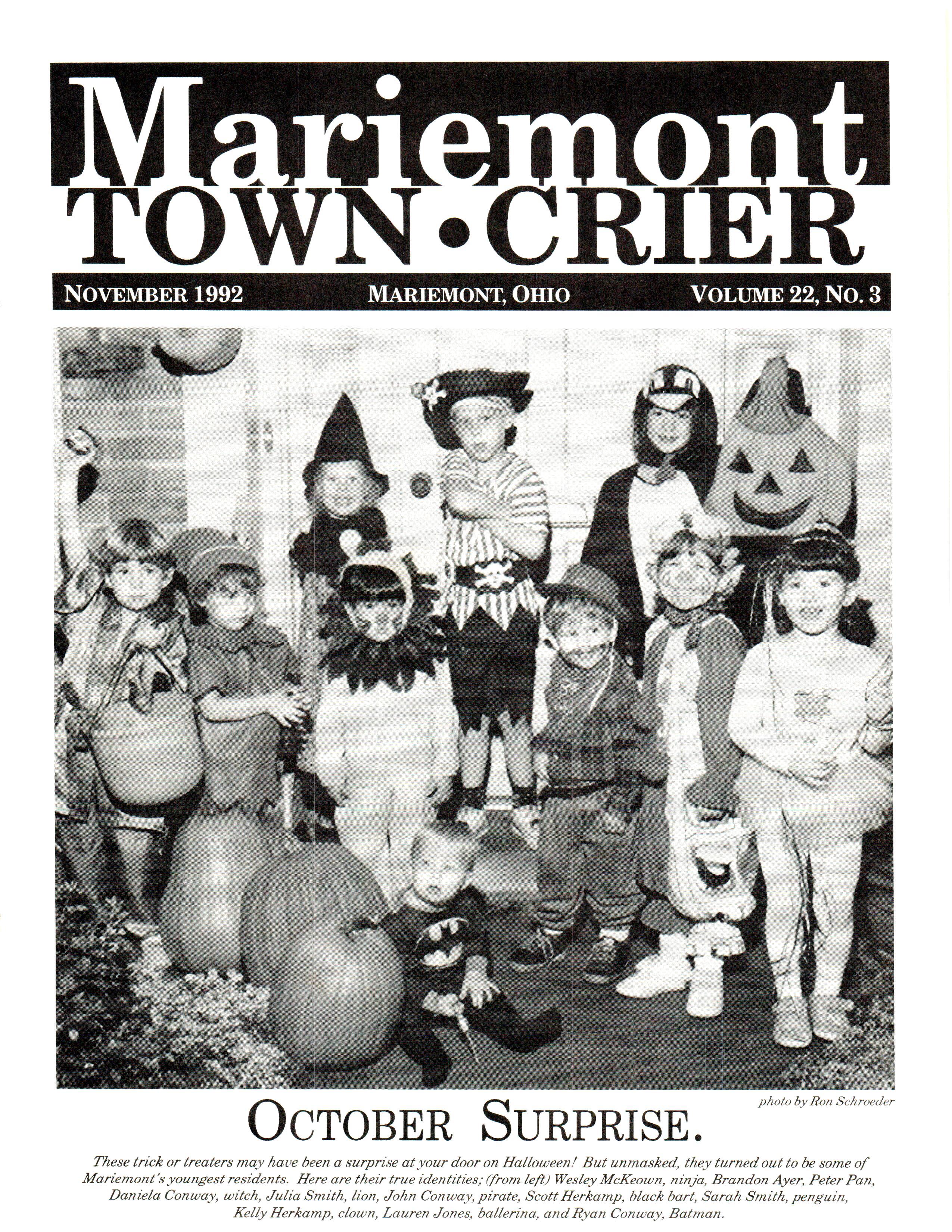 Mariemont Town Crier, November 1992, Vol. 22, No. 3