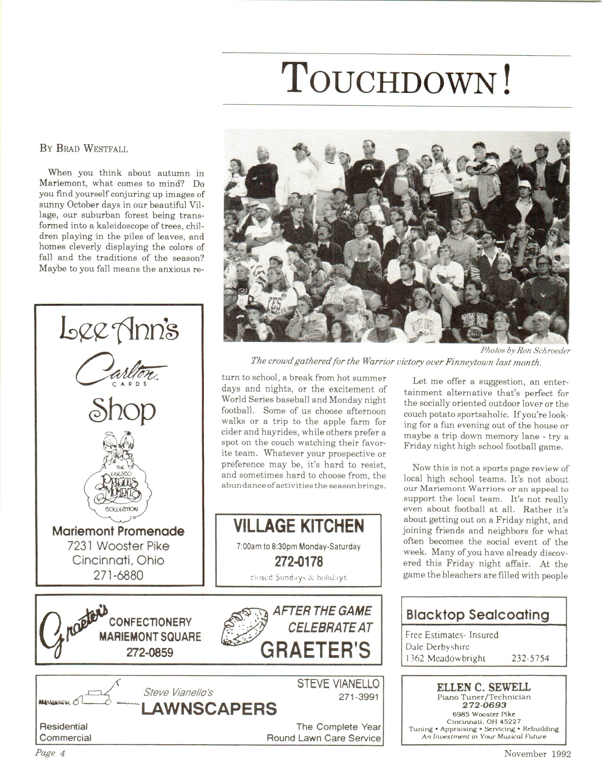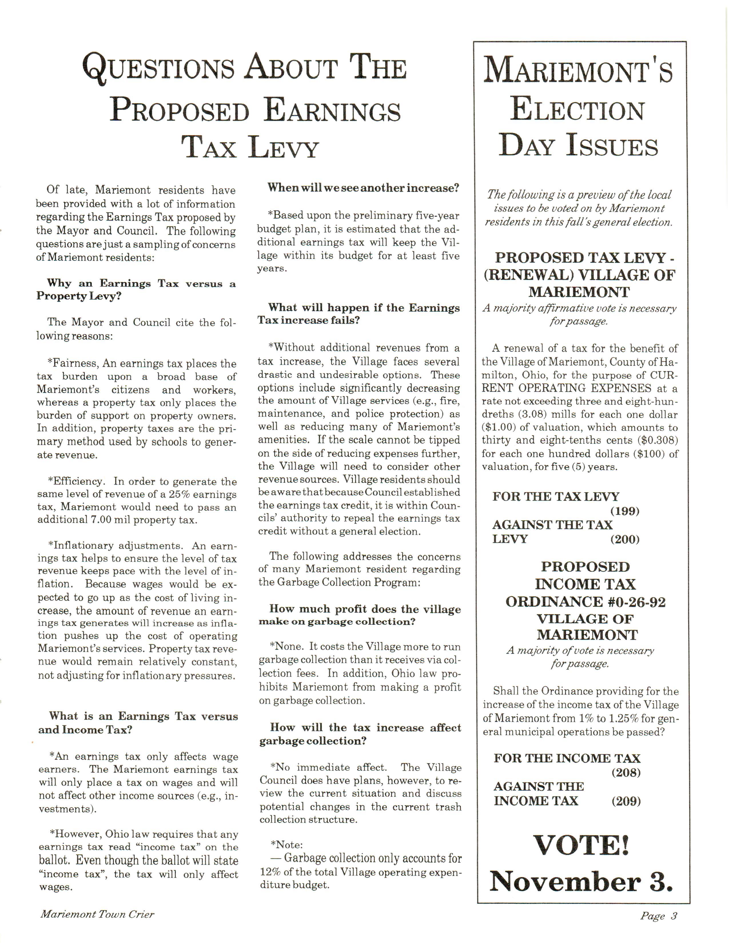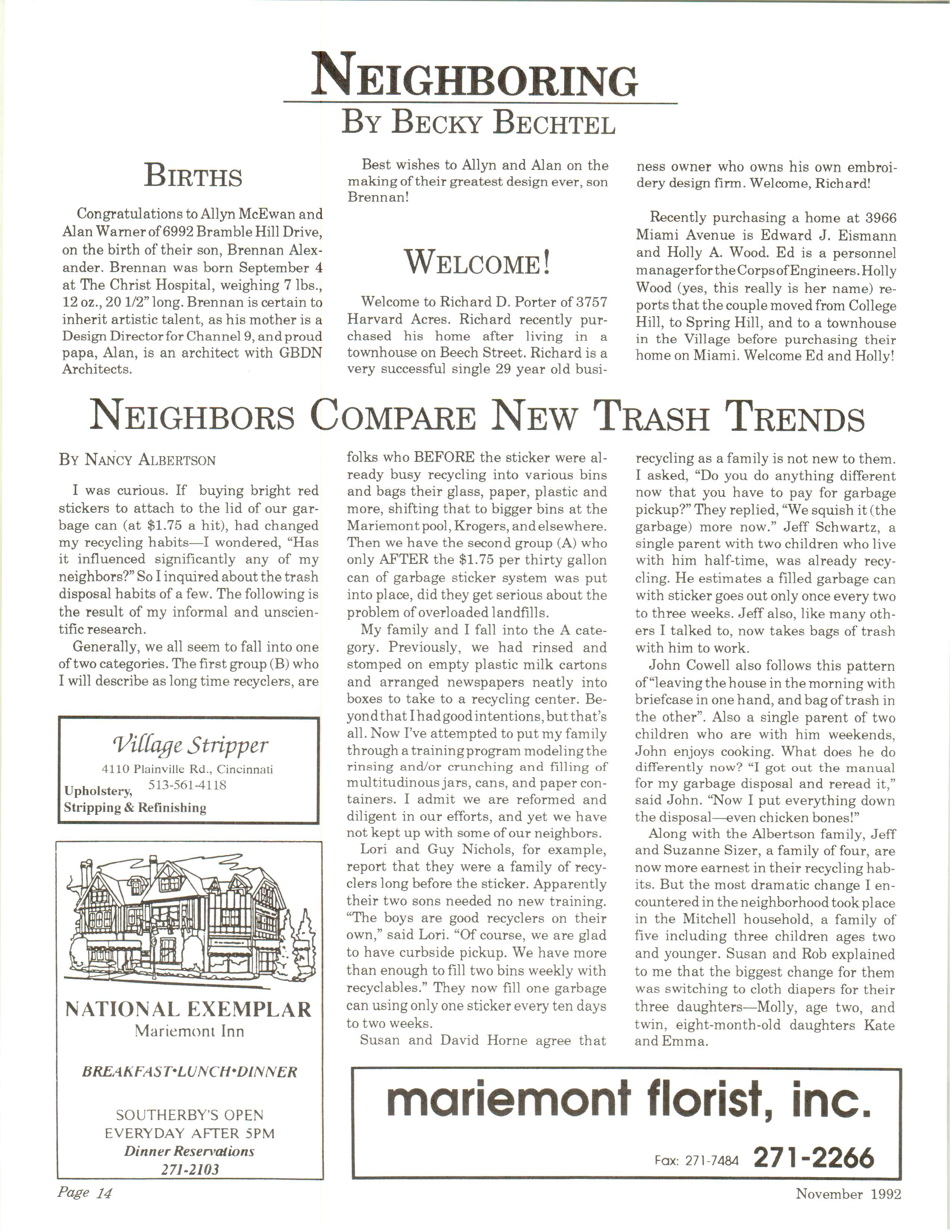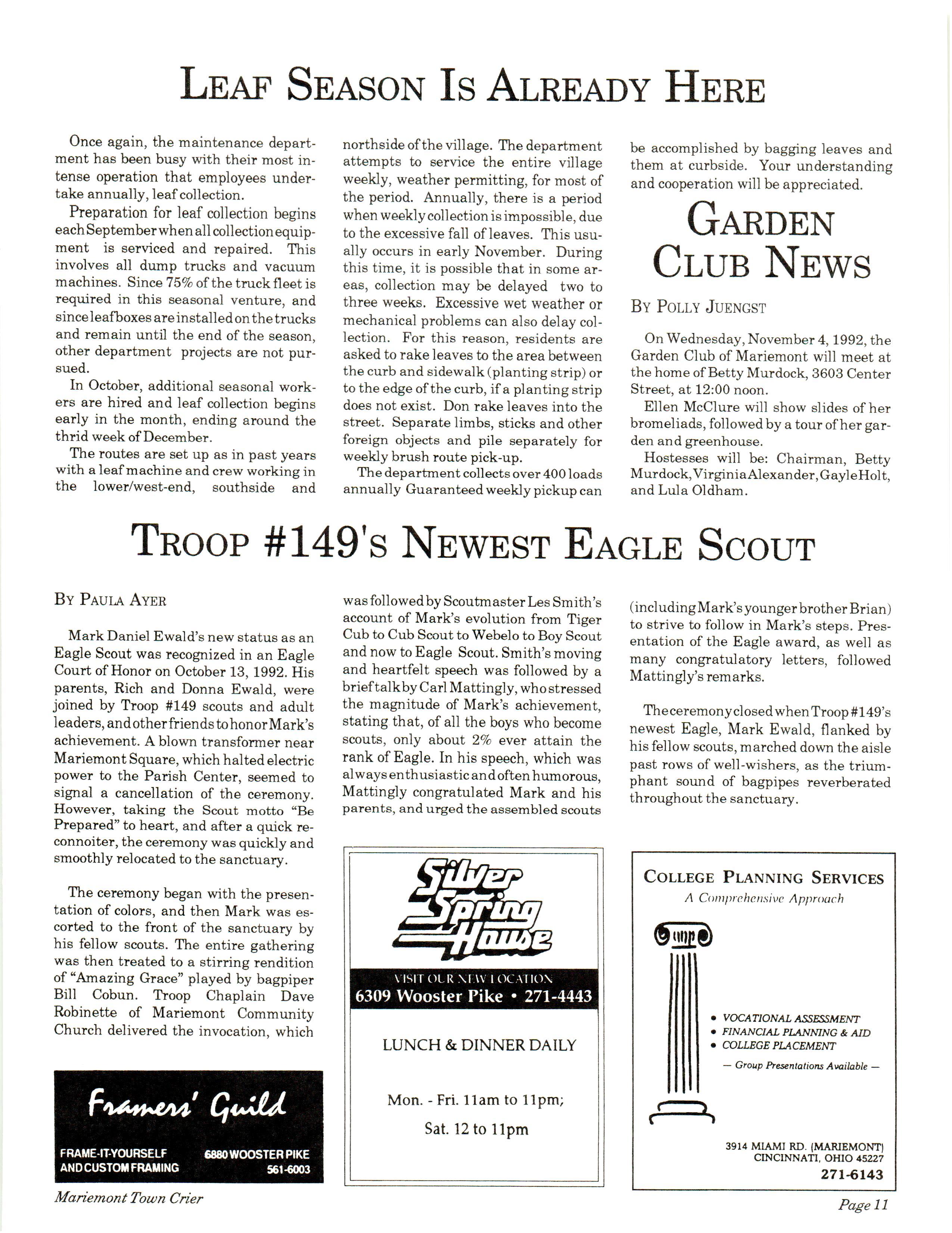 Mariemont Town Crier, November 1992, Vol. 22, No. 3