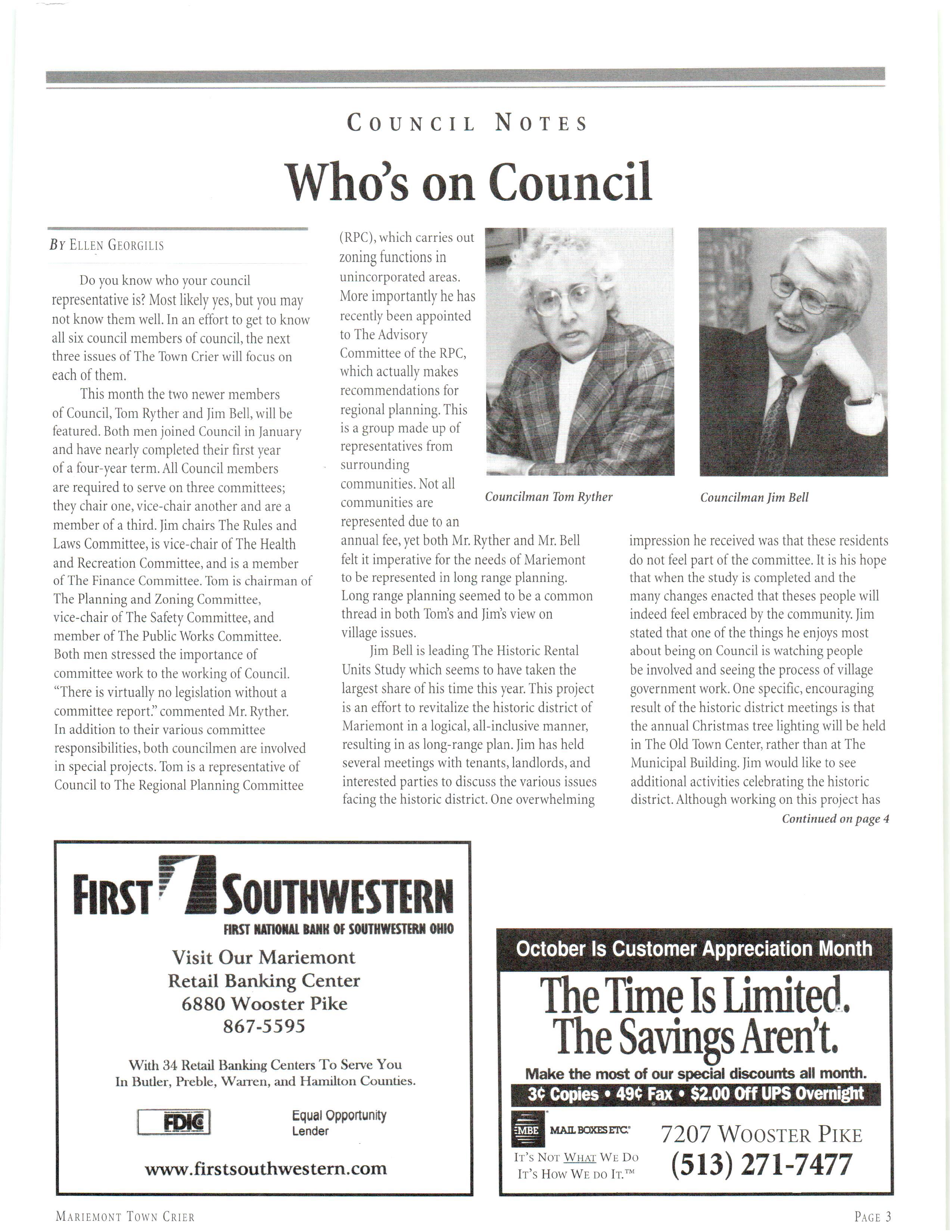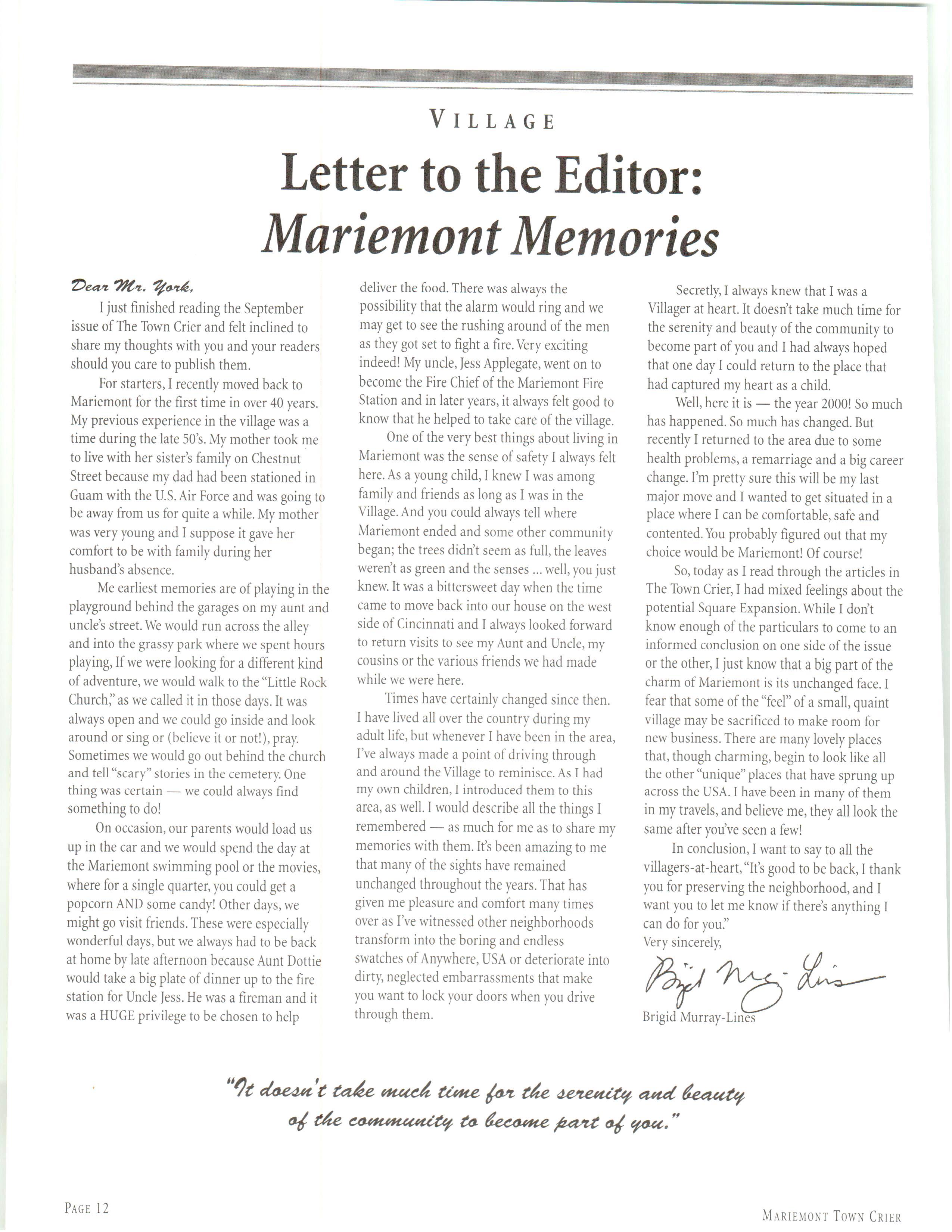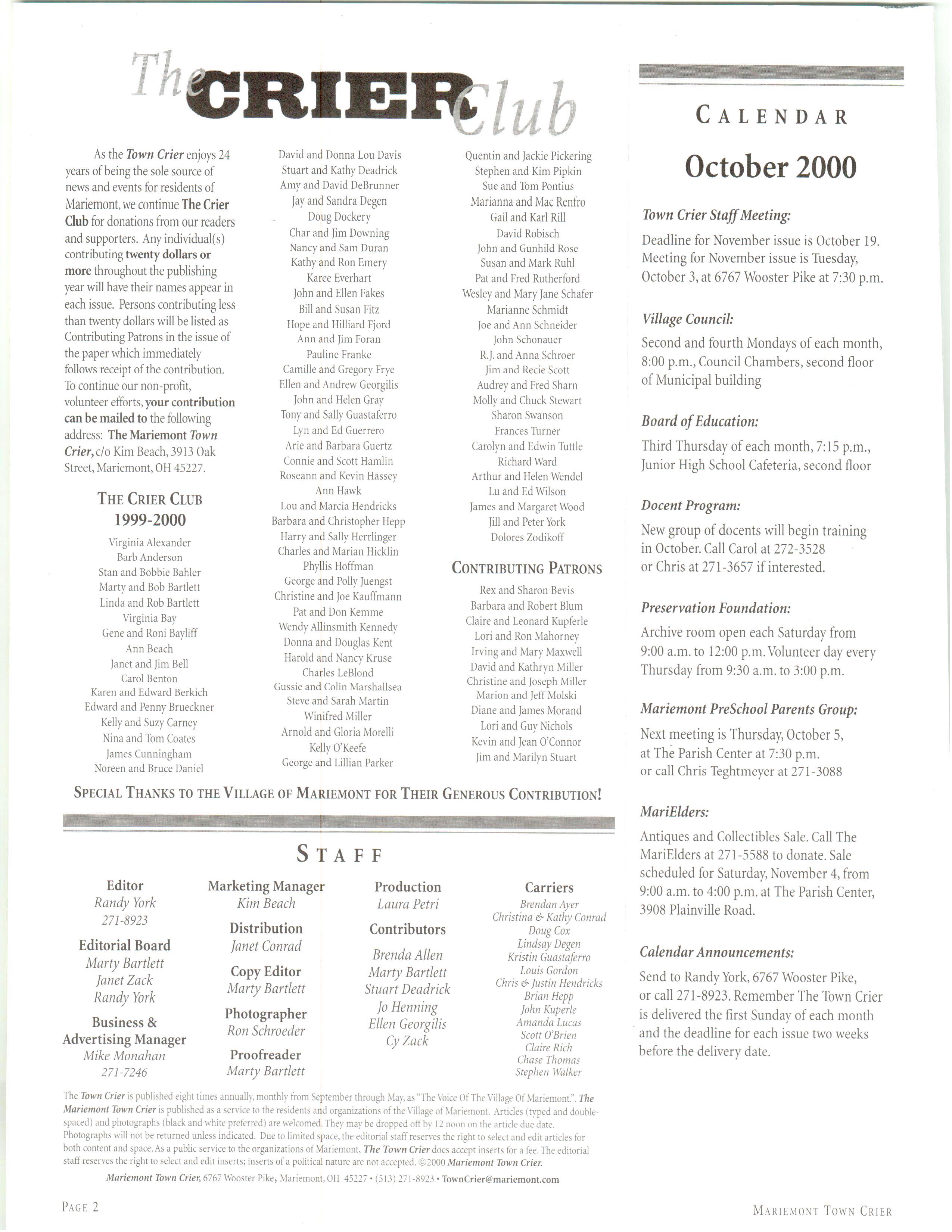 Mariemont Town Crier, October 2000, Vol. XXV, No. 2