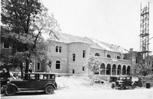 Originally, the first floor of the building housed a two-story 650 seat auditorium, including 500 floor seats and an additional 150 balcony seats, for community events and theatrical performances. The back wall of the auditorium has three large glass doors which were intended to open on to a terrace overlooking the stadium. The terrace and the planned locker rooms a floor below, were never built. One end of the building was designated as a men’s lounge with fine furnishings of the day including oak tables, leather chairs, a fully-stocked library, a