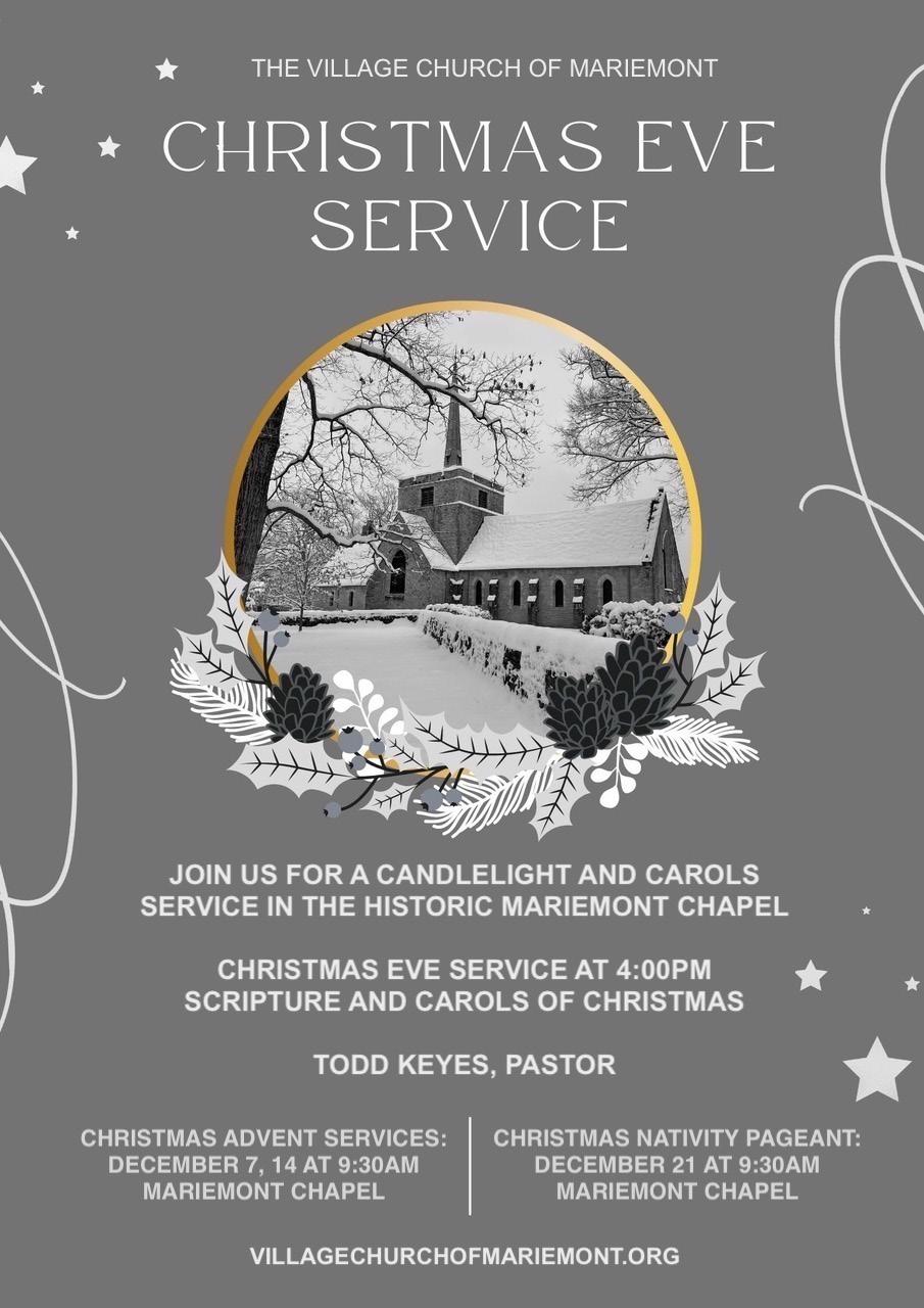 Christmas Eve Candlelight Service: You’re invited to a peaceful, joy-filled Christmas Eve candlelight service at Mariemont Church in the Clocktower building. Come as you are, bring your family and friends, and enjoy carols, candles, and community as we celebrate the wonder of Jesus’ birth. Services at 4 p.m. and 5 p.m.