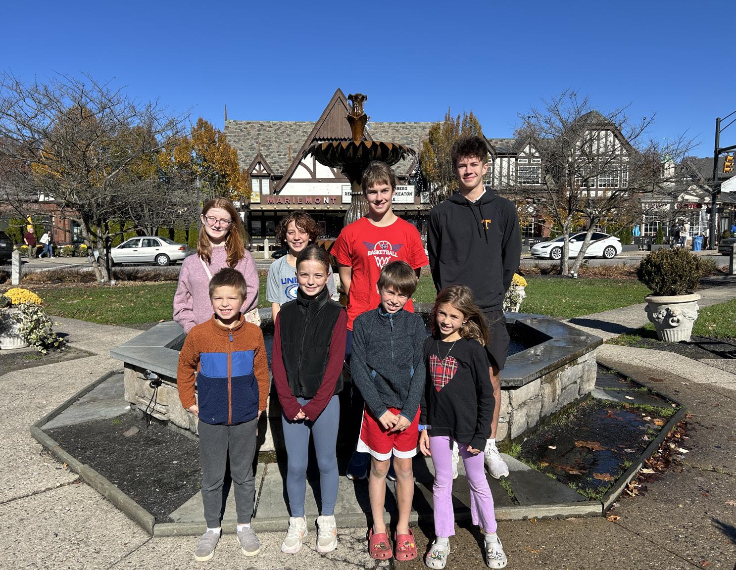 Mariemont Town Crier Junior Couriers: Front row (L-R) — Levi Lawson, Jane Lawson, Ford Willis, Twyla Willis. Back row (L-R) — Charlotte Caudill, Alex Rohal, Max Madl, and Zach Maier.