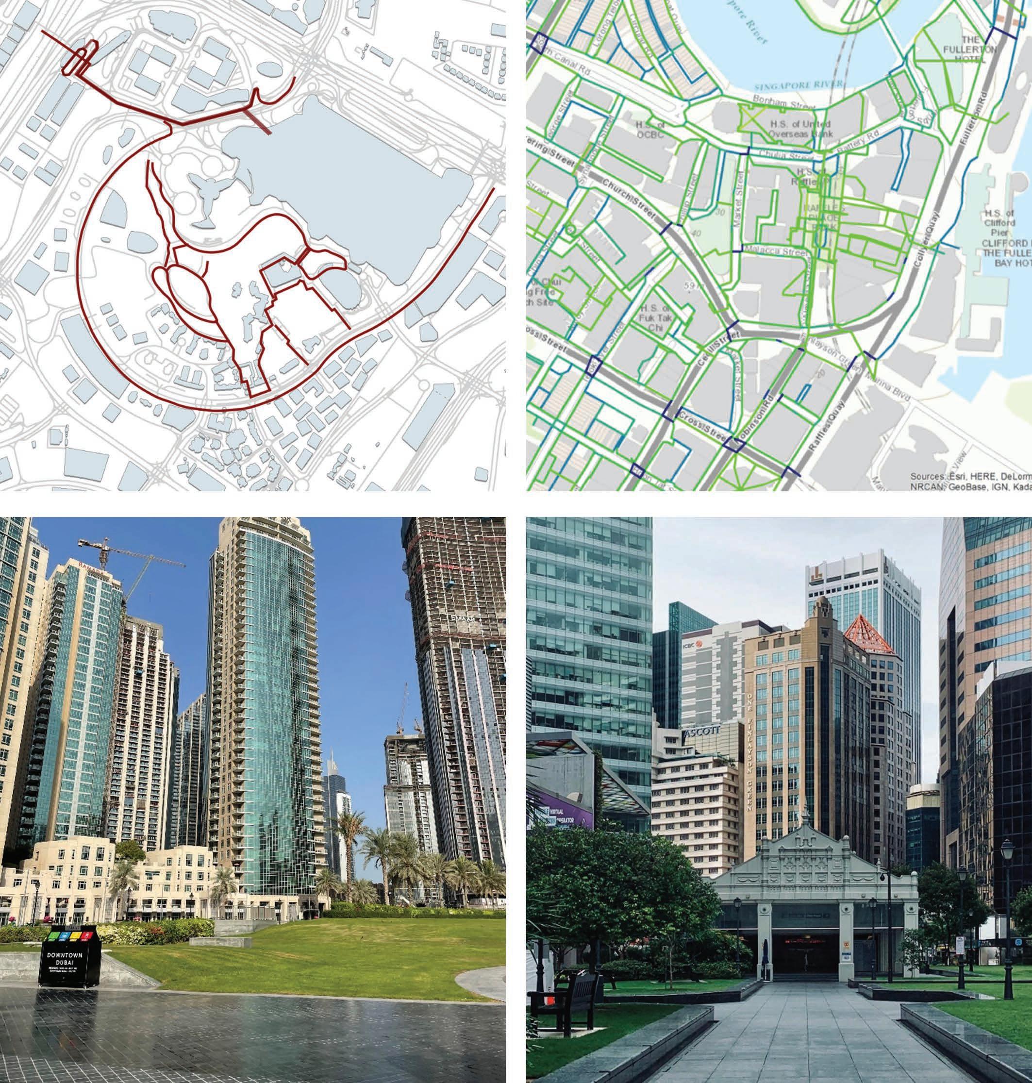 Walkways in DowntownDubai and Raffles place with almost identical context (Source: Author, Sneha S Kumar and Google images )