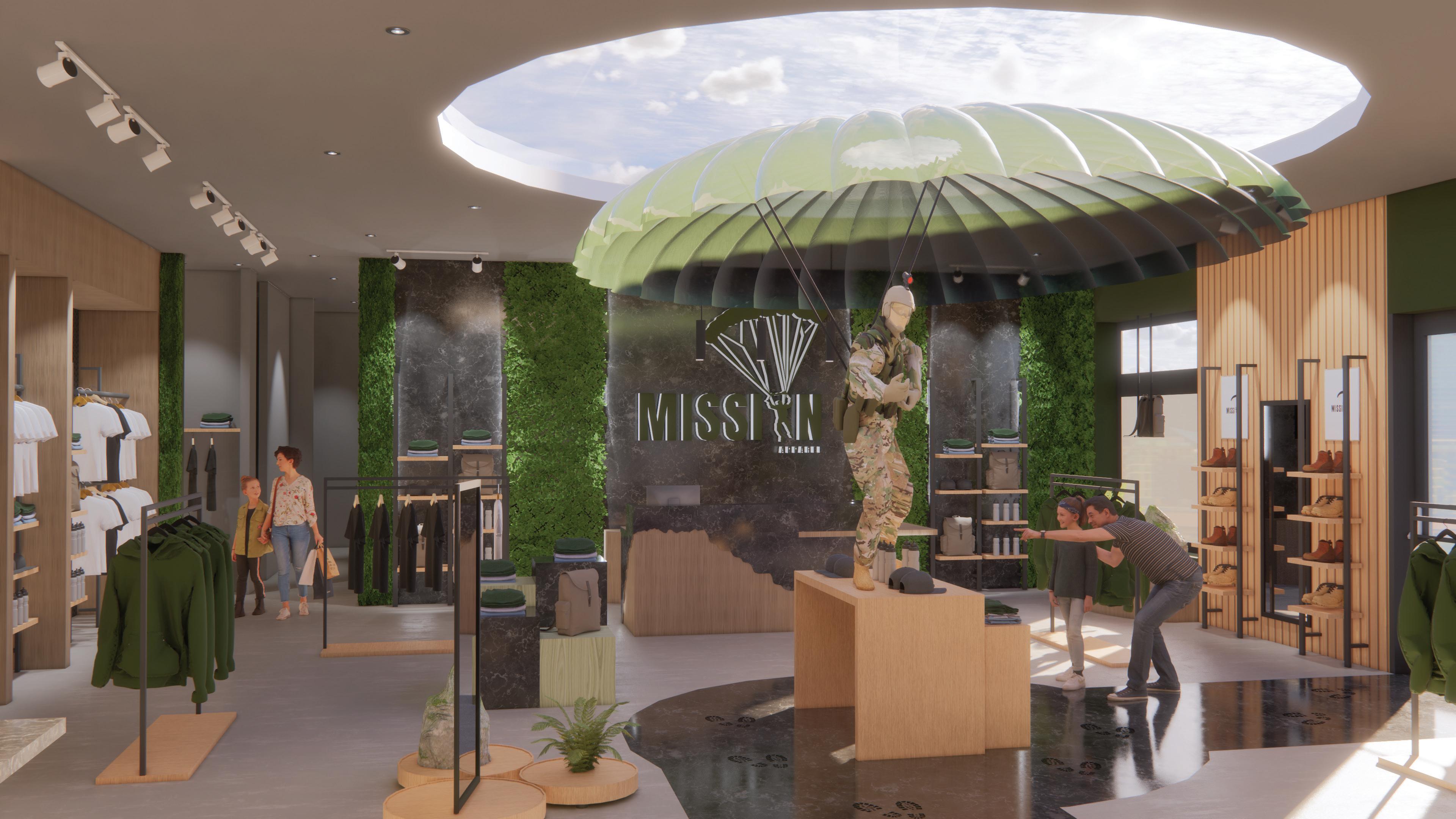 Mission Apparel’s customer attraction is the lifesize soldier and parachute display. The secondary feature is the custom embroidery bar found in the center of the store that aids with wayfinding and circulation. These focal points set the store apart from its competitors and encourages communal interaction which is the mission after all.