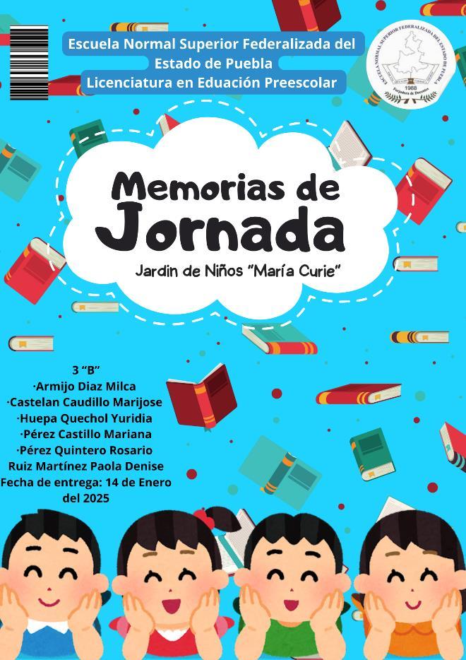 En el siguiente documento “Memorias de jornada" se hablará acerca de las experiencias vividas como equipo de jornada después de haber realizado nuestra primera práctica de observación e intervención docente en el Jardín de Niños "María Curie", a través de esto trataremos de brindar un contenido agradable y útil, esperando sobre todo que sea de su interés. Esta revista está diseñada para dar a conocer información relevante acerca de nuestras experiencias y las cosas que aprendimos al momento de realizarla. Sobre todo queremos dar a conocer información que podría ser útil en la formación docente, tomando en cuenta temas como el derecho a la educación, cómo generar talleres que se adapten a la educación preescolar teniendo en cuenta a referentes teóricos, asimismo se presenta una narrativa de nuestra experiencia y de los principales retos principales a los que nos enfrentamos como equipo, también se hacemos mención de una serie de estrategias para enseñar las nociones espaciales, esencialmente el espacio, medida y forma en preescolares para dar a conocer algunas de ellas y así se puedan generar en el aula, también se habla de la importancia que tiene la literatura infantil y ciertas sugerencias de cómo fomentarla en un Jardín de Niños y en futuras prácticas.