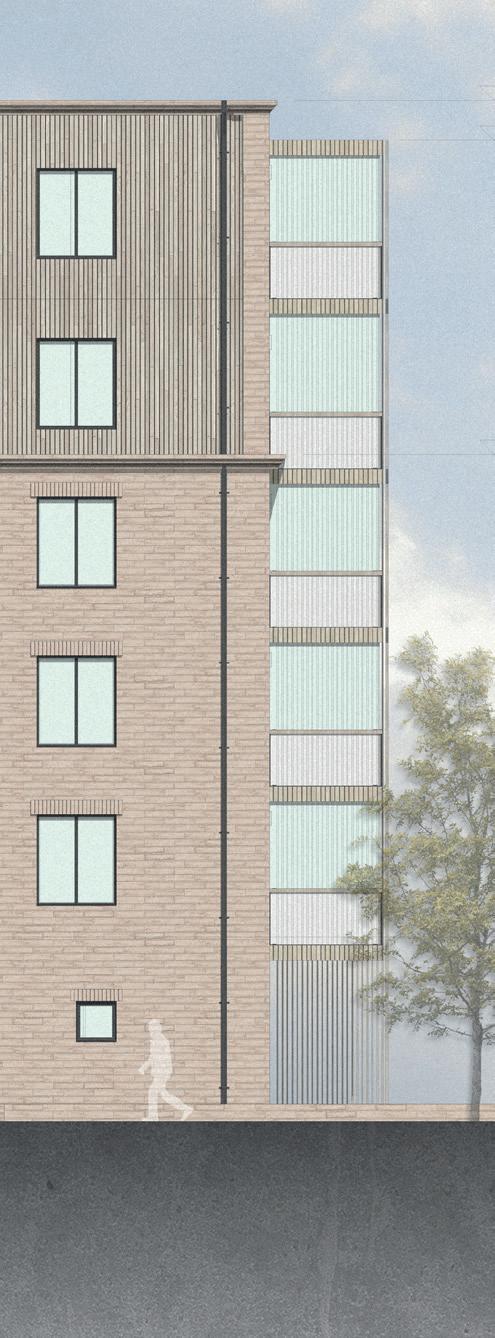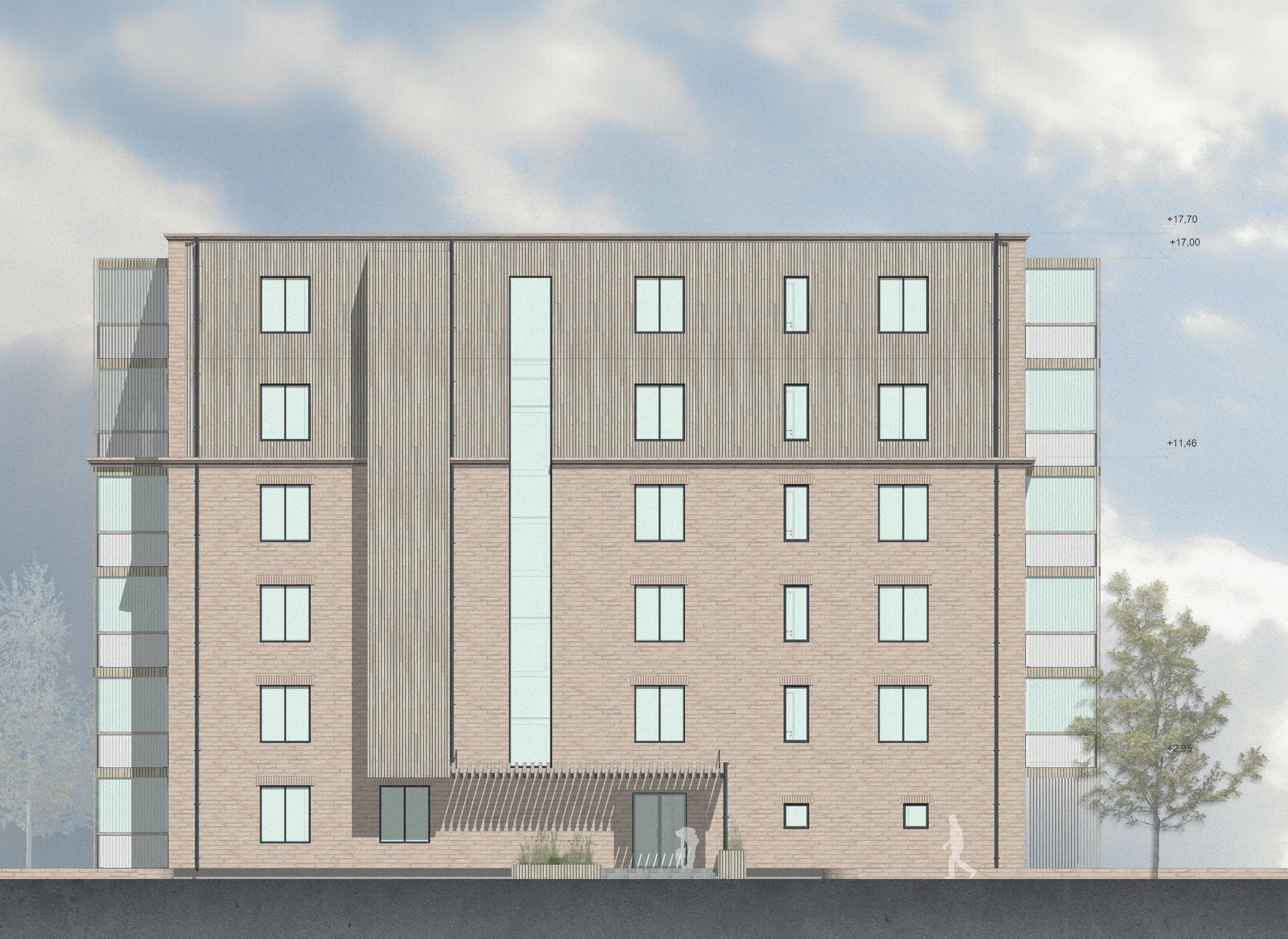 Suunniteltu rakennus ilmentää alueen perinteistä arkkitehtuuria sekä materiaaleja uudella näkökulmalla. Julkisivun persikkainen tiili piristää yleisilmettä samalla kun teräksiset, alumiiniset ja betoniset rakennusosat luovat ryhdikkyyttä kokonaisuuteen. Rakennus koostuu neljästä asuinkerroksesta sekä ullakkokerroksesta ja sen massa on moniulotteinen, mutta yksinkertainen.