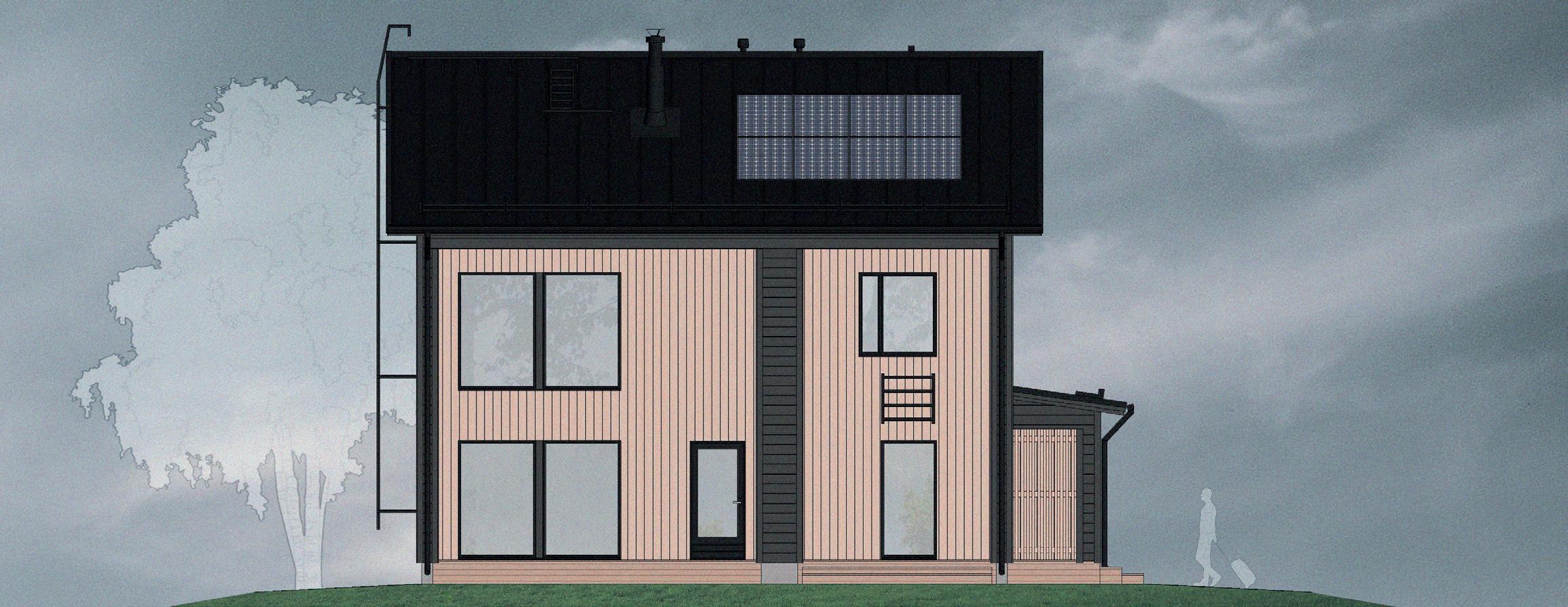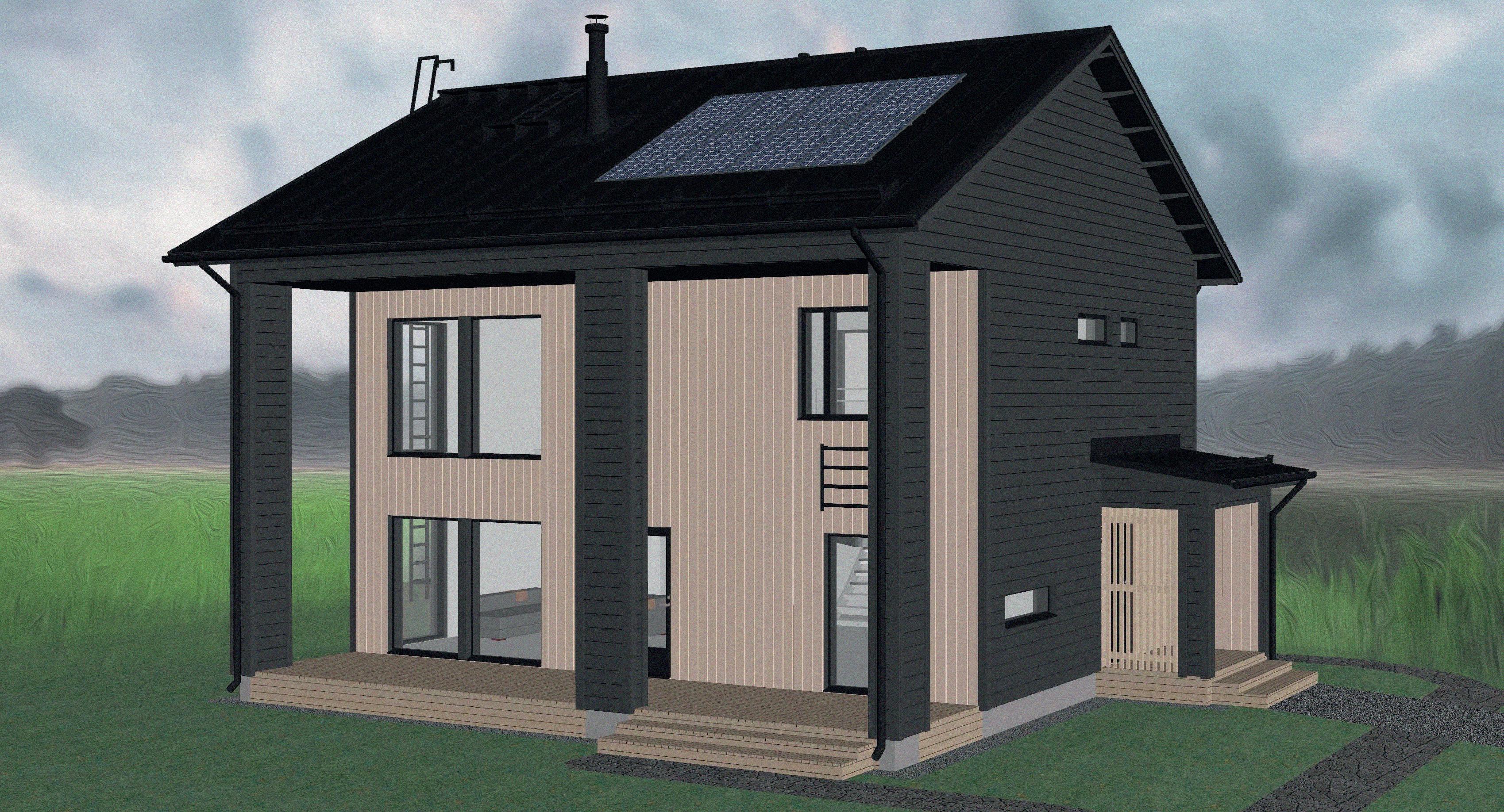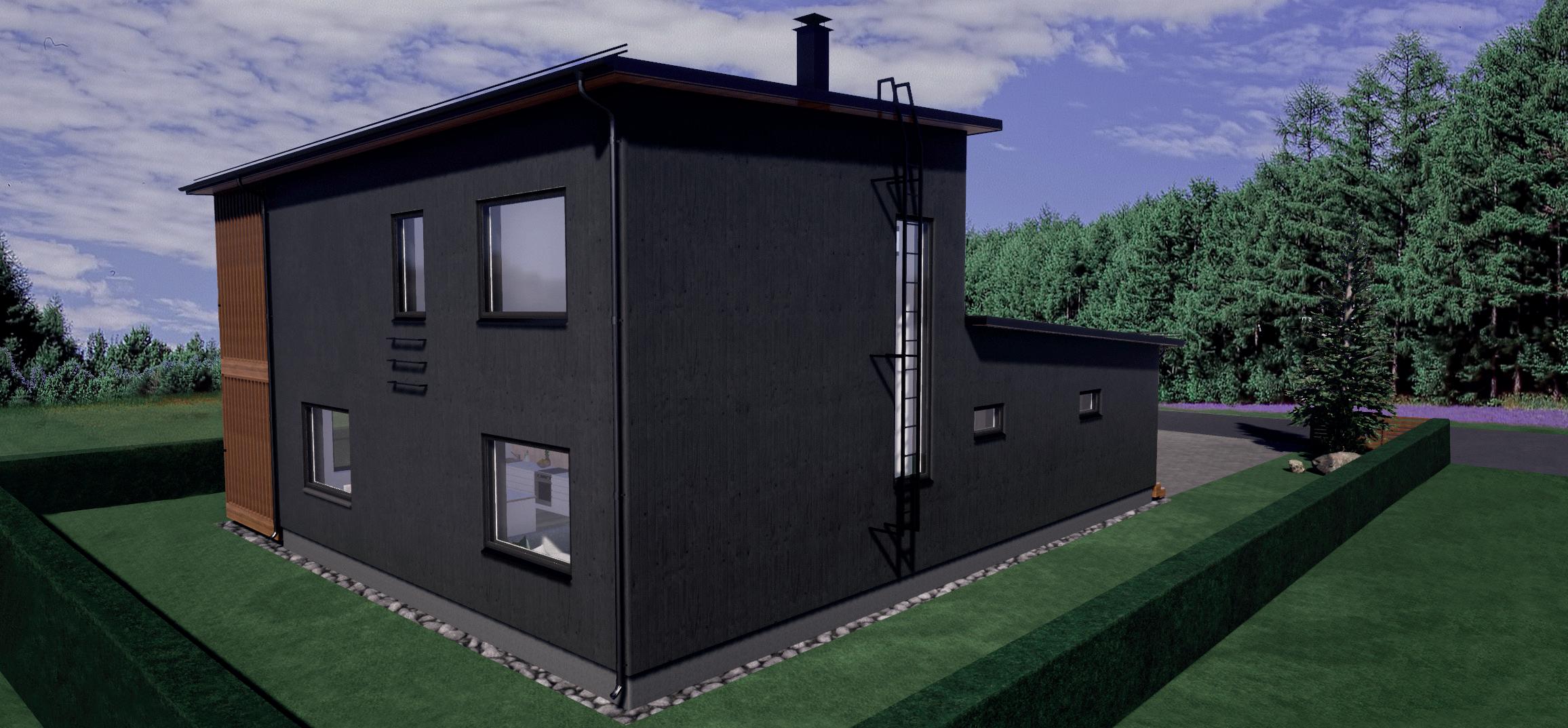 Rakennussuunnittelun perusosaamisen kurssilla tehtävänä oli suunnitella pientalo rakennuttajan toiveiden mukaan. Lähtökohtina rakennuttajilla olivat muun muassa kaksi kerrosta, tumma puuverhous, pulpettikatto sekä lasitettu parveke, jonka alapuolella lasitettu terassi sekä musiikkistudio.