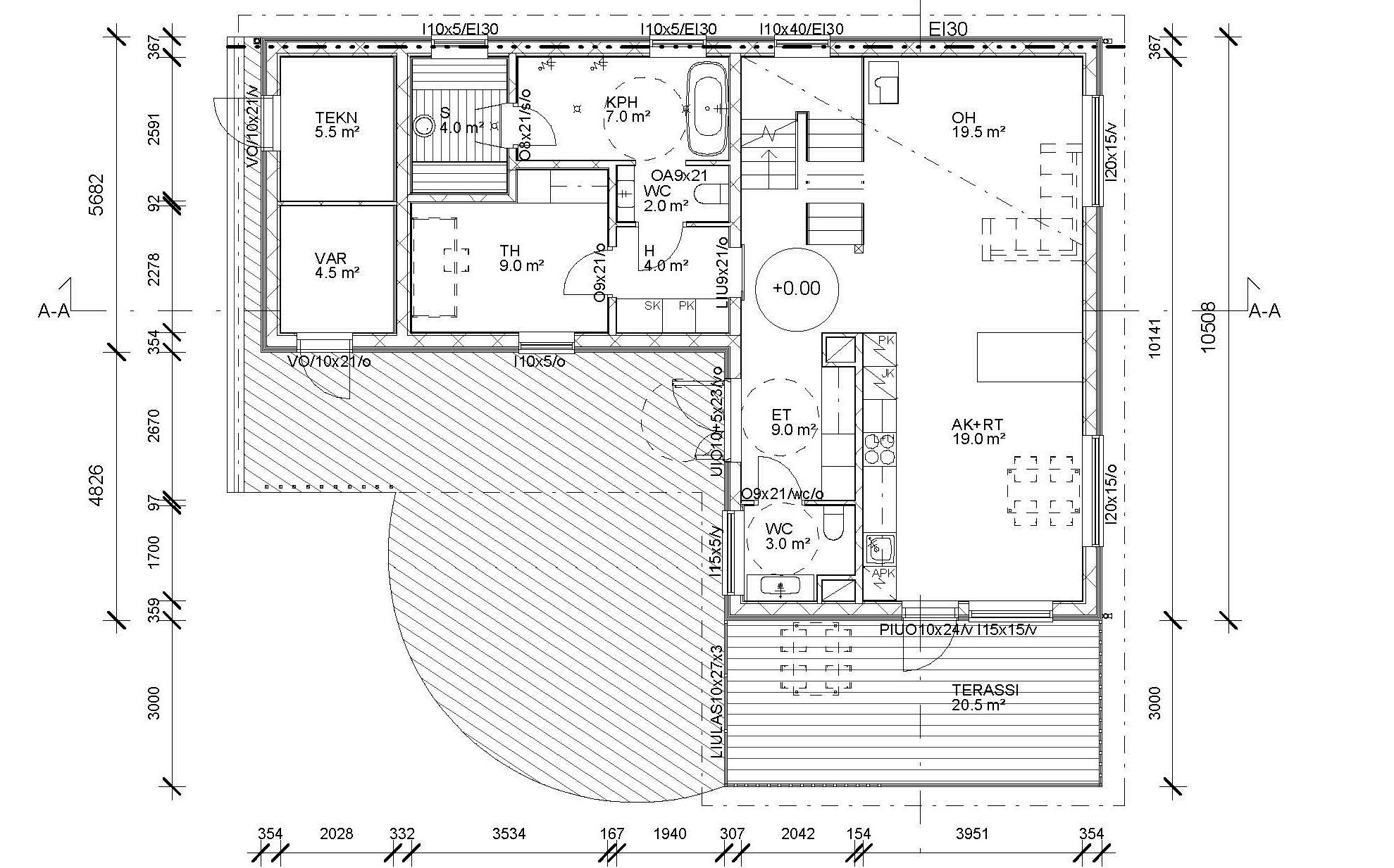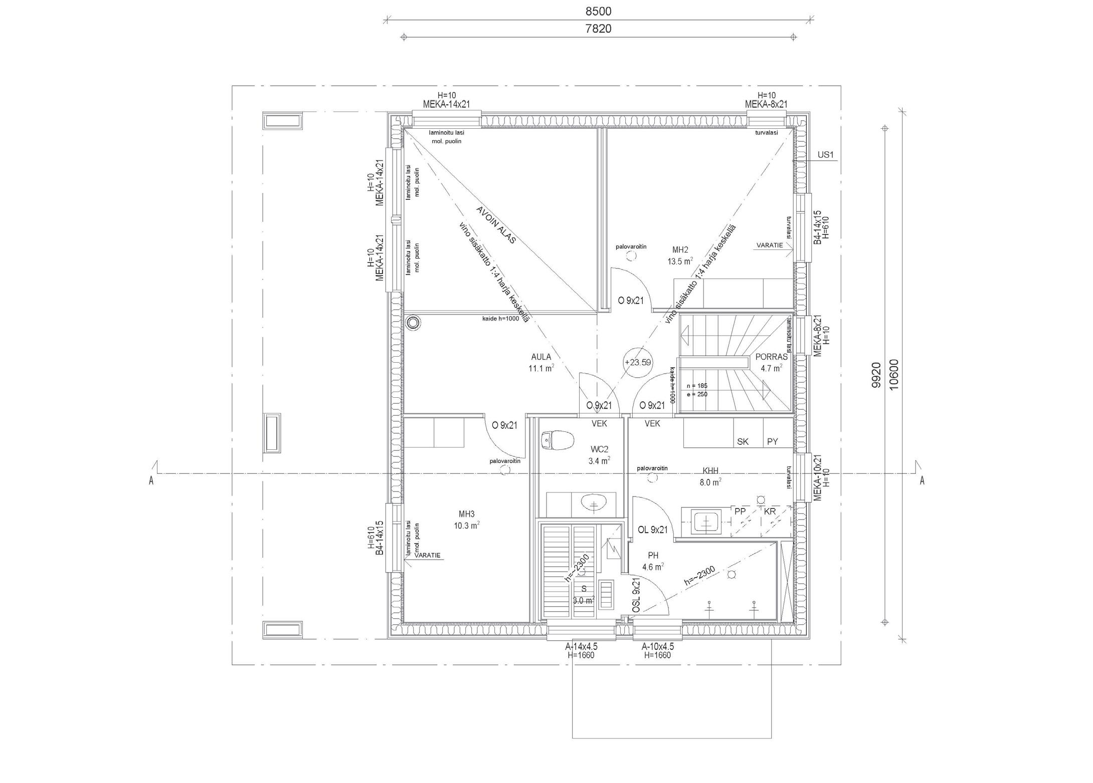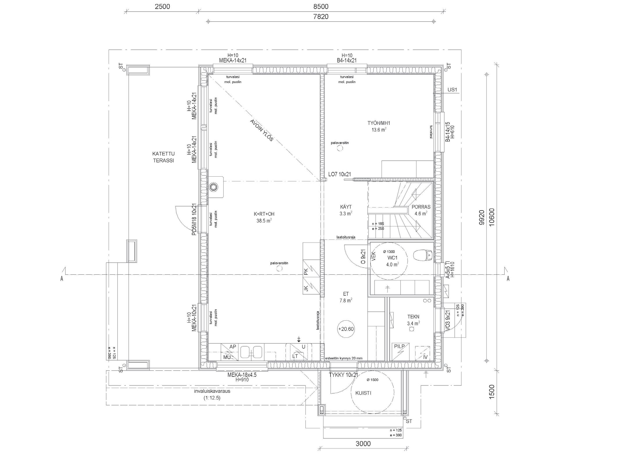 Halusin suunnitella toimivan kaksikerroksisen kodin, jossa on mahdollisuus etätyöskentelyyn kotitoimistossa. Pohja on myös muunneltavissa, jolloin yläkerran aukon kohdalle voidaan rakentaa yksi makuuhuone lisää.