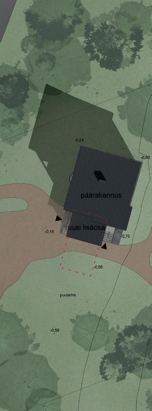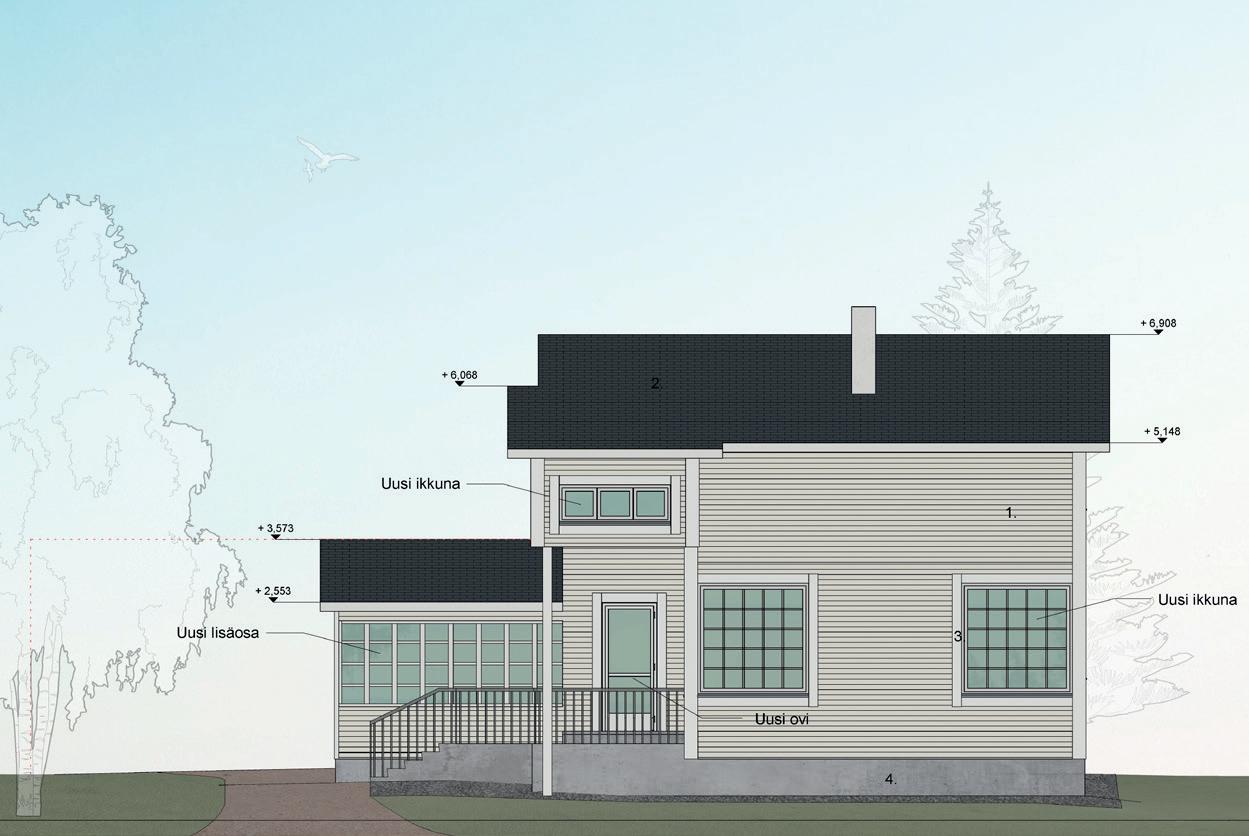 Päärakennus on rakennettu kahdessa osassa, joista alkuperäinen rakennusosa rakennettiin 1940-luvun lopussa huvilakäyttöön ja sille alisteinen lisäsiipi 1970-luvun alussa. Ryhmämme koki tärkeänä alkuperäisen puufunkis-tyylin kunnioittamisen sekä julkisivumaalauksen alkuperäistämisen.