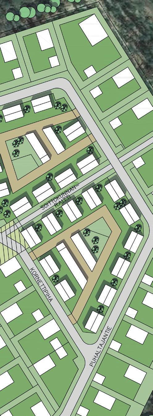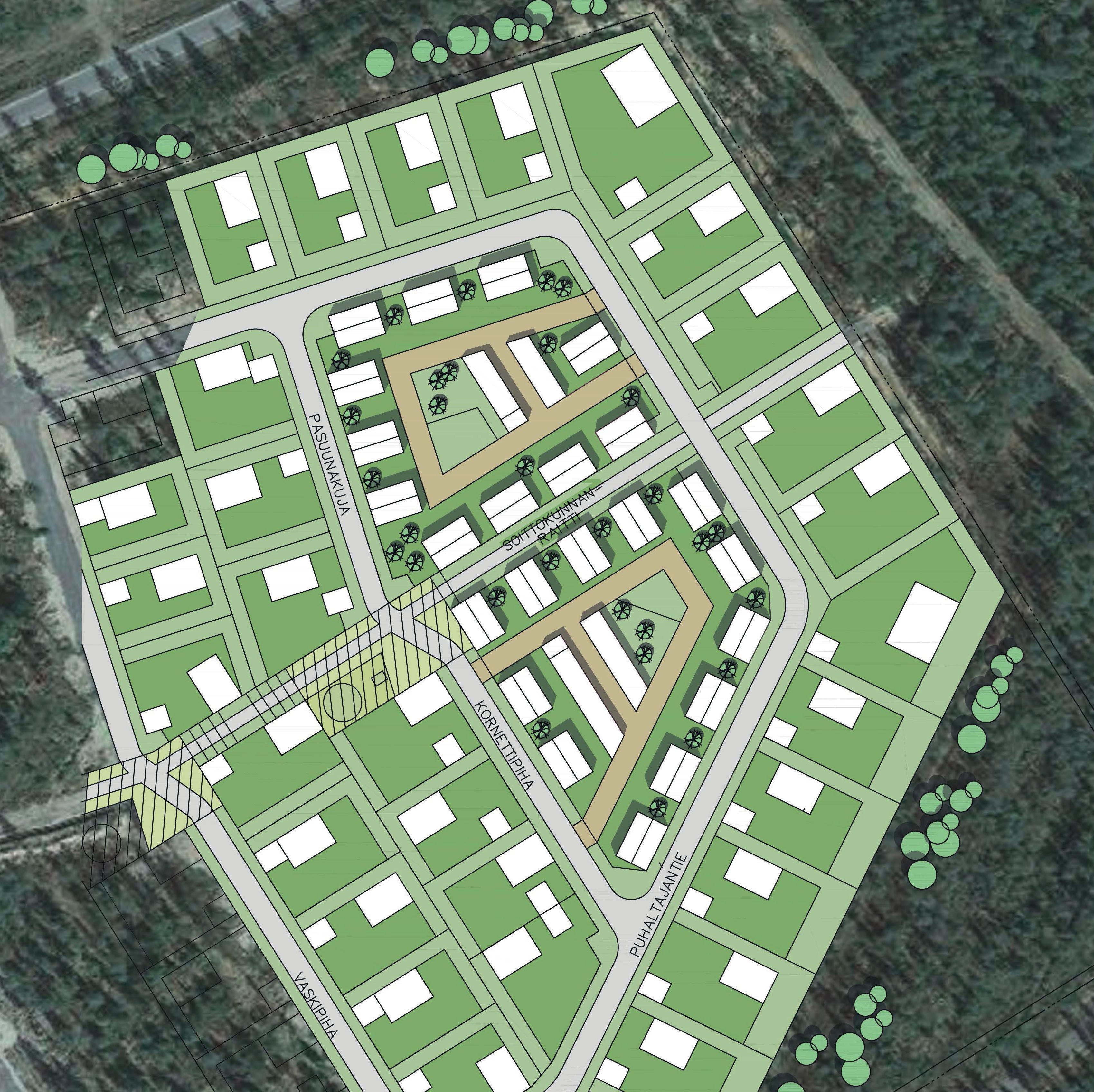 Lähdin tutkimaan ympärille kaavoitettua aluetta, jonka perusteella päätin suunnitella asuinpientaloista koostuvat korttelialueet. Halusin luoda lähiömäistä tiivistä asumista erillistalojen muodossa sekä viihtyisää ympäristöä tähtäimessä lapsiperheet.