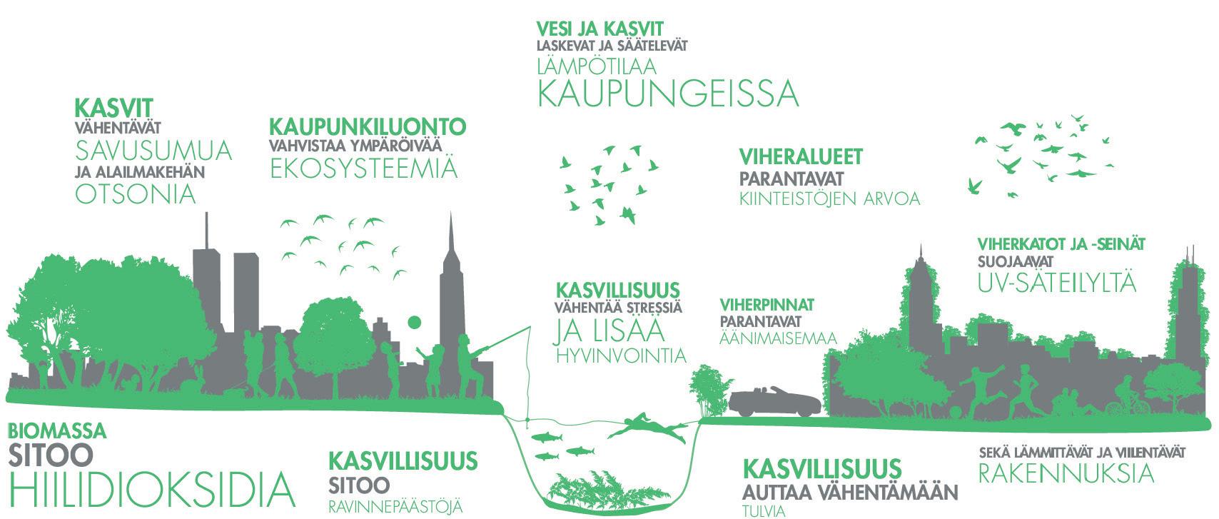 Perusteet julkisivukasvillisuuden hyödyntämiseen voivat olla niin esteettiset, terveydelliset kuin toiminnallisetkin.