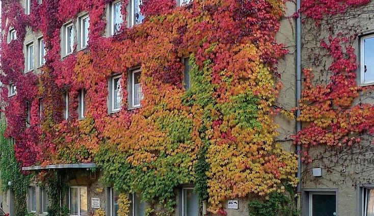 Syksyn sävyissä hehkuva raatihuonevilliviini osoittaa, että julkisivukasvillisuus voi olla myös värikästä