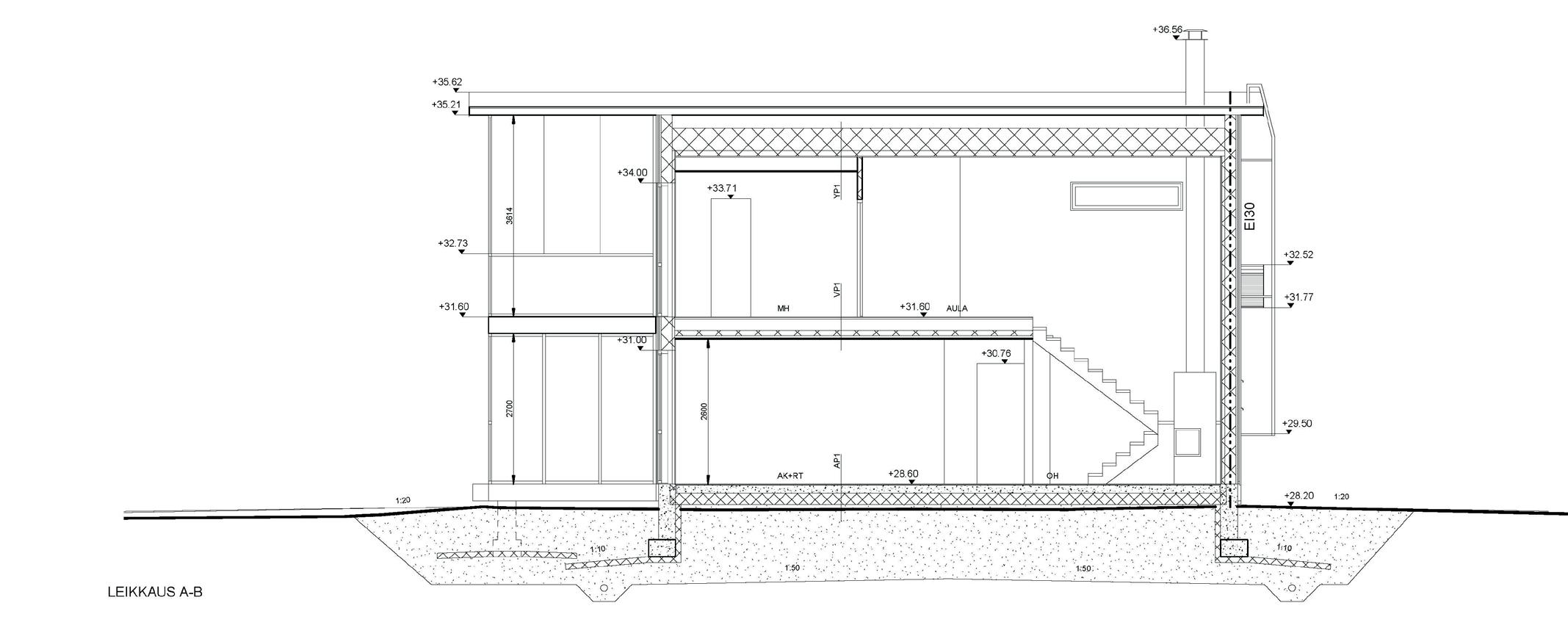 Rakennuksessa on massiivi CLT-runko ja julkisivumateriaaleina toimivat luonnonvalkoinen rappauslevy sekä patinoitu kuparipeltikatto. Kontrastia kokonaisuuteen tuo ovissa, ikkunoissa ja varusteissa käytetty tummanharmaa alumiini.