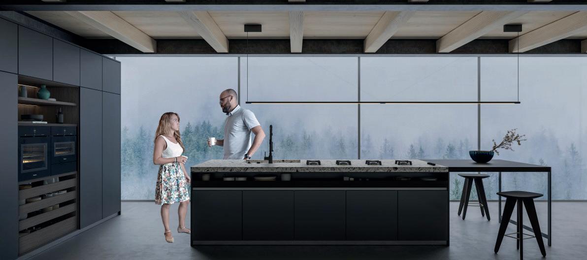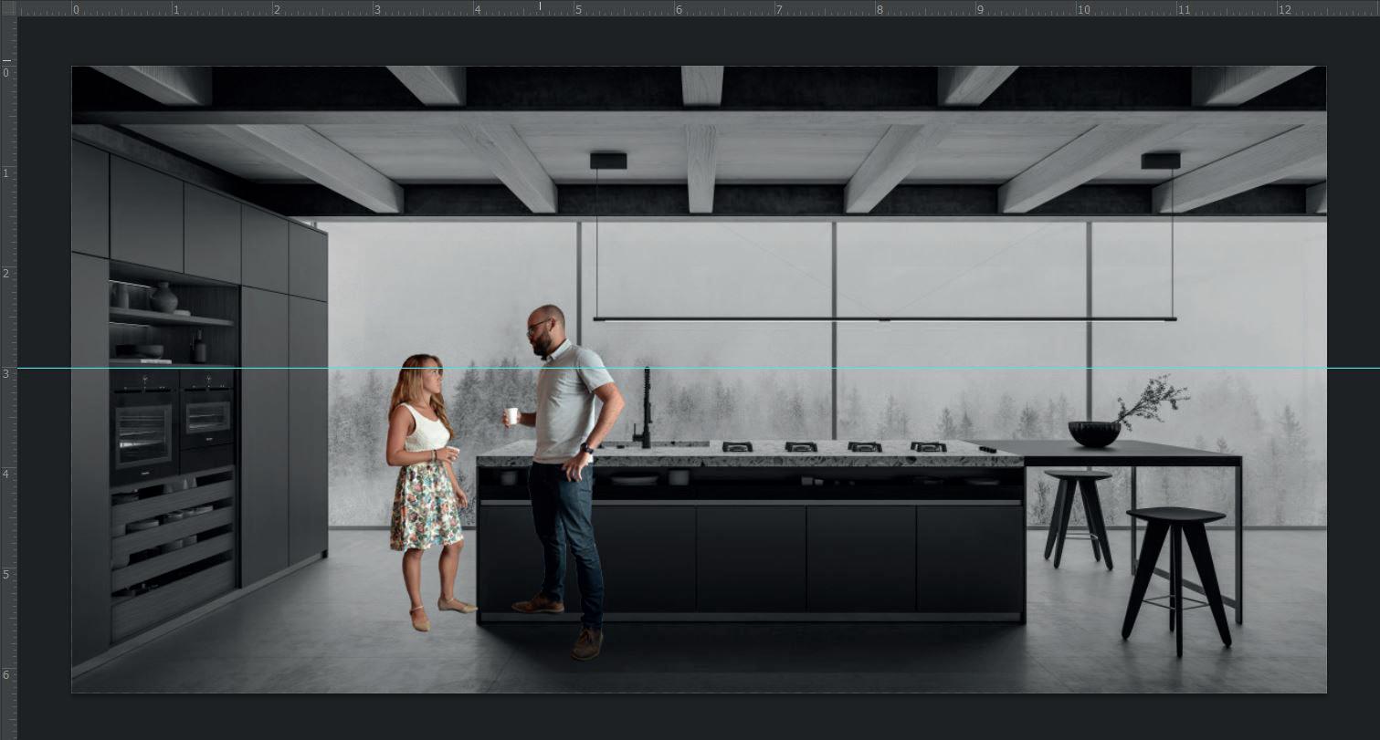 Tehtävän avulla haluttiin opettaa Cutout ihmisten käyttöä visualisoinneissa monipuolistamaan ja elävöittämään renderöintejä. Tehtävä aloitettiin määrittämällä horisonttiviiva Ruler (Ctrl+R)toimintoa hyödyntäen. Seuraavaksi Cutout ihmiset lisättiin kuvaan Ctrl+V käskyllä ja skaalattiin oikeaan suhteeseen. Seuraavaksi saarekkeesta tuli tehdä tasomaski Select and Mask työkalulla, jotta ihmiset saatiin sen taakse. Kuvasta rajattiin saareke ja sen edessä olevaa lattiaa. Kun ihmiset saatiin saarekken taakse siirtelemällä tasojen järjestystä, oli vuorossa vielä ihmisten asemoinnin ja värisävyjen hienosäätöä skaalauksen ja Camera Raw Filter työkalun avulla. Värisävyjen ollessa kunnossa, ihmisten varjostusta tuli säätää taustaan sopivaksi Dodge and Burn työkalua käyttäen.