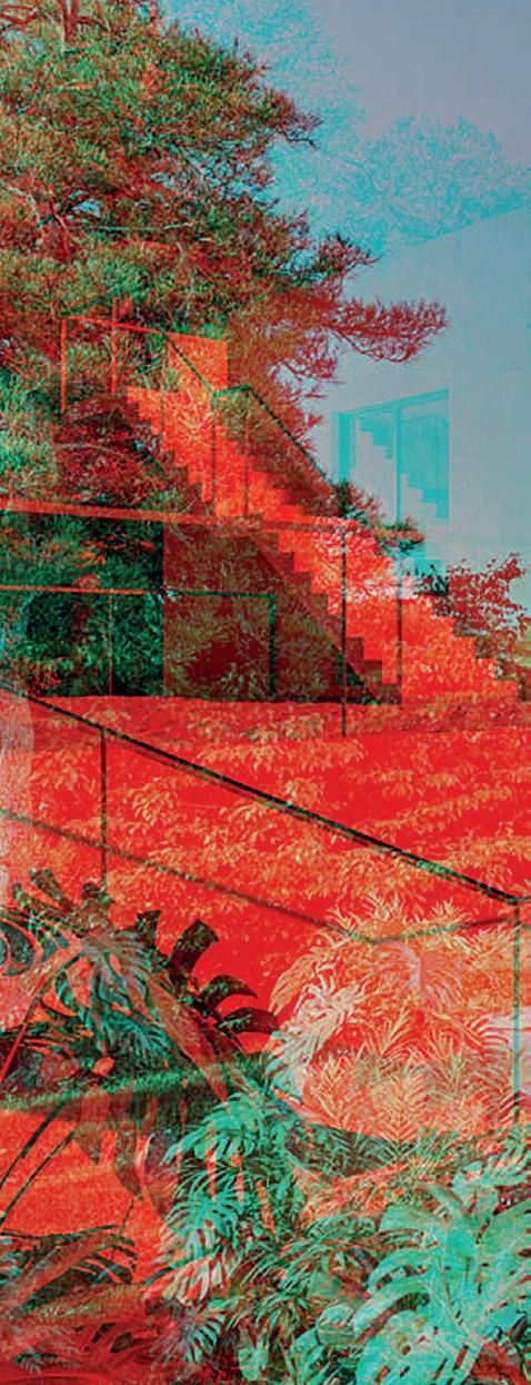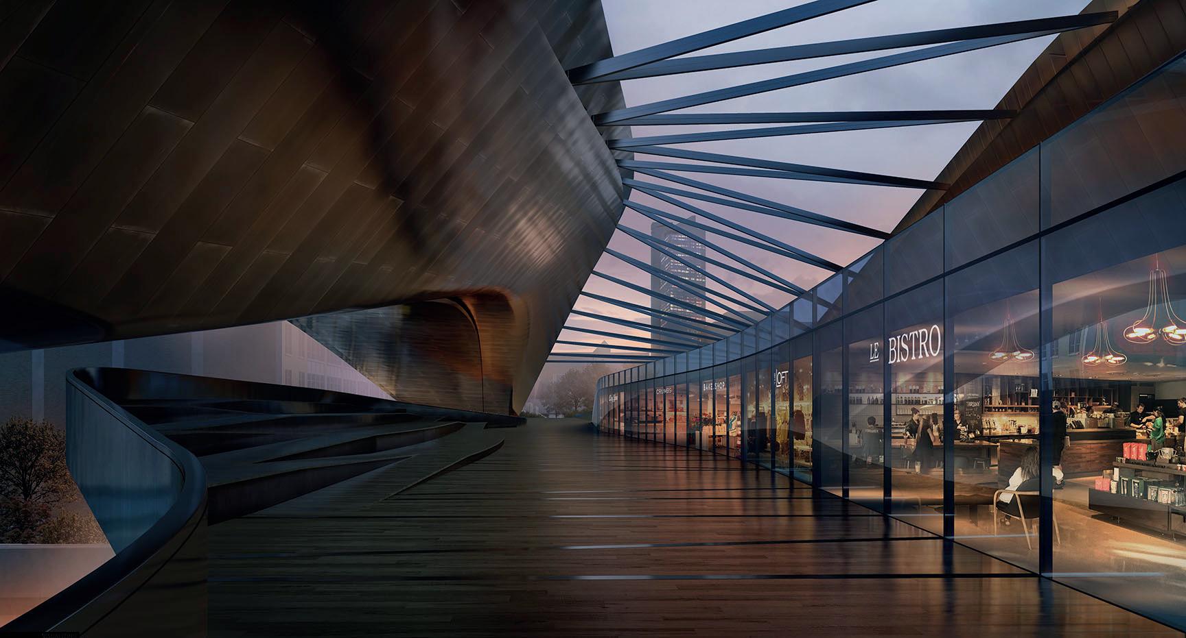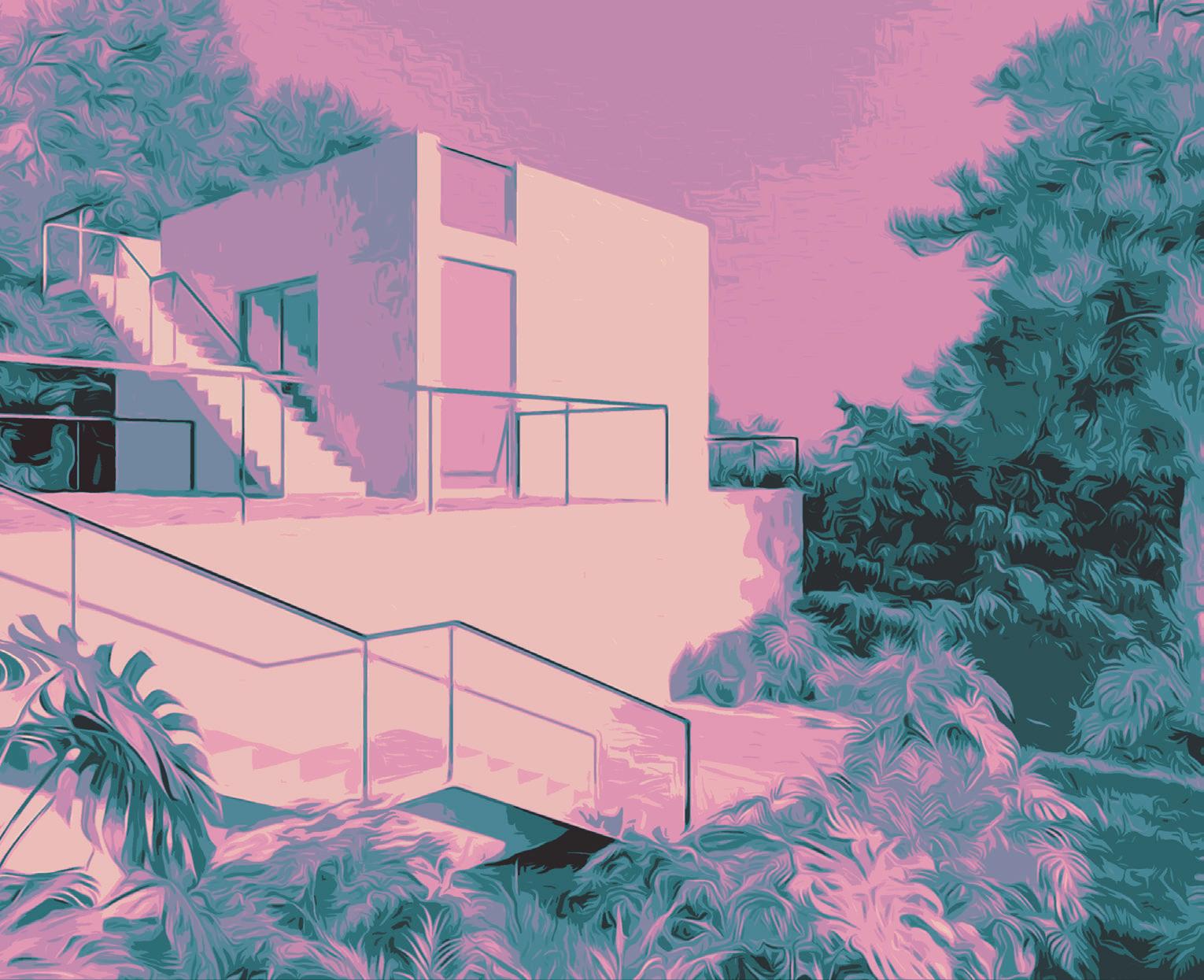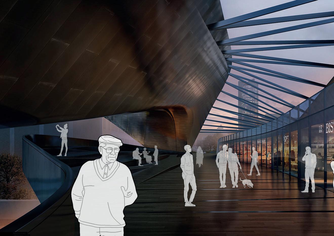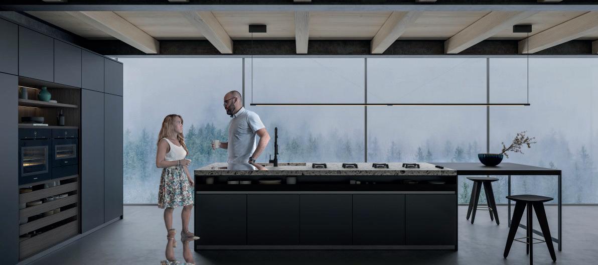 Tässä kuvassa lähdin samaan tapaan liikenteeseen Cutout ihmisten ja esineiden lisäämisellä. Pöydän ääreen sijoittuvat ihmiset piti saada istutettua tuoleihin eli osittain niiden taakse. Tuolien käsinojista täytyi tehdä uusi tasomaski, joten valitsin halutut osat Magic Wand ja Polygonal Lasso työkaluilla. Muodostin alueista uuden tason ja siirsin päälimmäiseksi tasokerroksella, jotta ihmiset saatiin niiden taakse. Ihmisten ja esineiden ollessa kohdillaan, yhtenäistin kuvaa muokkaamalla tasojen värisävyjä Camera Raw Filter suotimen avulla. Hienosäädin lisättyjä elementtejä ympäristöön sopivaksi varjostamalla ja valotamalla niitä Dodge and Burn työkalua apuna käyttäen. Lopuksi lisäsin Cutout kuville vielä varjot Drop Shadow toiminnon avulla, joka löytyy Layer Style valikosta. Kun varjon asetukset olivat sopivan pehmeät loin varjosta uuden tason Create Layer käskyllä, jonka jälkeen vääristin varjon suuntaa ympäristöön sopivaksi Distort säädön avulla. Lisäsin vielä muutamia varjoja jo kuvassa valmiina oleville elementeille valitsemalla halutun alueen, luomalla uuden tason ja lisäämällä varjon samalla tyylillä kuin edellä. Viimeistelyvaiheessa lamput olivat vielä irrallisia ympäristöönsä nähden, sillä niissä näkyi Twinmotionista aiheutunut taivaan heijastus. Kokeilin monia eri keinoja, mutta päädyin lopulta maalaamaan kupujen päälle Brush Tool siveltimellä, jotta värisävyt tasoittuisivat ja maisema katoaisi. Poimin eri värisävyjä valaisimista ja säädin siveötimen läpinäkyvyyttä, sivellintyypiksi valitsin lataamani Bash Brush siveltimen. Lopussa yhdistin kaikki elementit Ctrl+Shift+Alt+E käskyllä ja hienosäädin kuvan väritasapainoa vielä Camera Raw Filter suodinta apuna käyttäen.