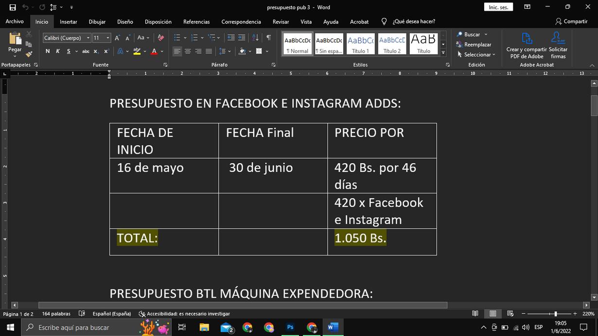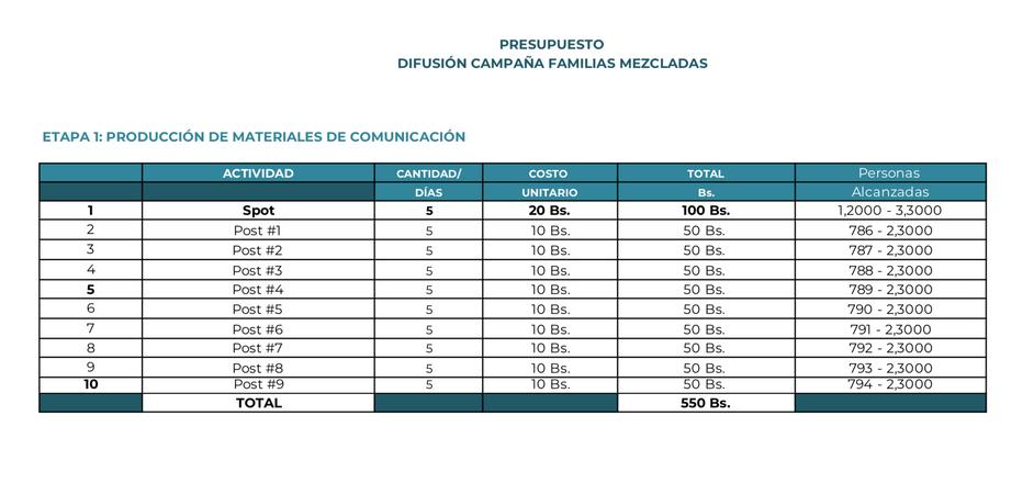 Presupuesto. Facebook E Instagram: Bs 3.600 Estaremos presentes en ambas redes sociales por un lapso de 36 días, para no saturar completamente al target esta publicidad aparecerá cada 3 o 2 dias y se tendrá un alcance de 767 2.2k personas. Tik Tok: Bs 4000 Lulu (Influencer boliviano Paceño) Bs 2.000 Carda (Influencer boliviano Paceño) Bs 2.000