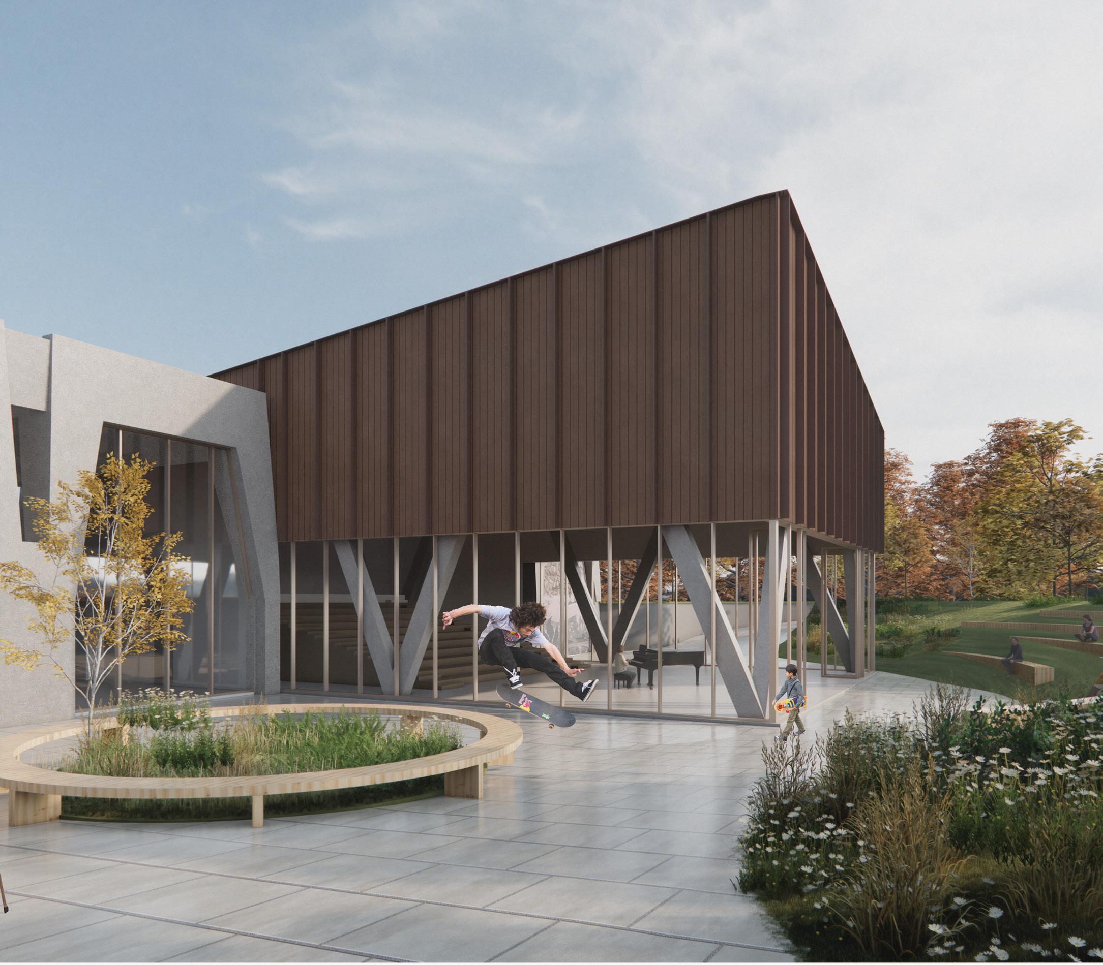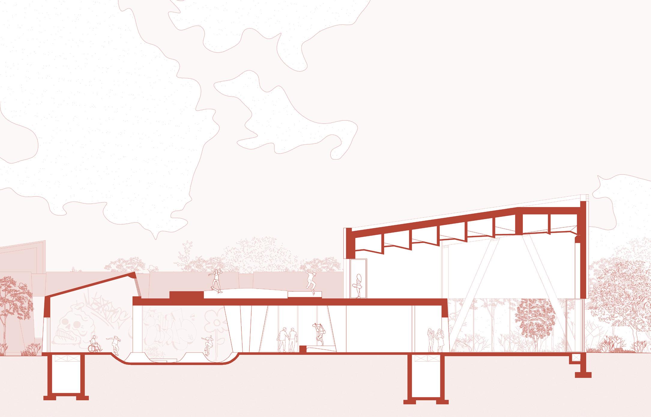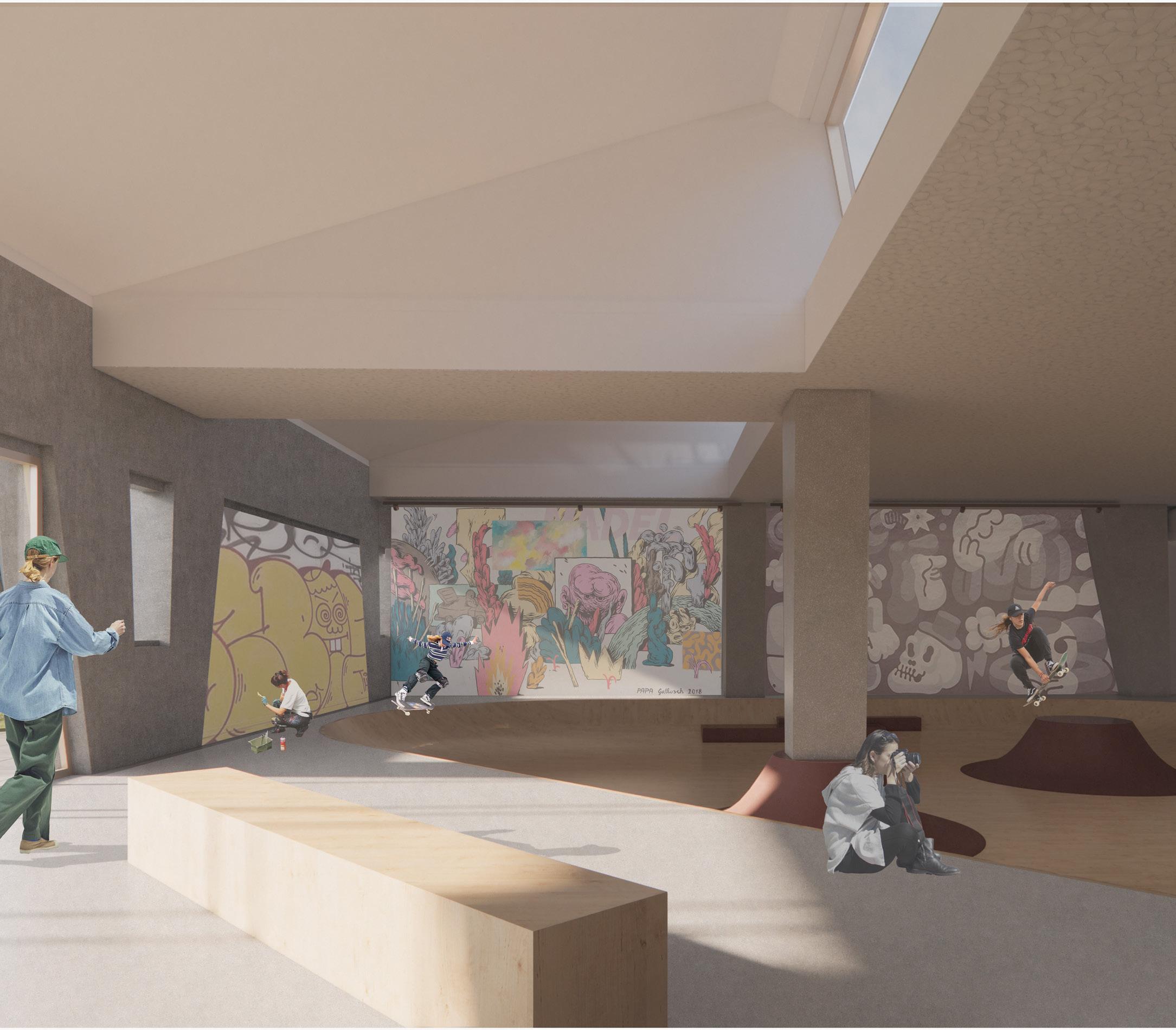 Le studio de performance s’étend vers la place publique de façon à clairement marquer l’entrée principale, tout en invitant les passants à se poser et observer ce qui se passe à l’intérieur de la salle. Puis, tant à l’intérieur qu’à l’extérieur, il est possible de skater et de s’imprégner de l’art urbain.