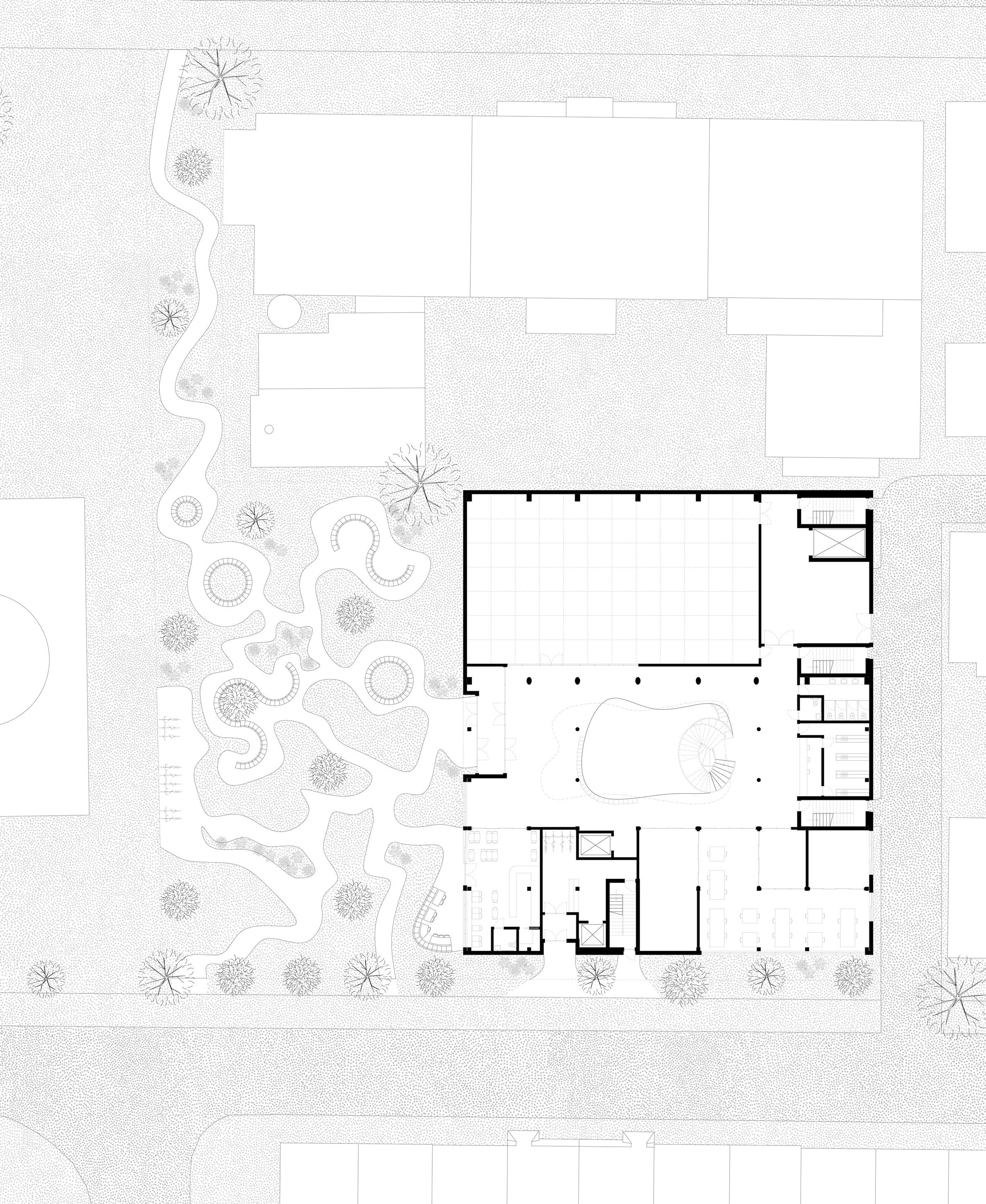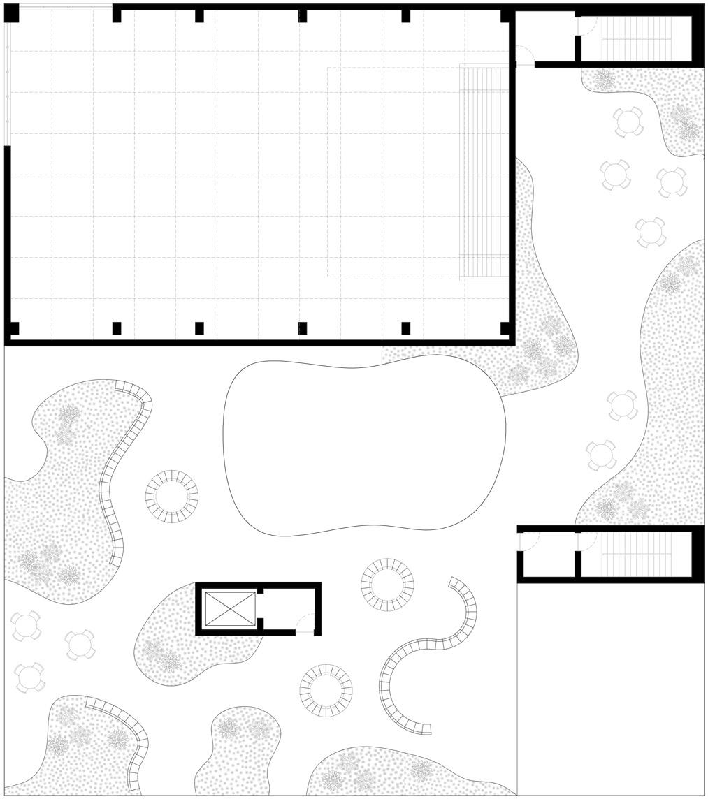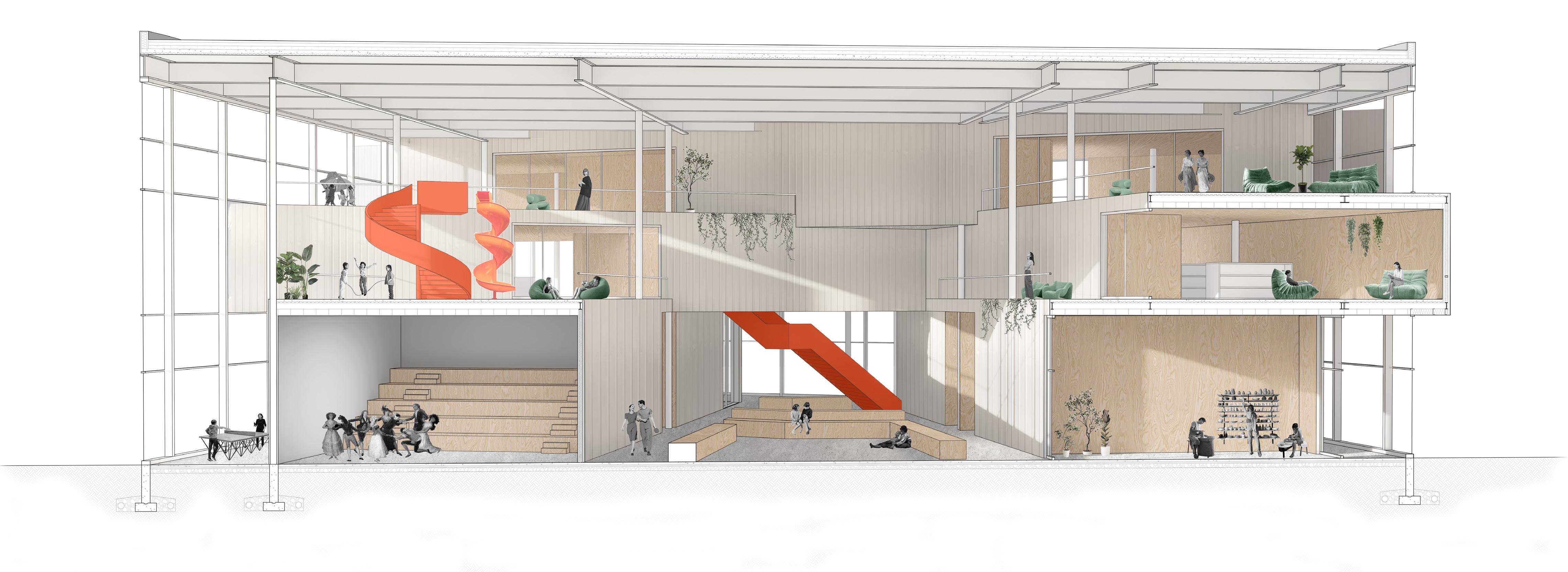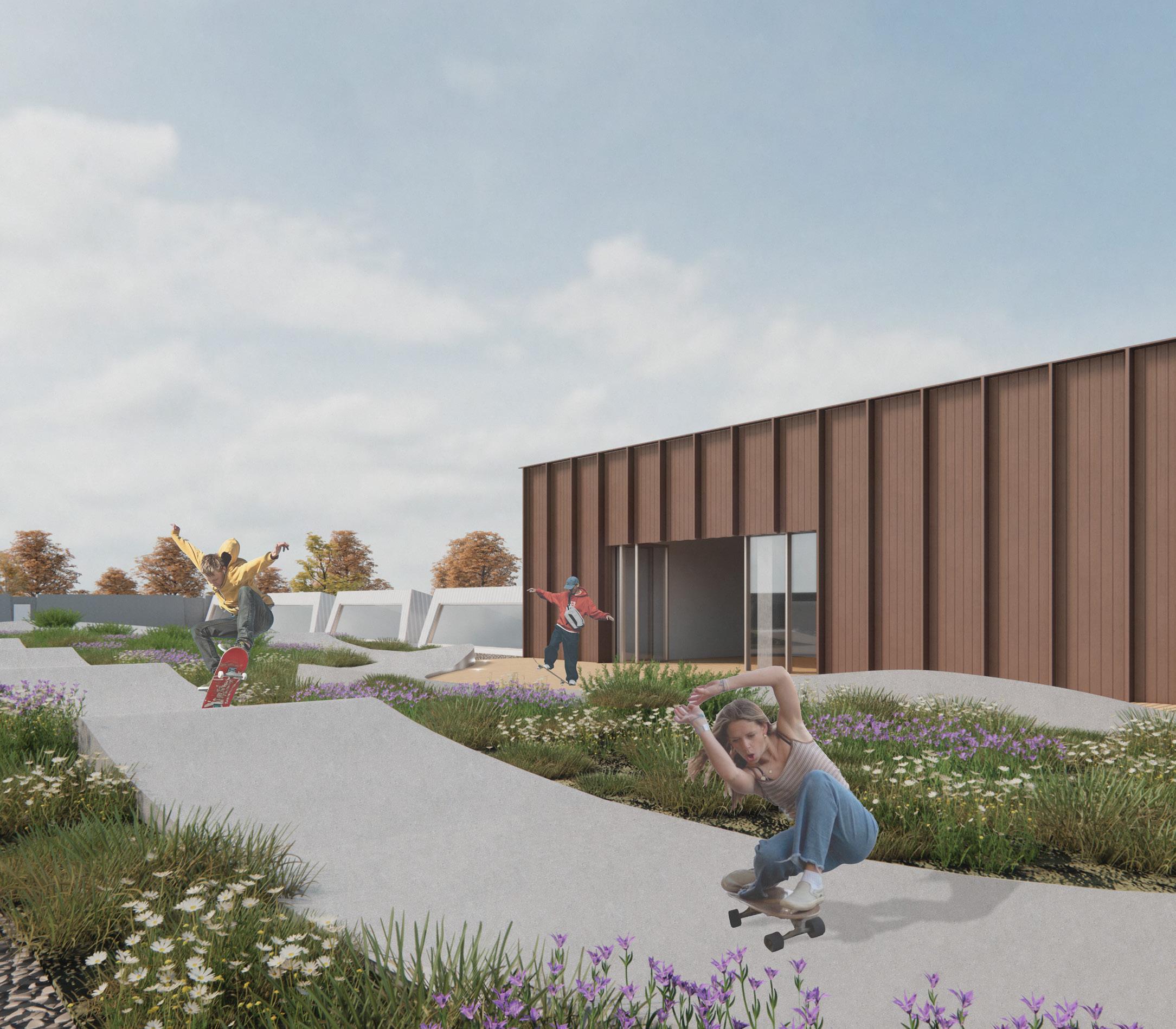 Le studio de performance s’étend vers la place publique de façon à clairement marquer l’entrée principale, tout en invitant les passants à se poser et observer ce qui se passe à l’intérieur de la salle. Puis, tant à l’intérieur qu’à l’extérieur, il est possible de skater et de s’imprégner de l’art urbain.