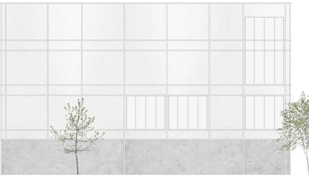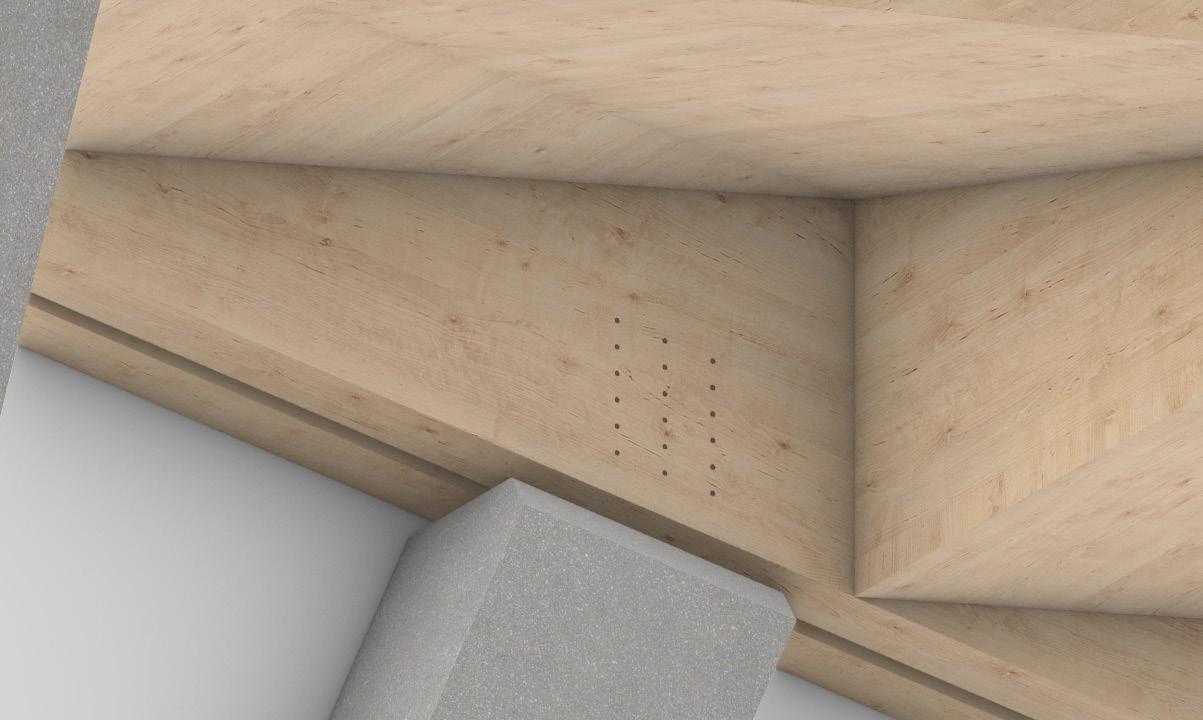 ces deux éléments se fait en délicatesse et en légèreté par un silence entre le béton et le bois. Une mince plaque d’acier, insérée au cœur des poutres de lamellé-collé, reprend les efforts de tension et permet la fixation de plusieurs goujons auto-perceurs, renforçant ainsi la finesse de la connexion.