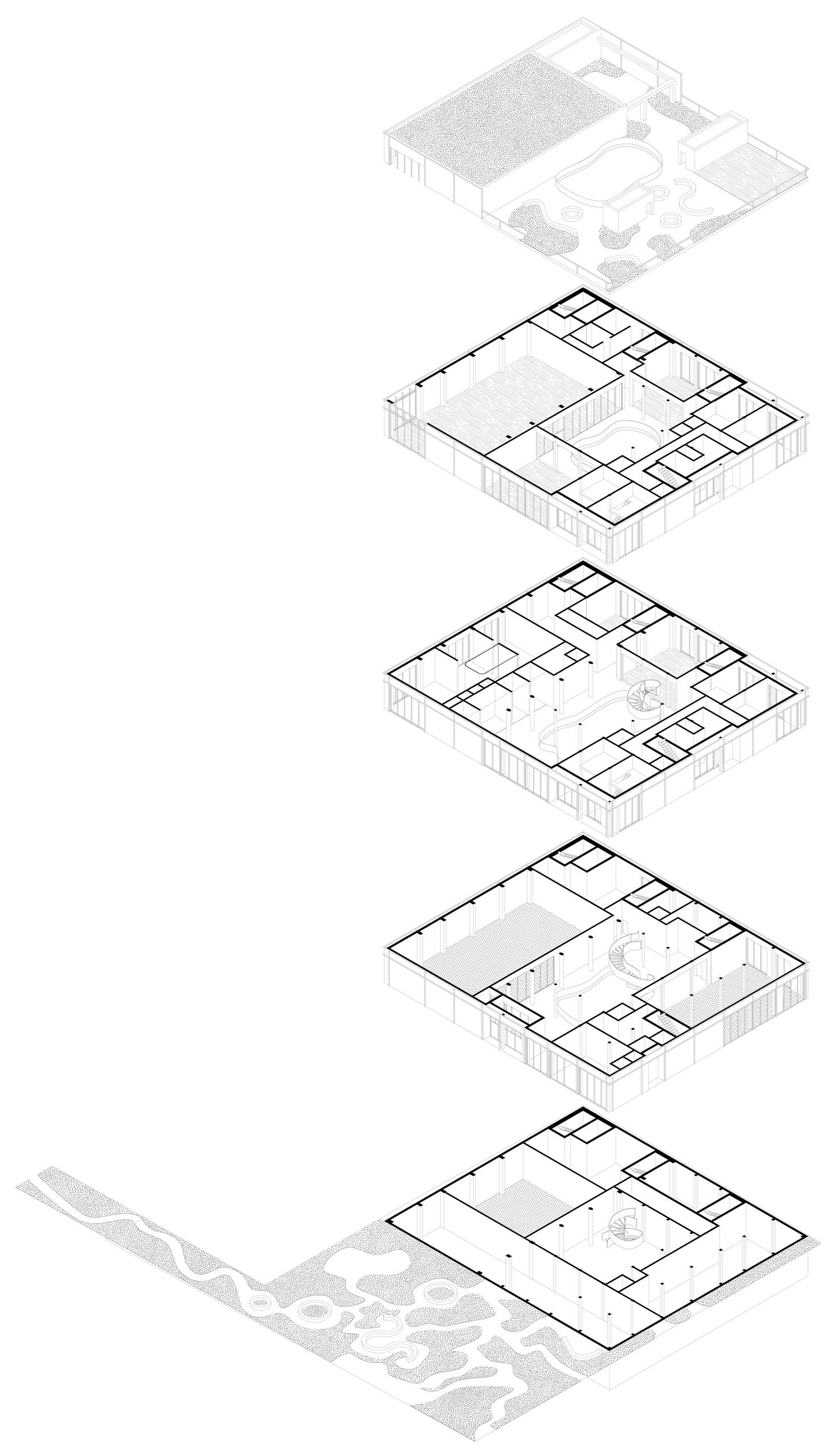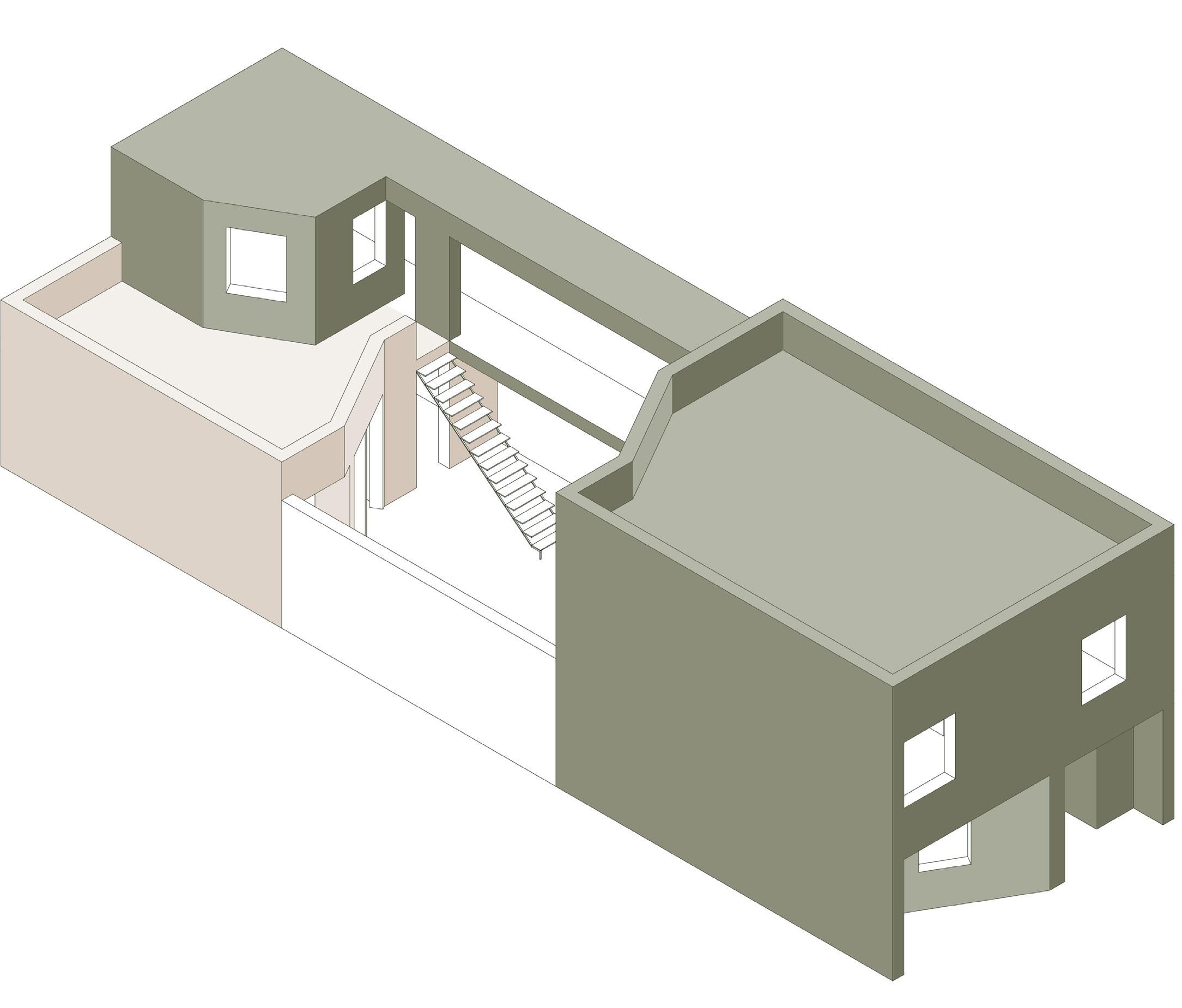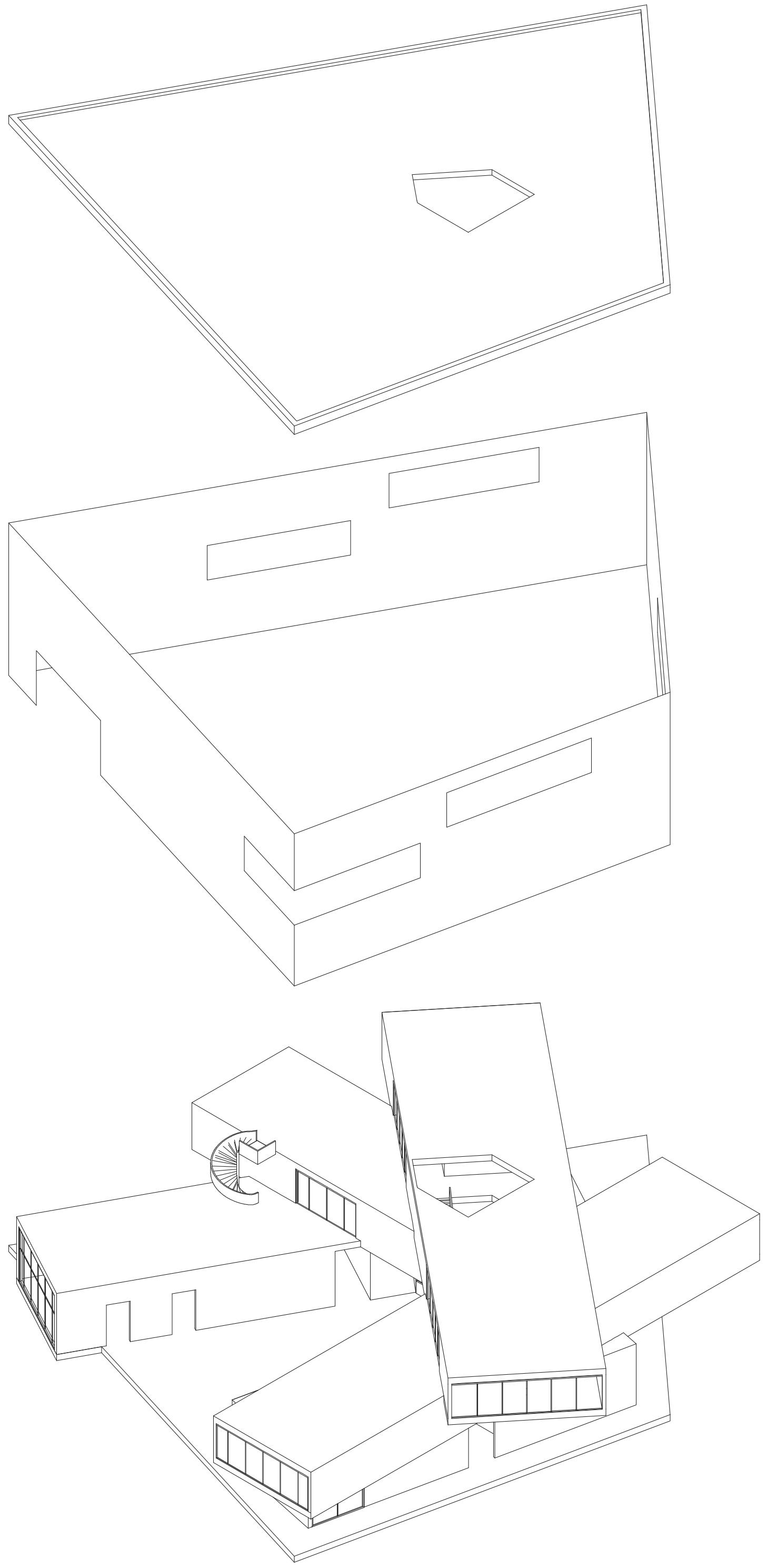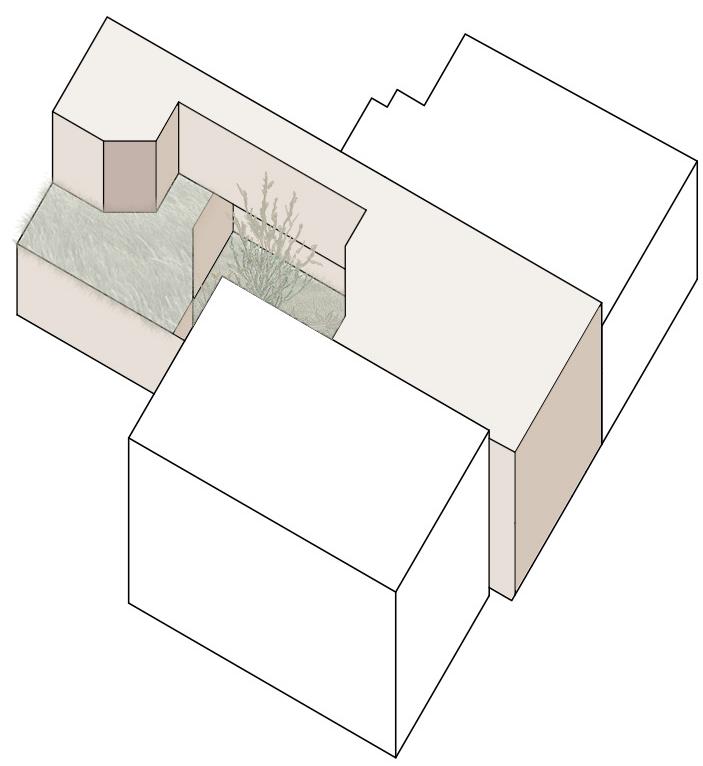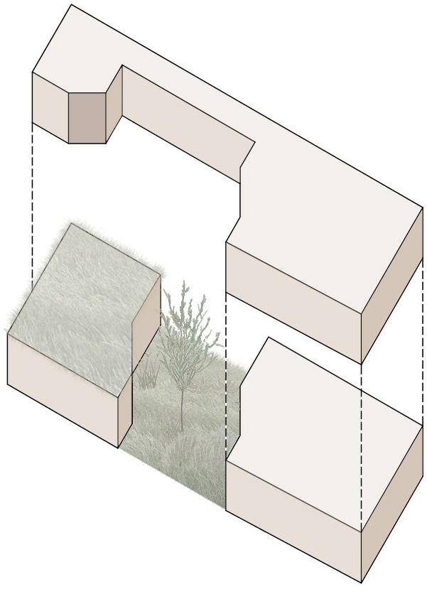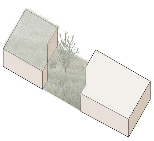 Le volume, initialement rectangulaire et plein, est fissuré afin de séparer les deux habitations. Puis, la faille est pansée par un grand espace vert, rassembleur, qui agit en tant que lien entre les deux demeures.
